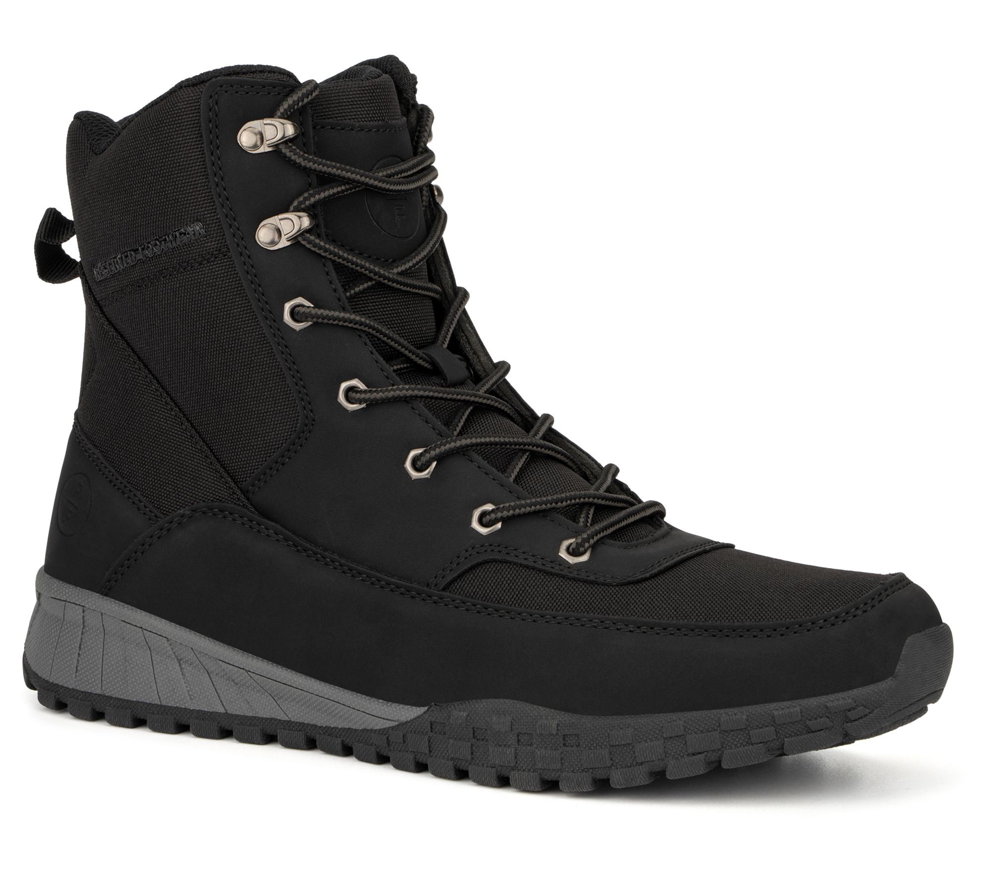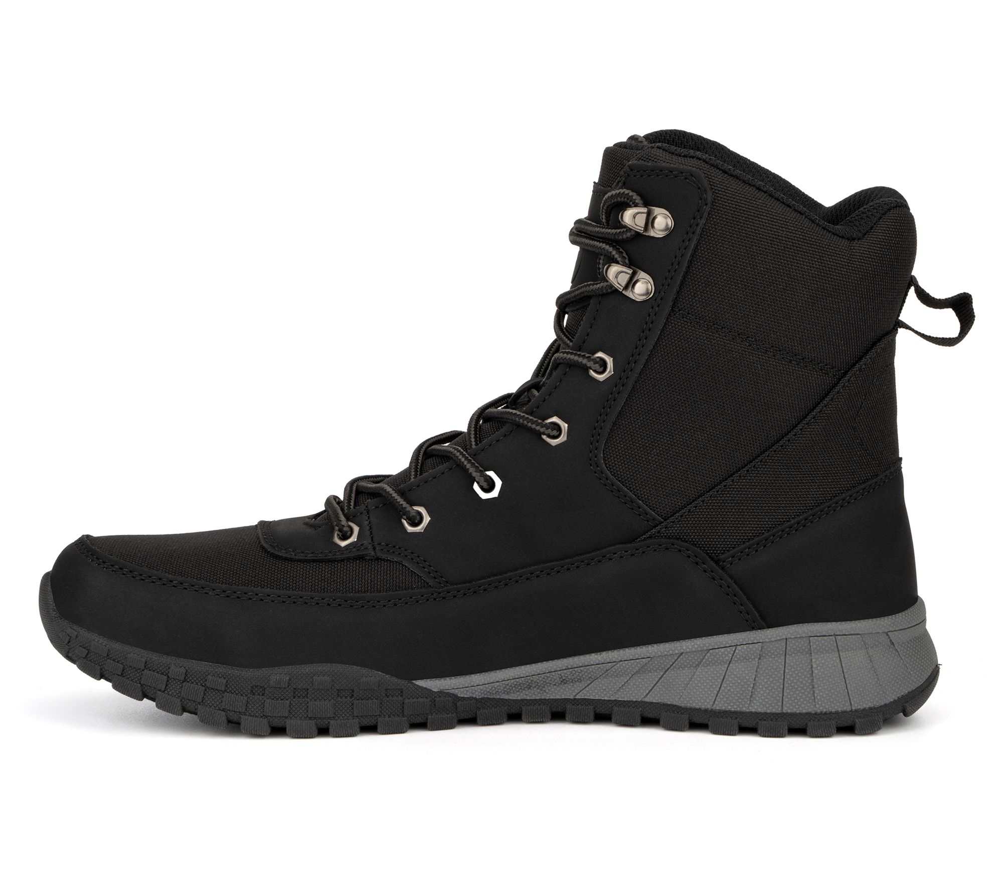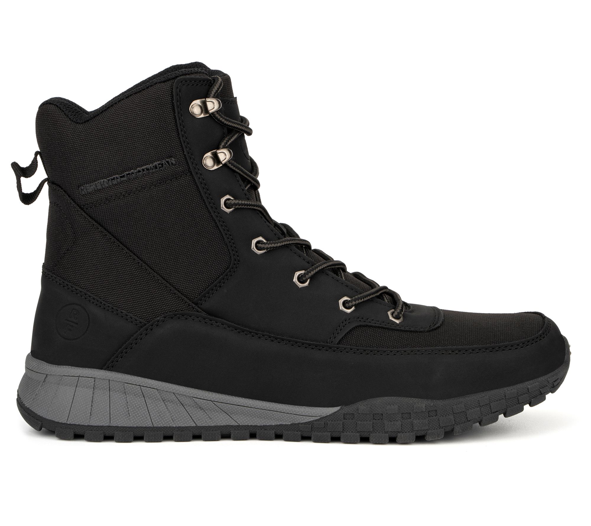 Lace-up style, grommets, top hook detail, padded collar, back pull loop, rounded toe