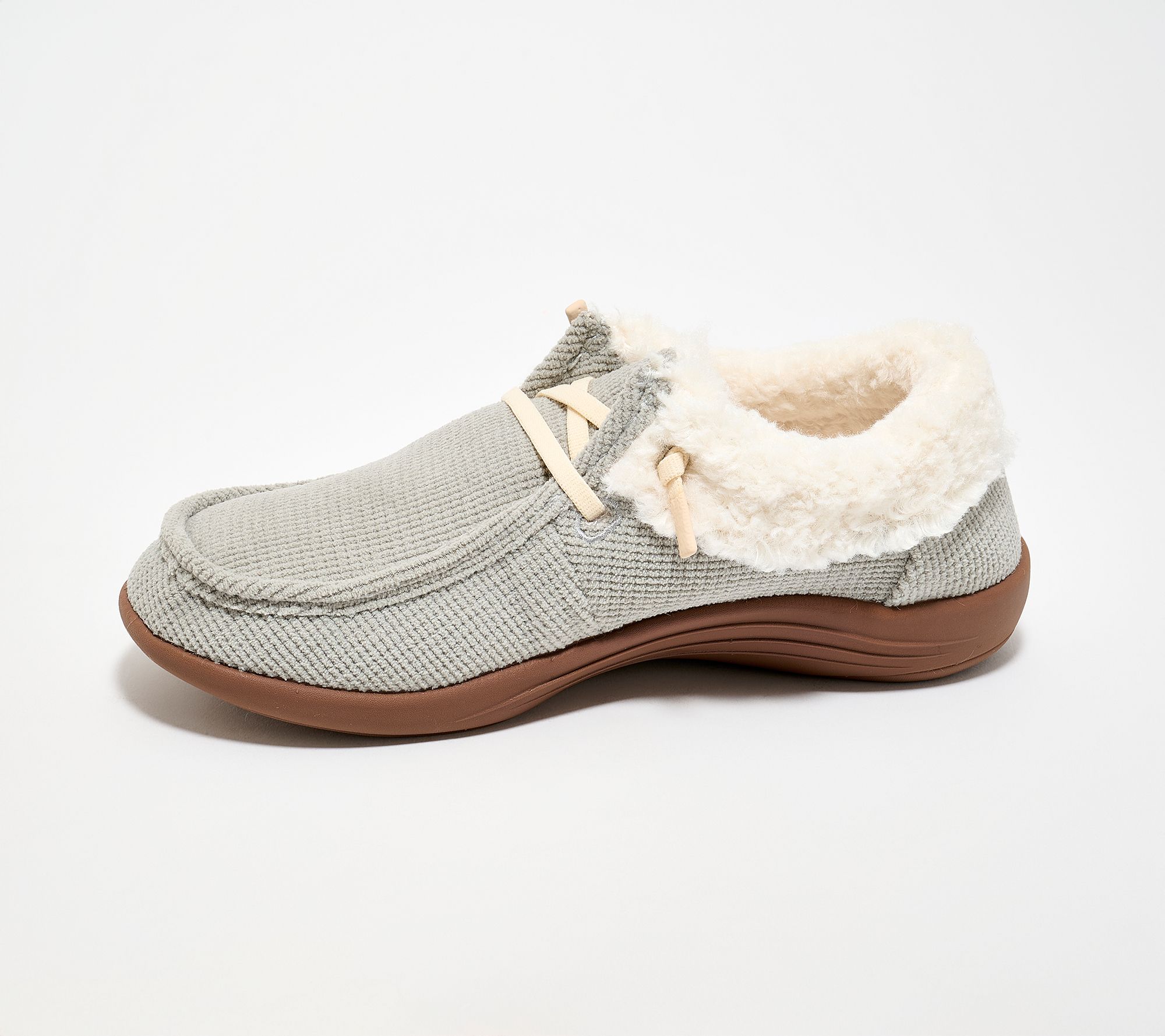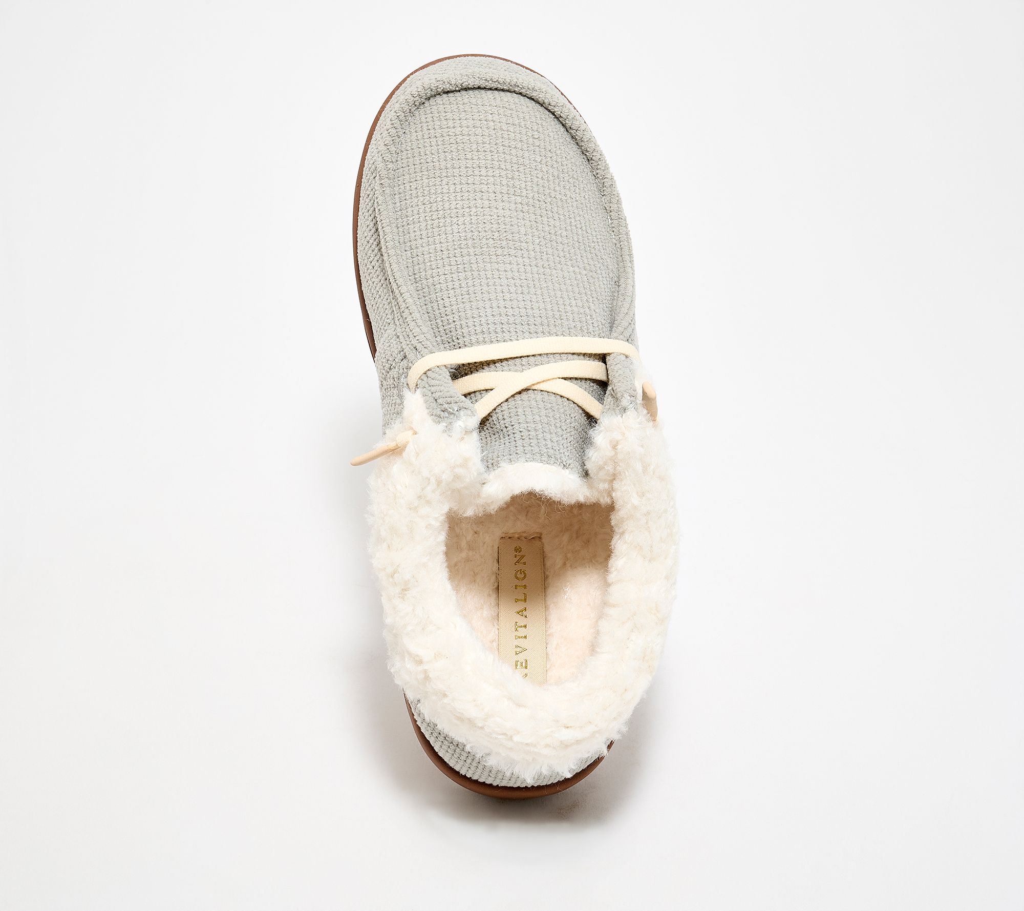 Whether you're shuffling through a slow morning or settling in after a long day, these wallaby slippers wrap your feet in coziness with soft chenille ribbed textile and plush faux fur lining. The stretch lace makes slipping them on a breeze, while the CLASSIC outsole lends orthotic and metatarsal support for ongoing comfort. From Revitalign™.