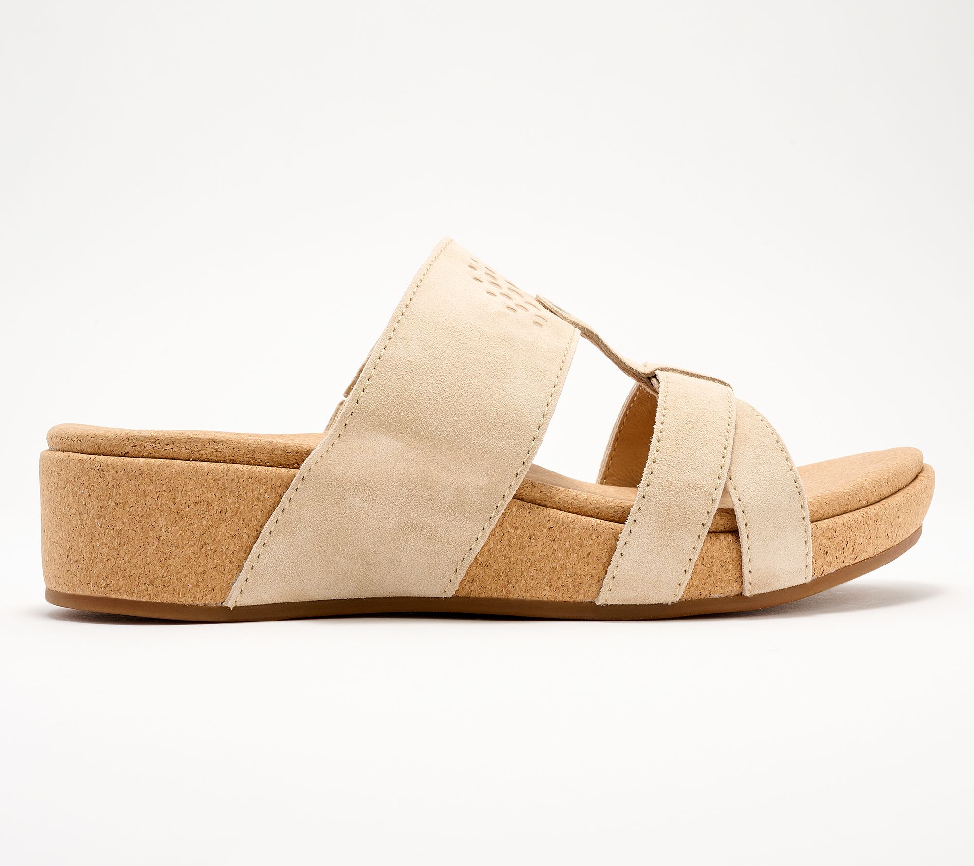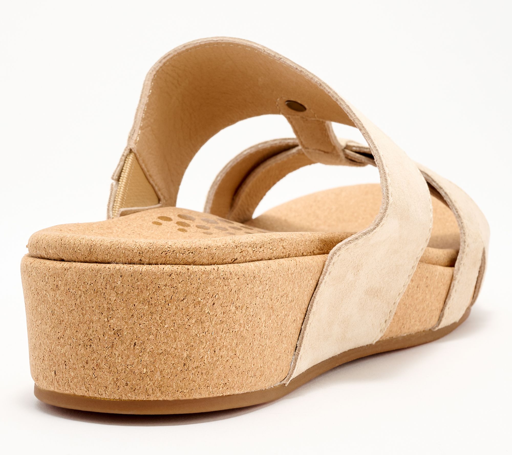 Leather straps paired with soft suede across the toes, medial stretch gore, cork-wrapped wedge