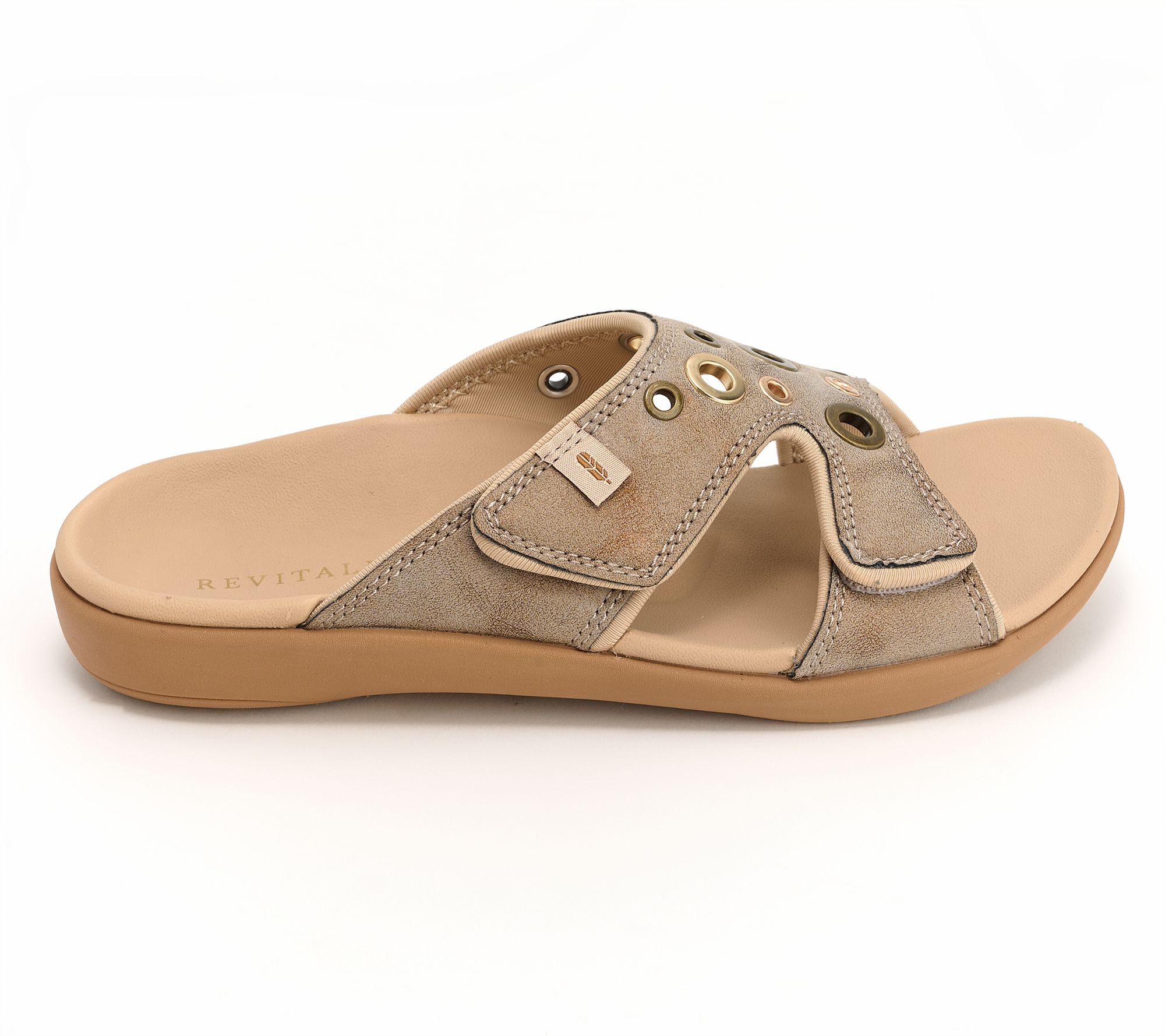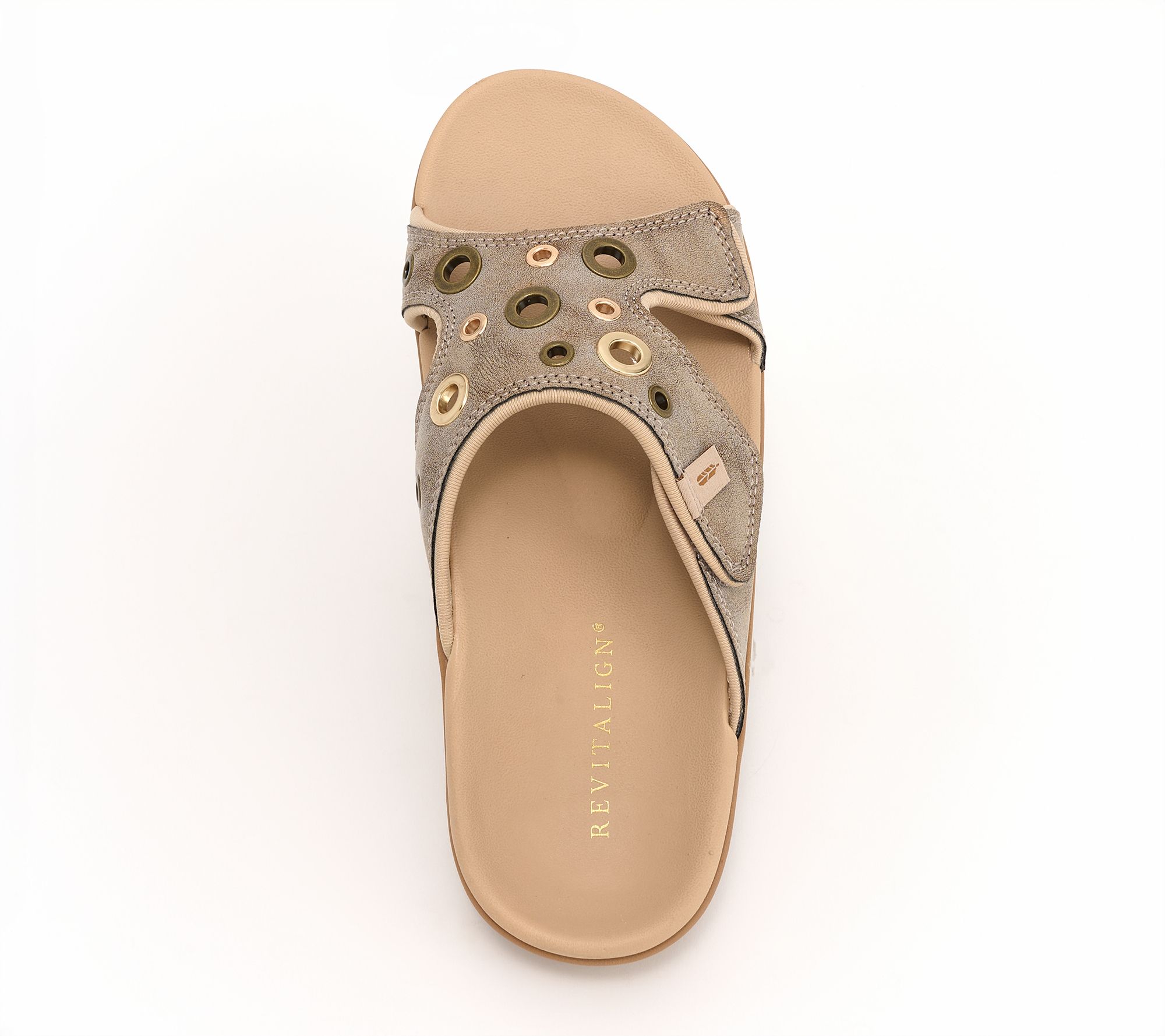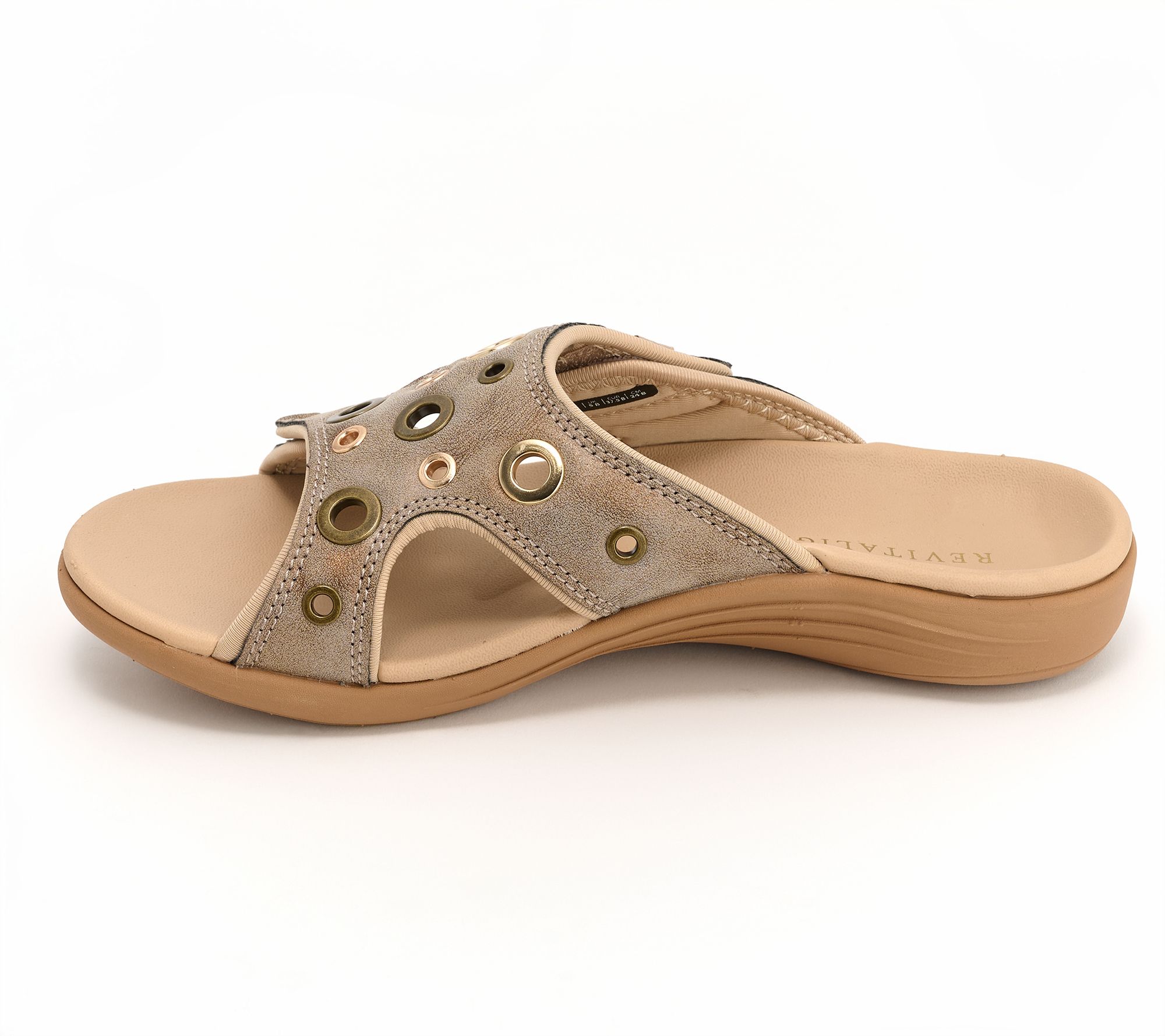 Not only are these shimmer slide sandals a stylish choice (did you see those studded eyelets?), but they're good to your feet with orthotic and metatarsal support. Pair them with everything from shorts to skirts for a look you'll love. From Revitalign&TM;.