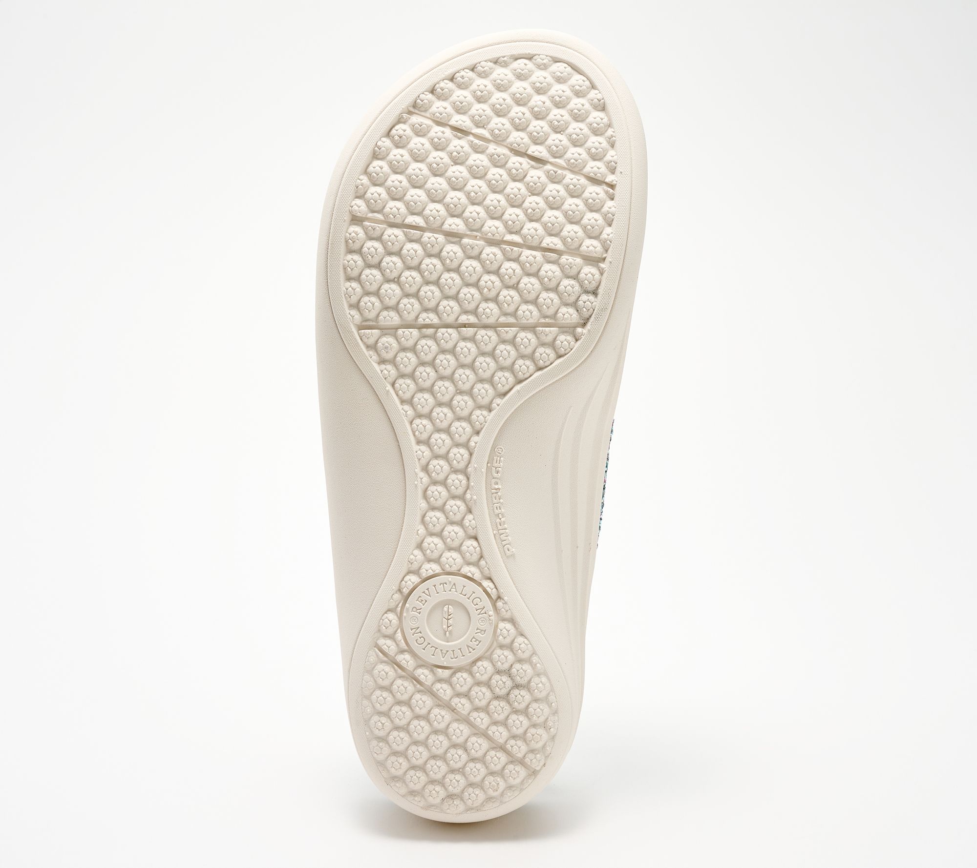 Say farewell to ordinary flip-flops. The Yumi Glitter from Revitalign brings better support (and sparkly bling!) from sunrise to sunset with its orthotic and metatarsal support. When warm weather calls, answer with a playful touch of shimmer that instantly brightens your (out)look. From Revitalign™.
