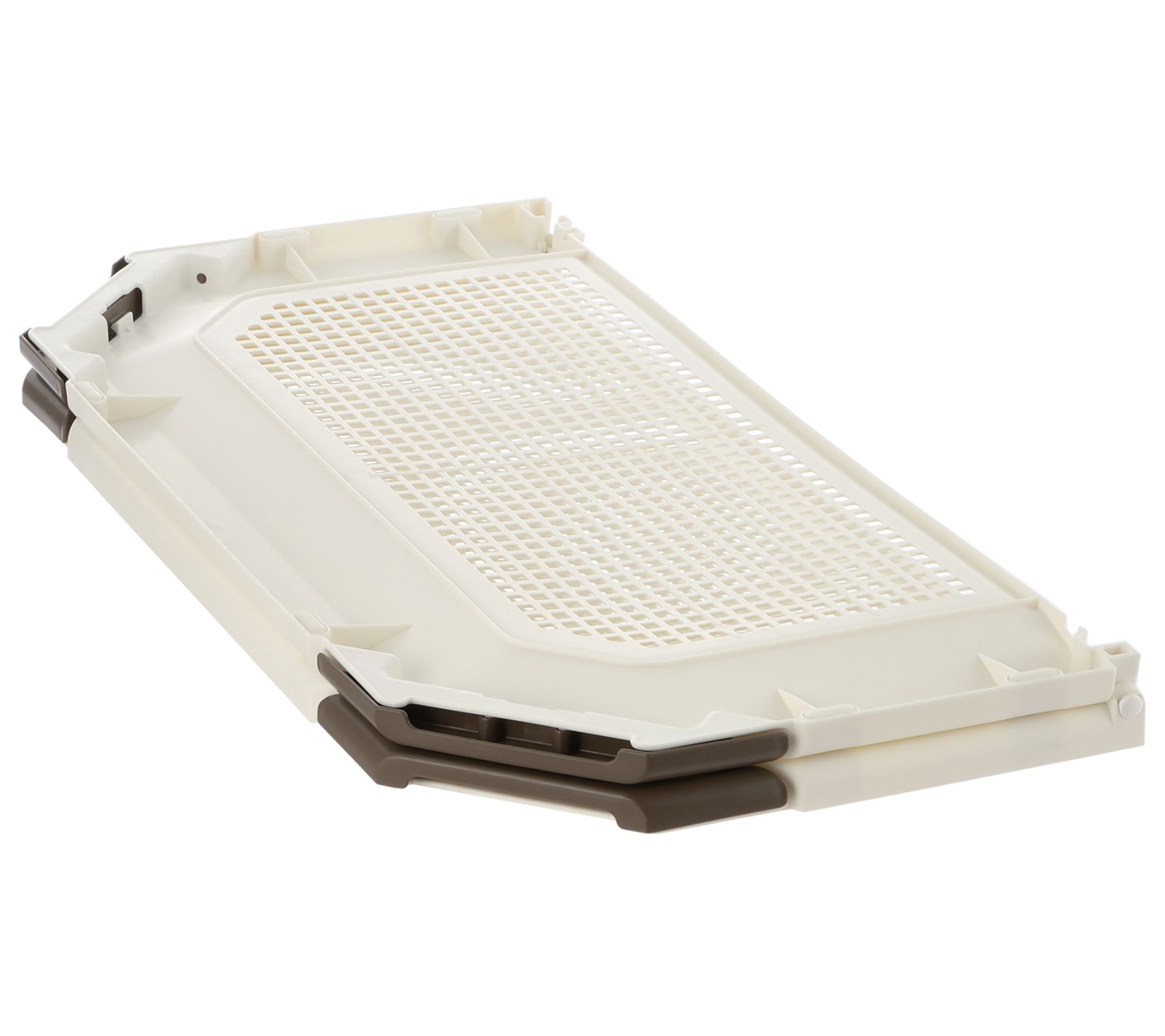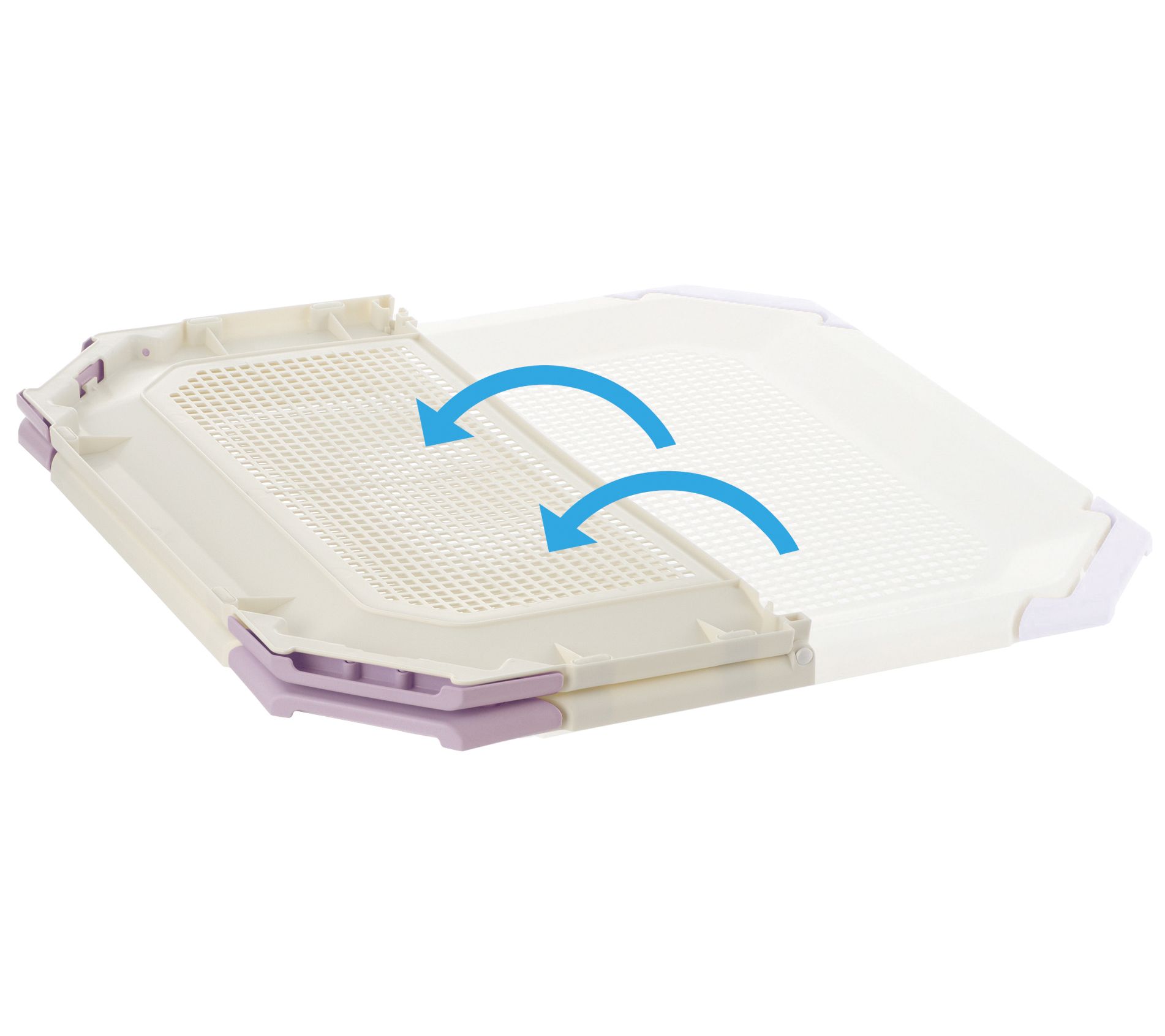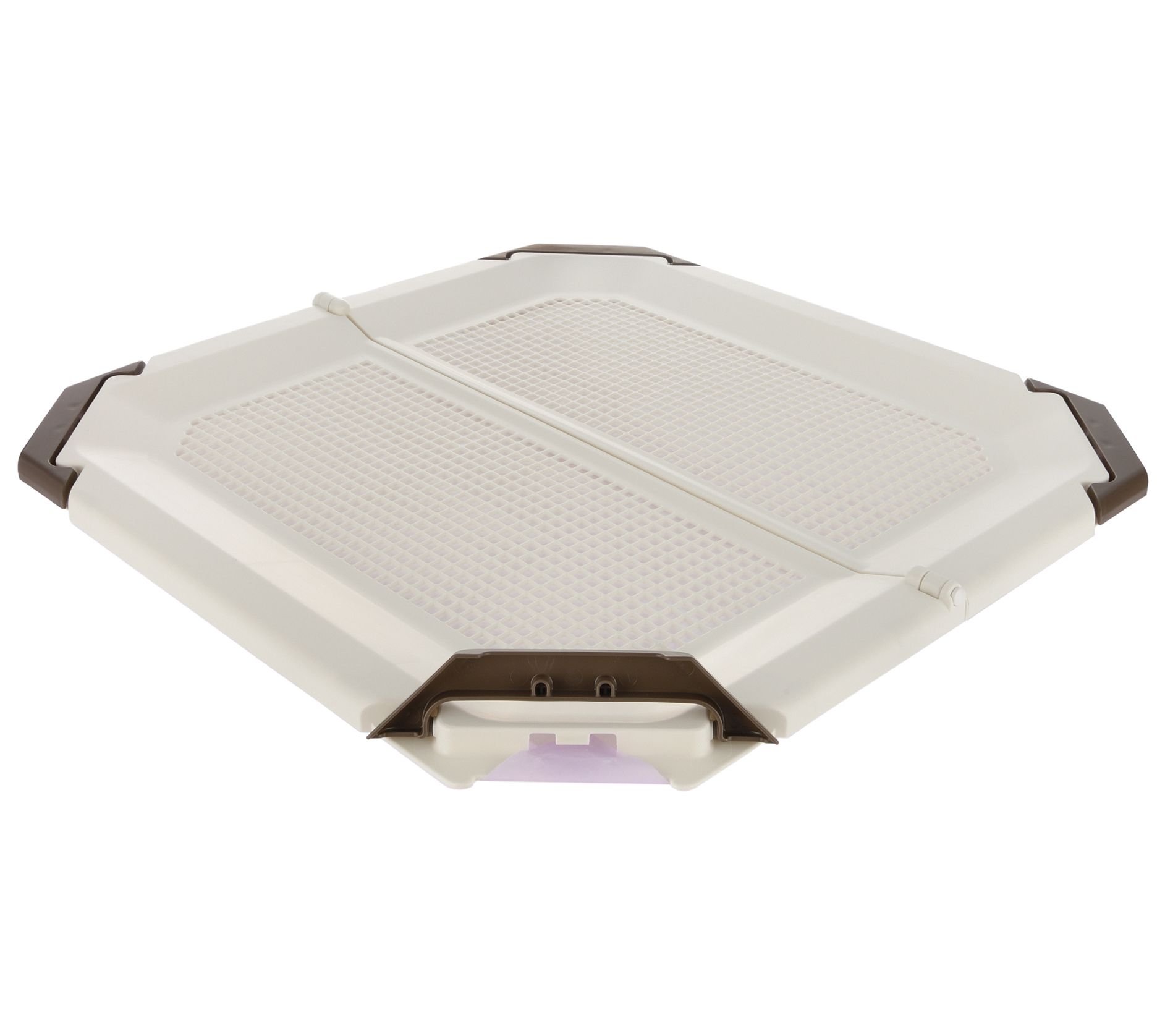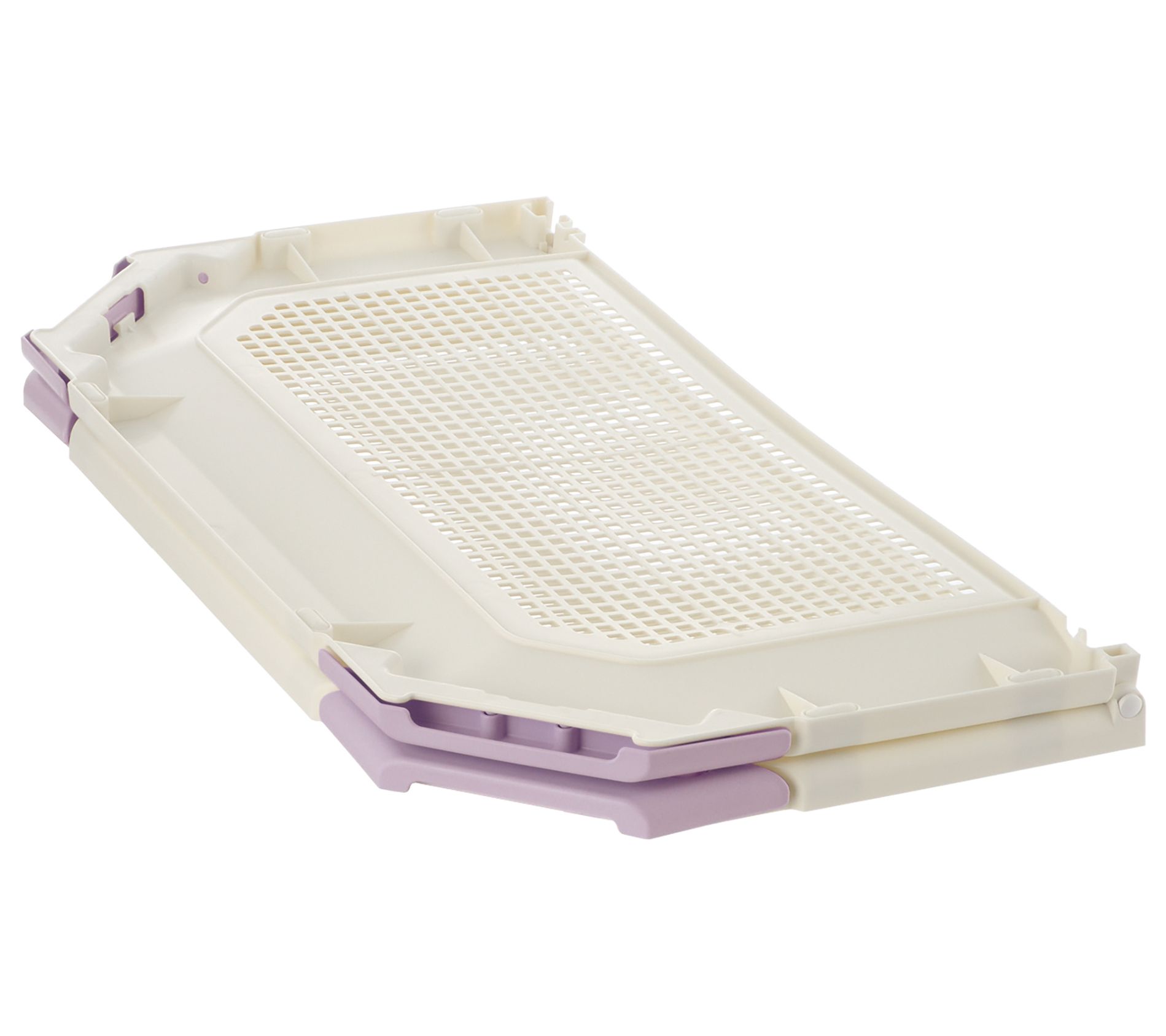 Make potty training your furry friend a breeze with the PAW TRAX mesh potty holder training tray. Its innovative design ensures the potty pad stays in place, preventing it from folding or crumpling, thanks to the corner latches that lock securely. Plus, the durable plastic construction is easy to clean, and its foldable design offers convenient storage and portability. From Richell.
