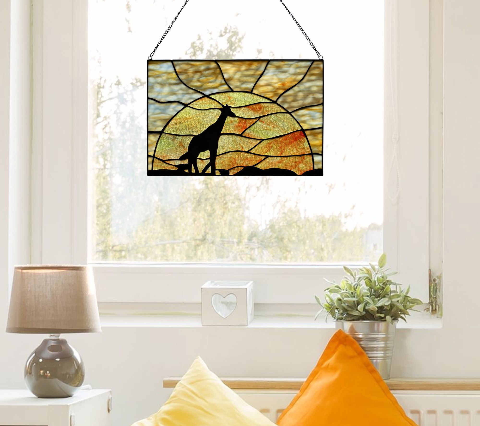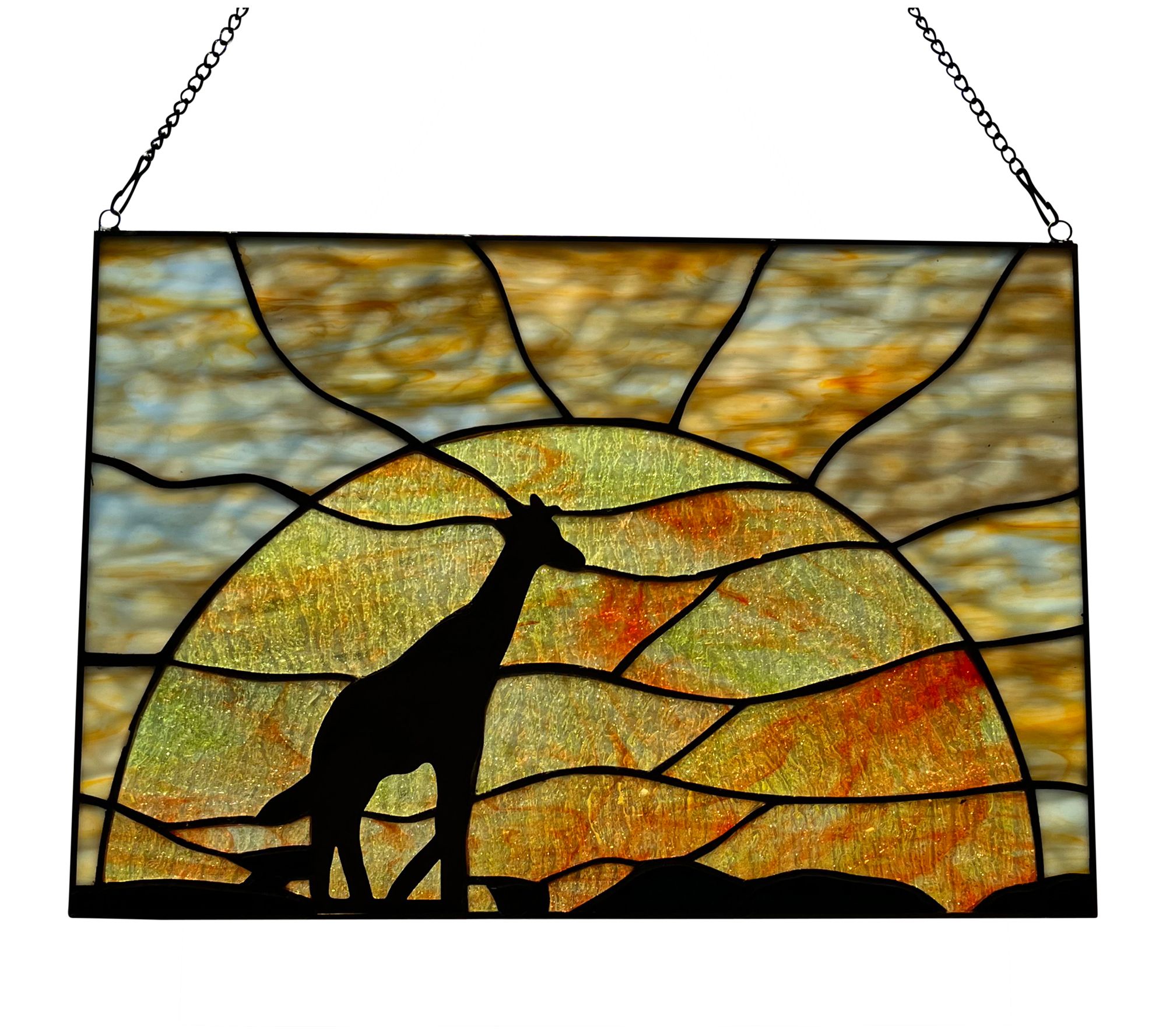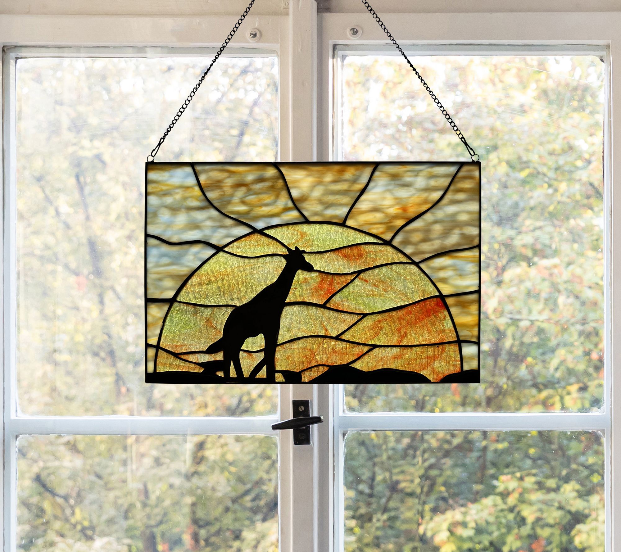 Crafted with orange, blue, and yellow textured glass and black metal overlay, this window panel features a lone giraffe crossing the plains against a deepening sunset. From River of Goods.