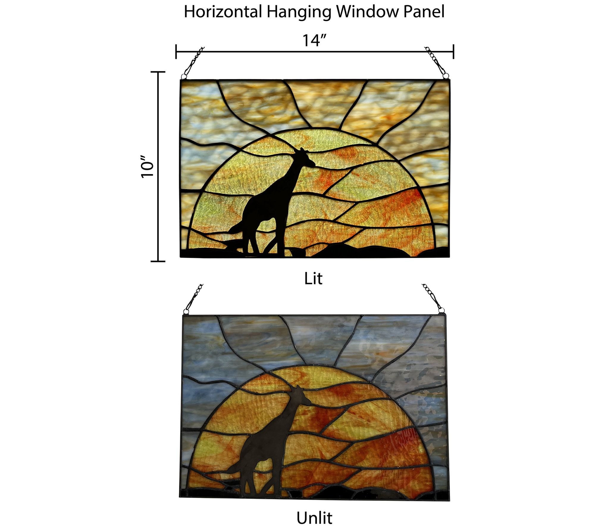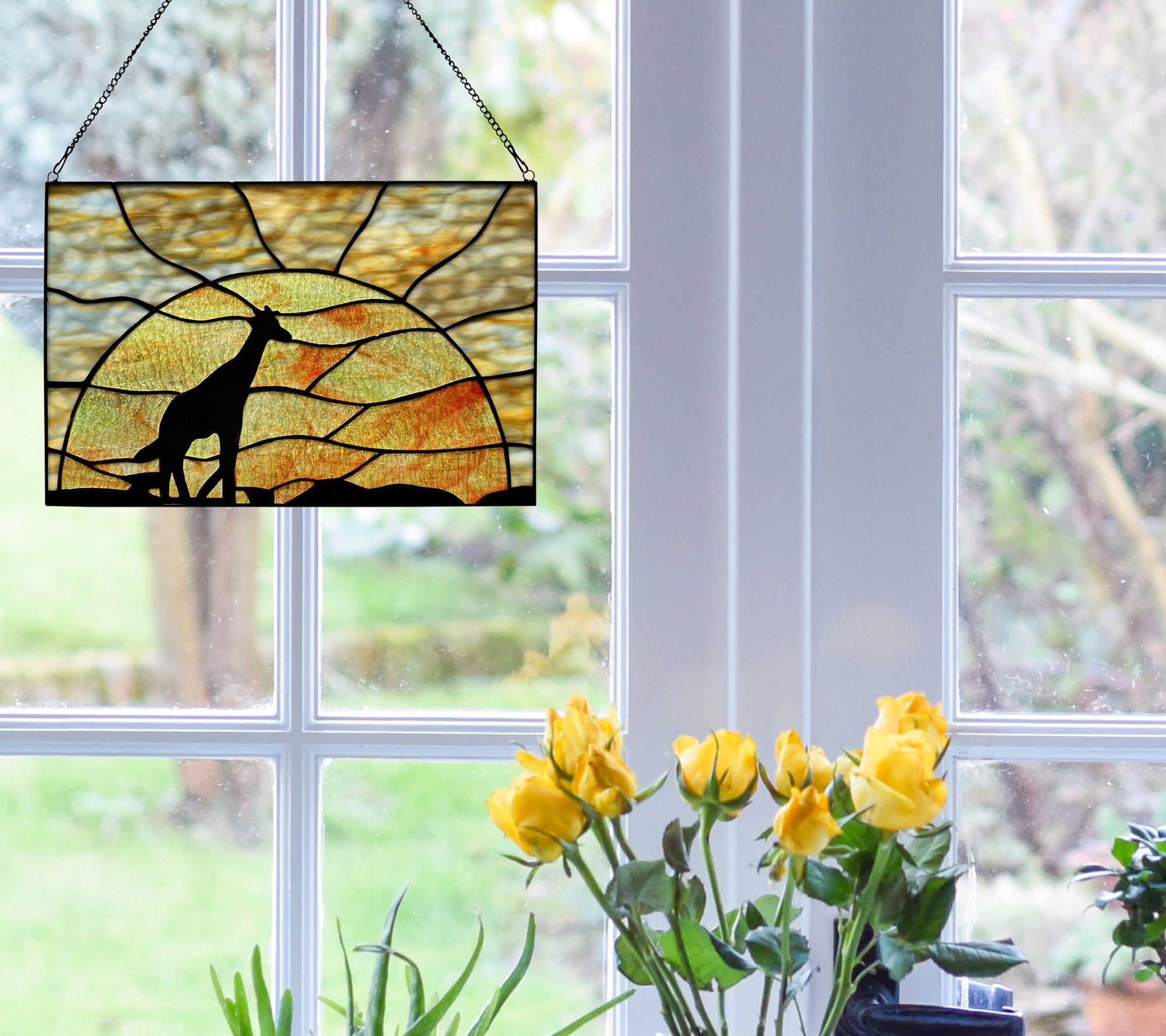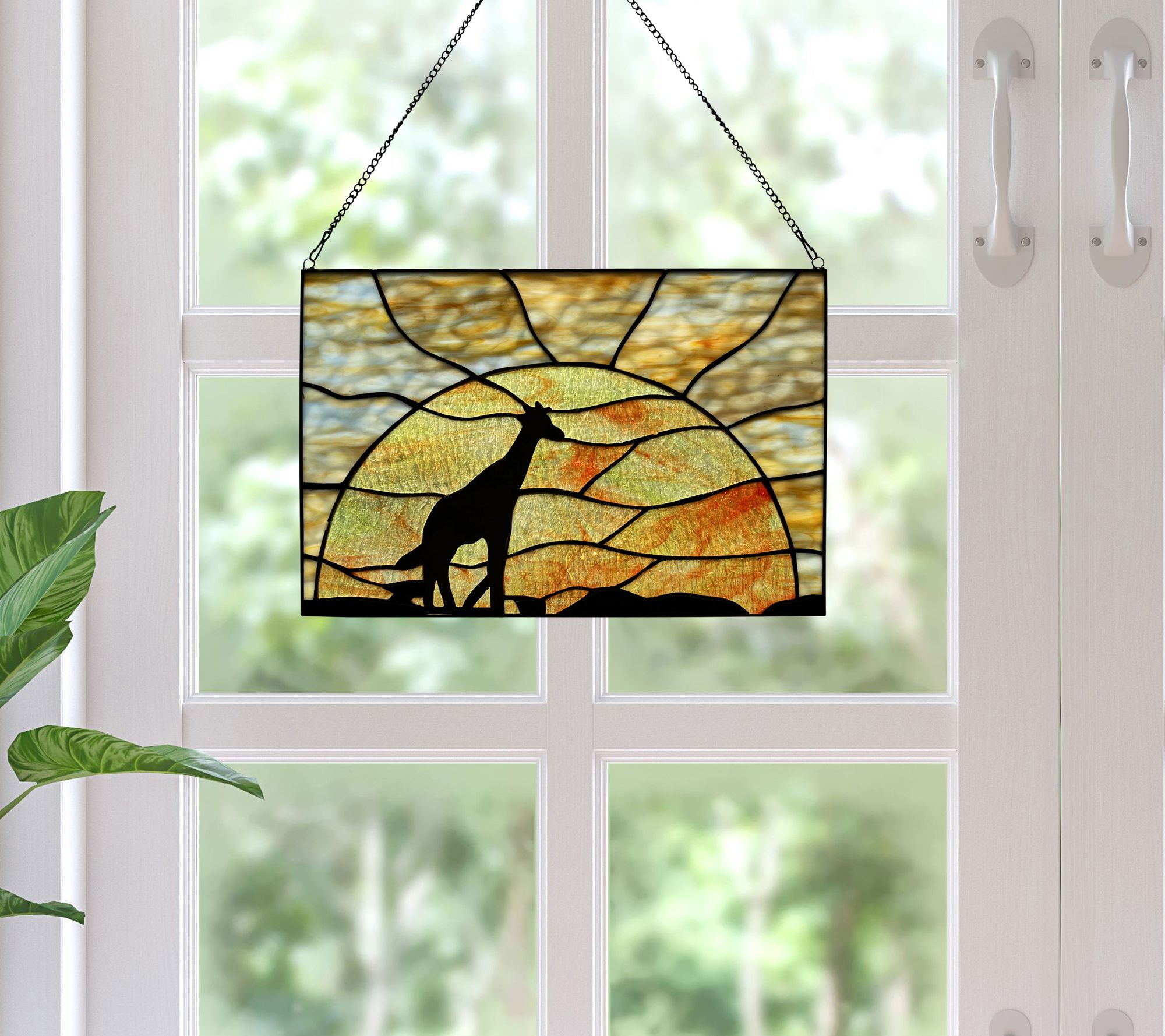 Crafted with orange, blue, and yellow textured glass and black metal overlay, this window panel features a lone giraffe crossing the plains against a deepening sunset. From River of Goods.