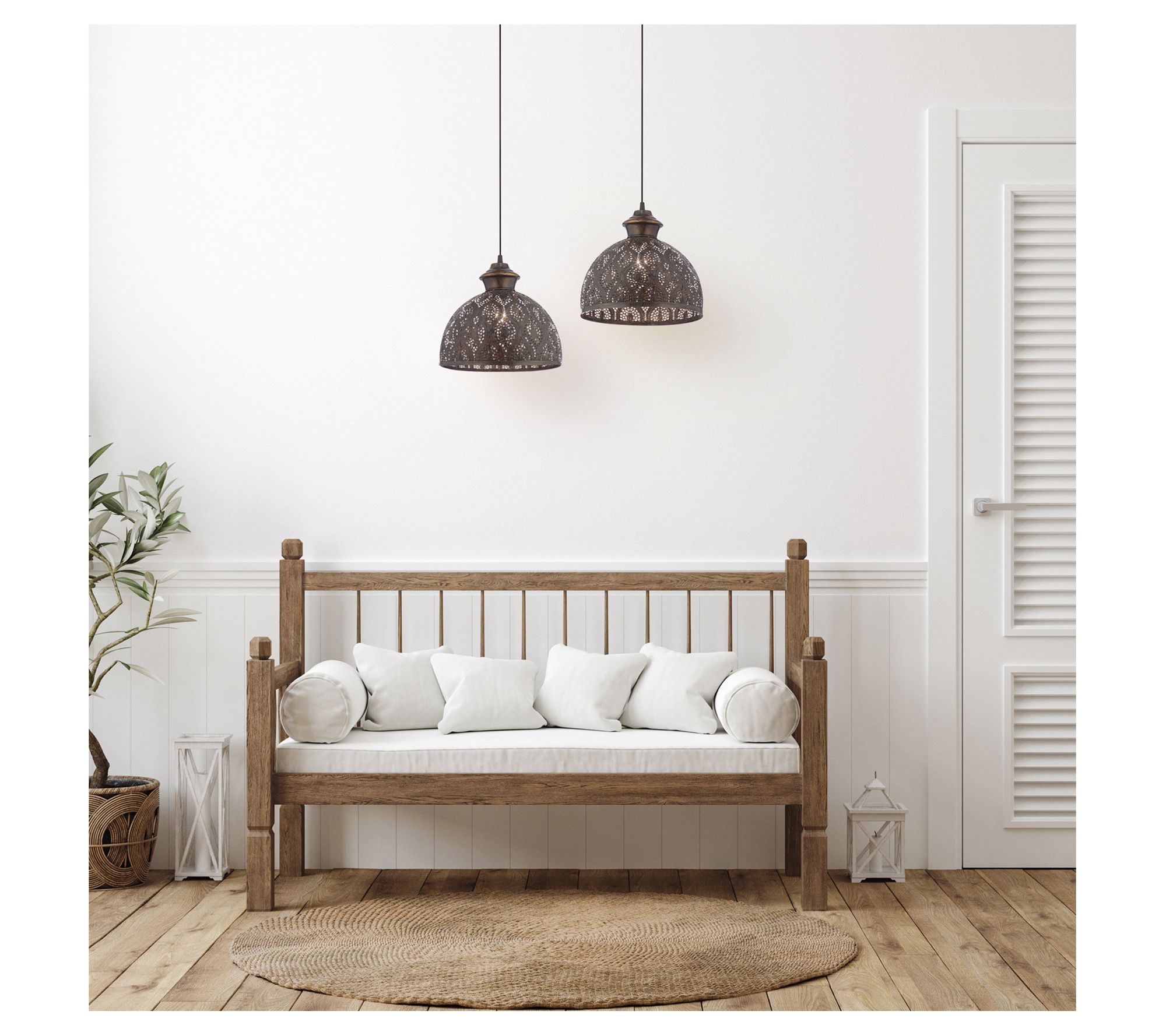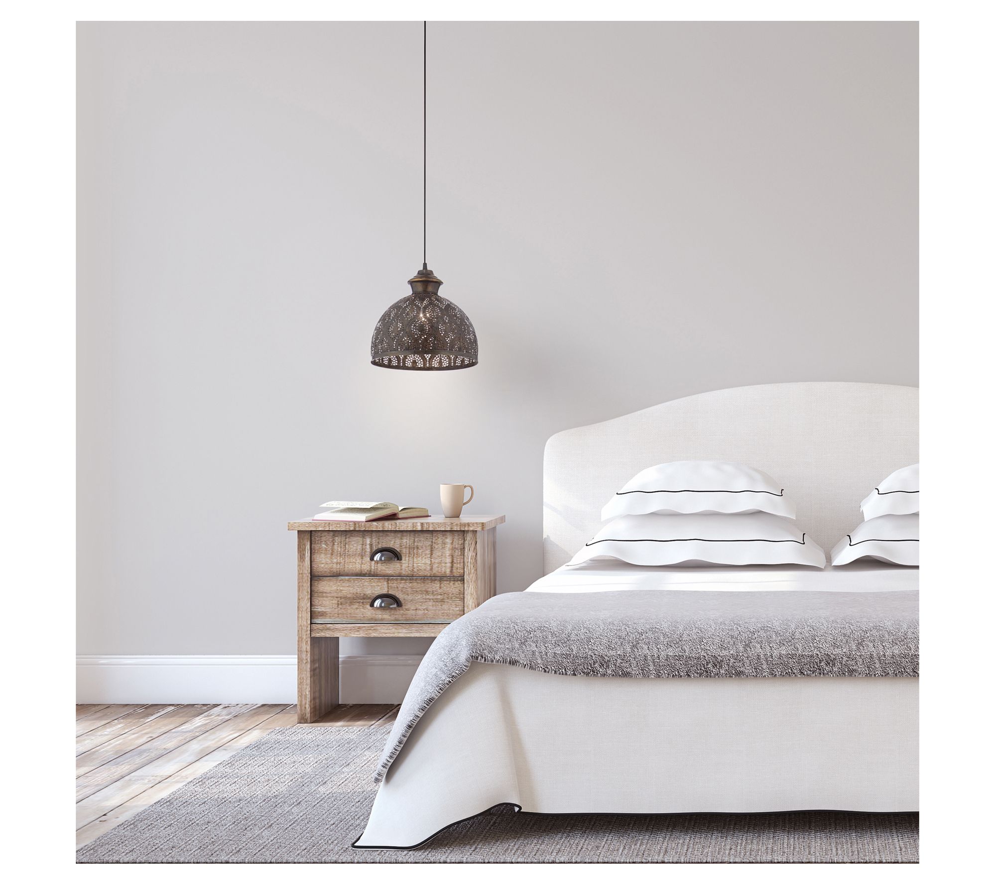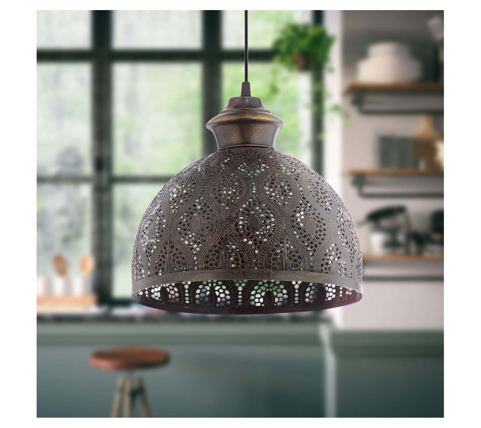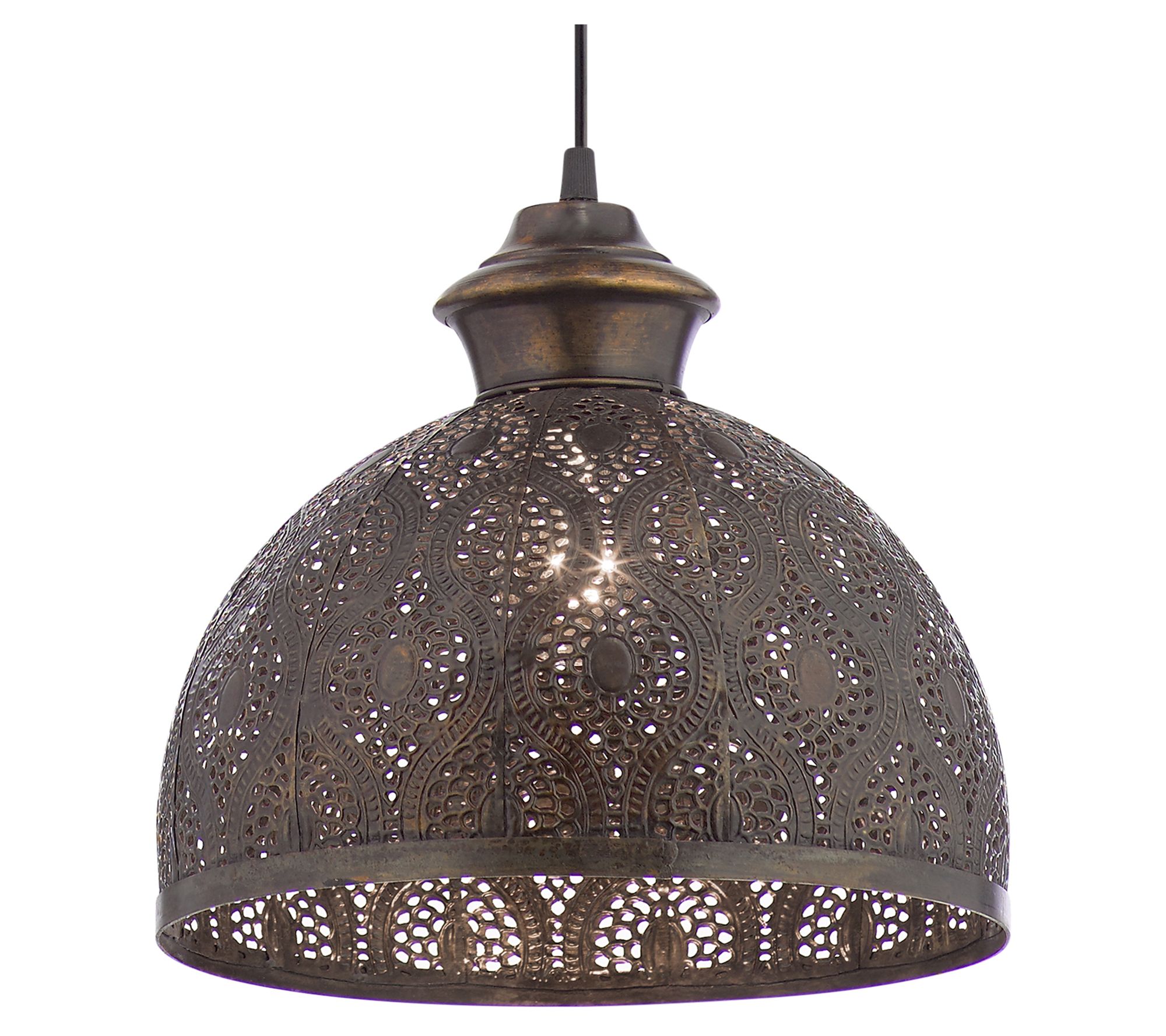 Boho charm is yours with this bowl-shaped metal pendant light. Its antiqued finish and decorative cutout design is destined to deliver dramatic results. From River of Goods.