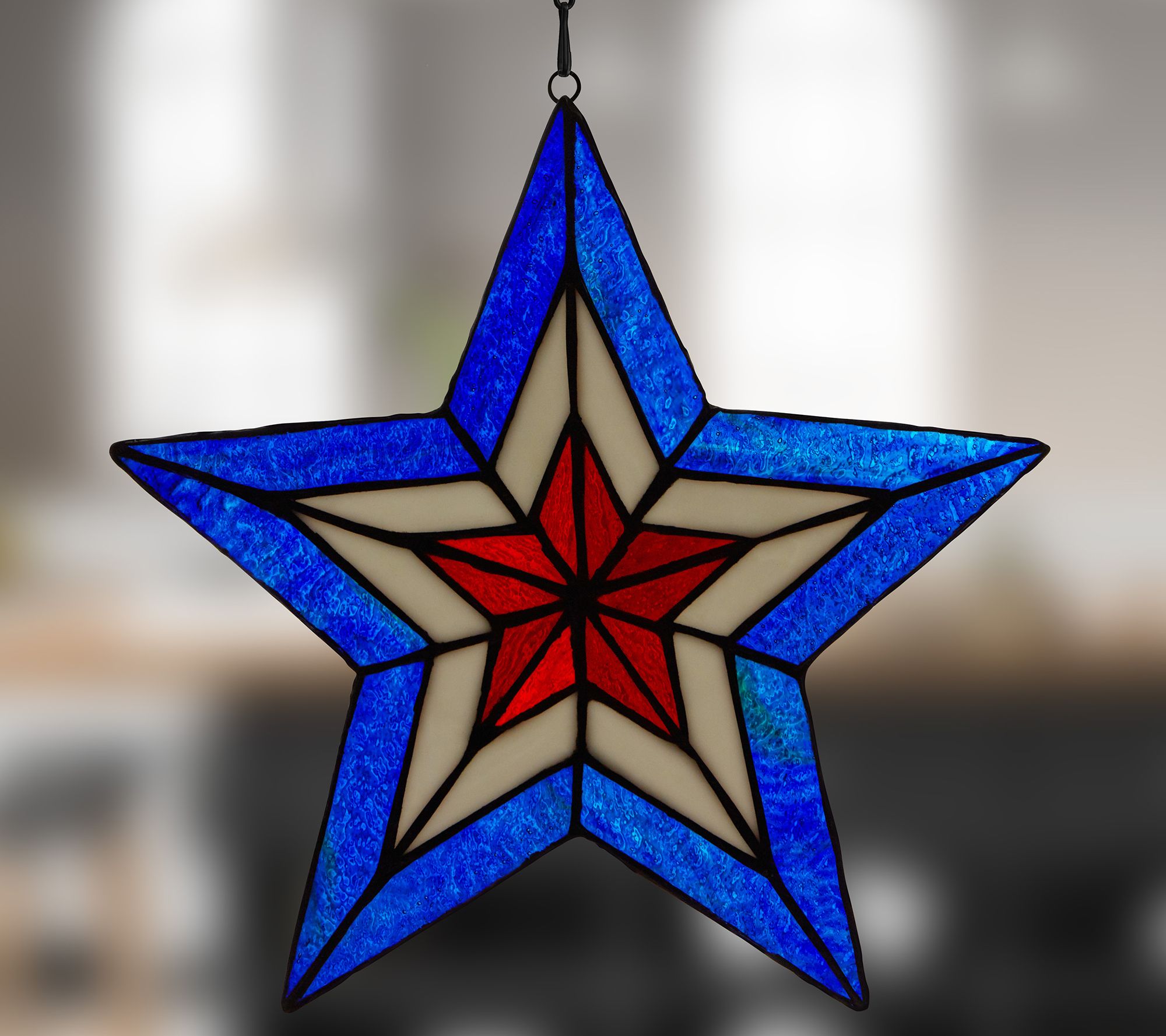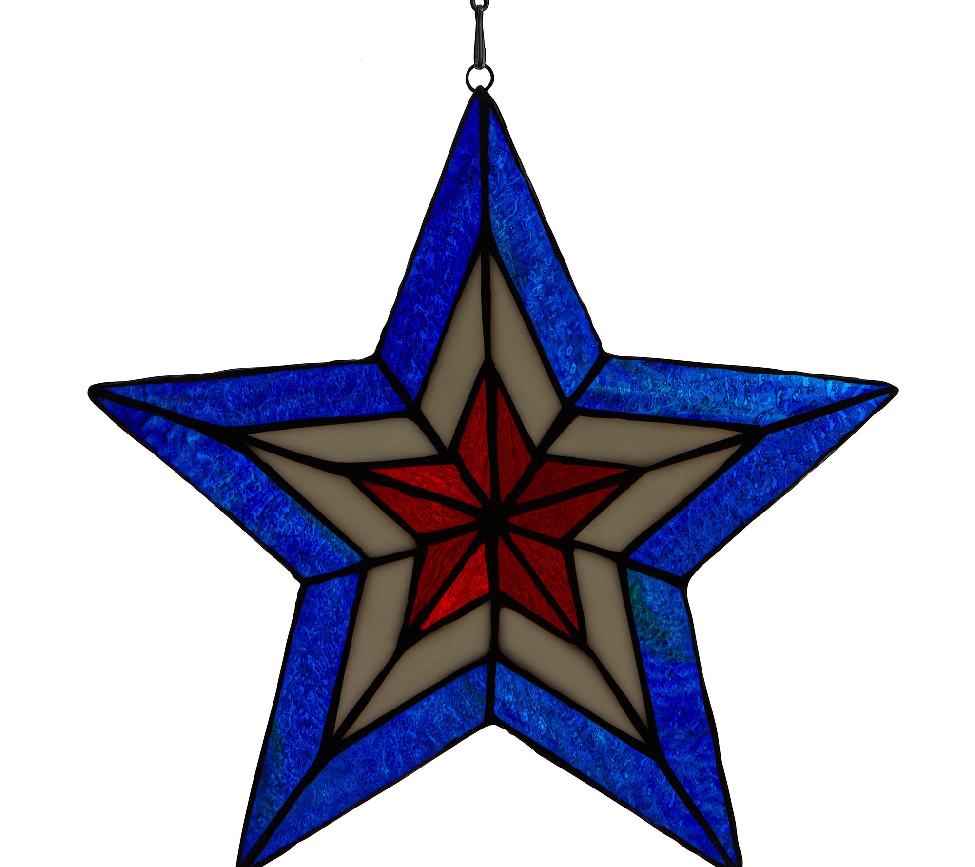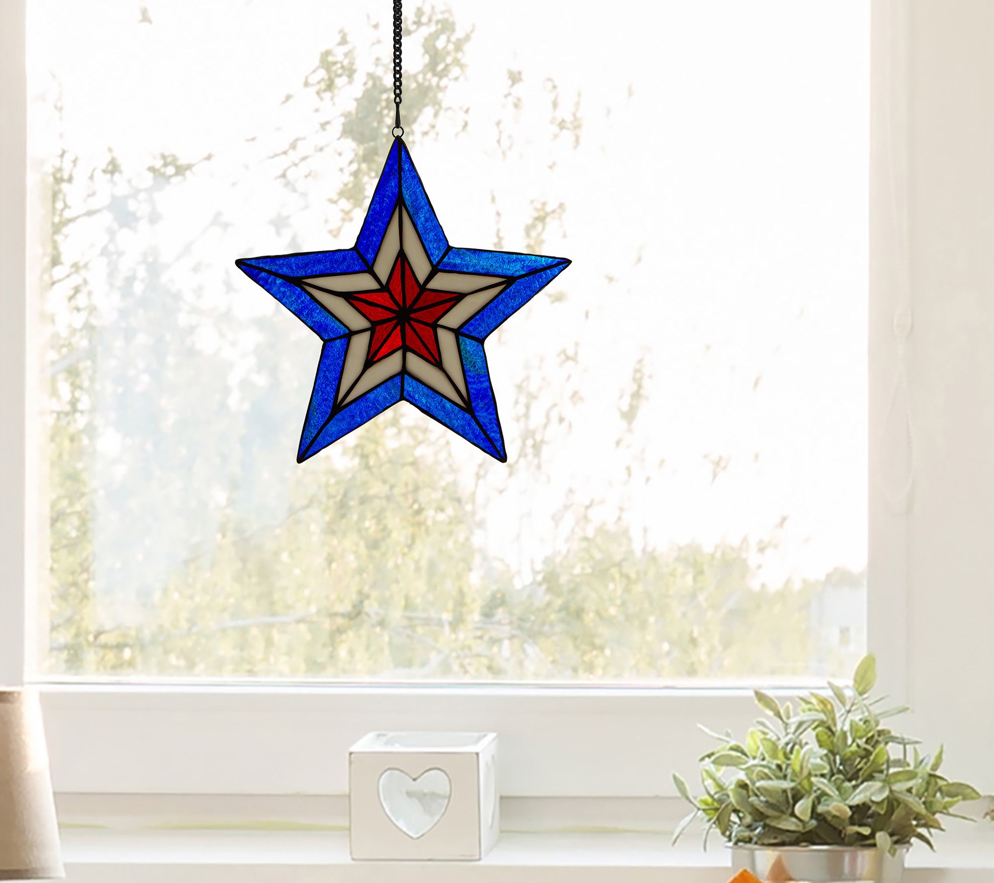 Enhance your home aesthetic with the vibrant colors of this star-shaped stained glass panel ready to hang in your window. From River of Goods.
