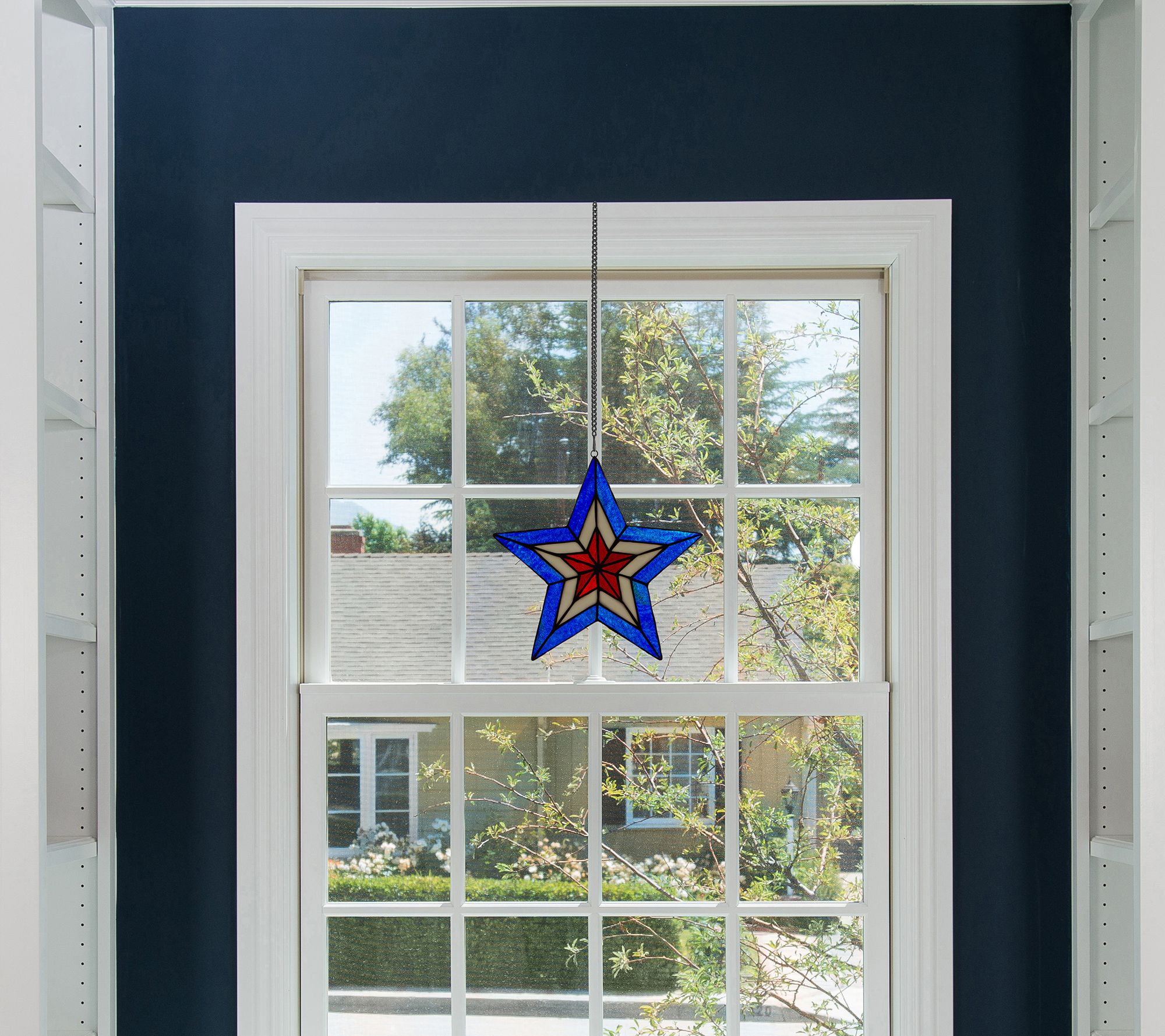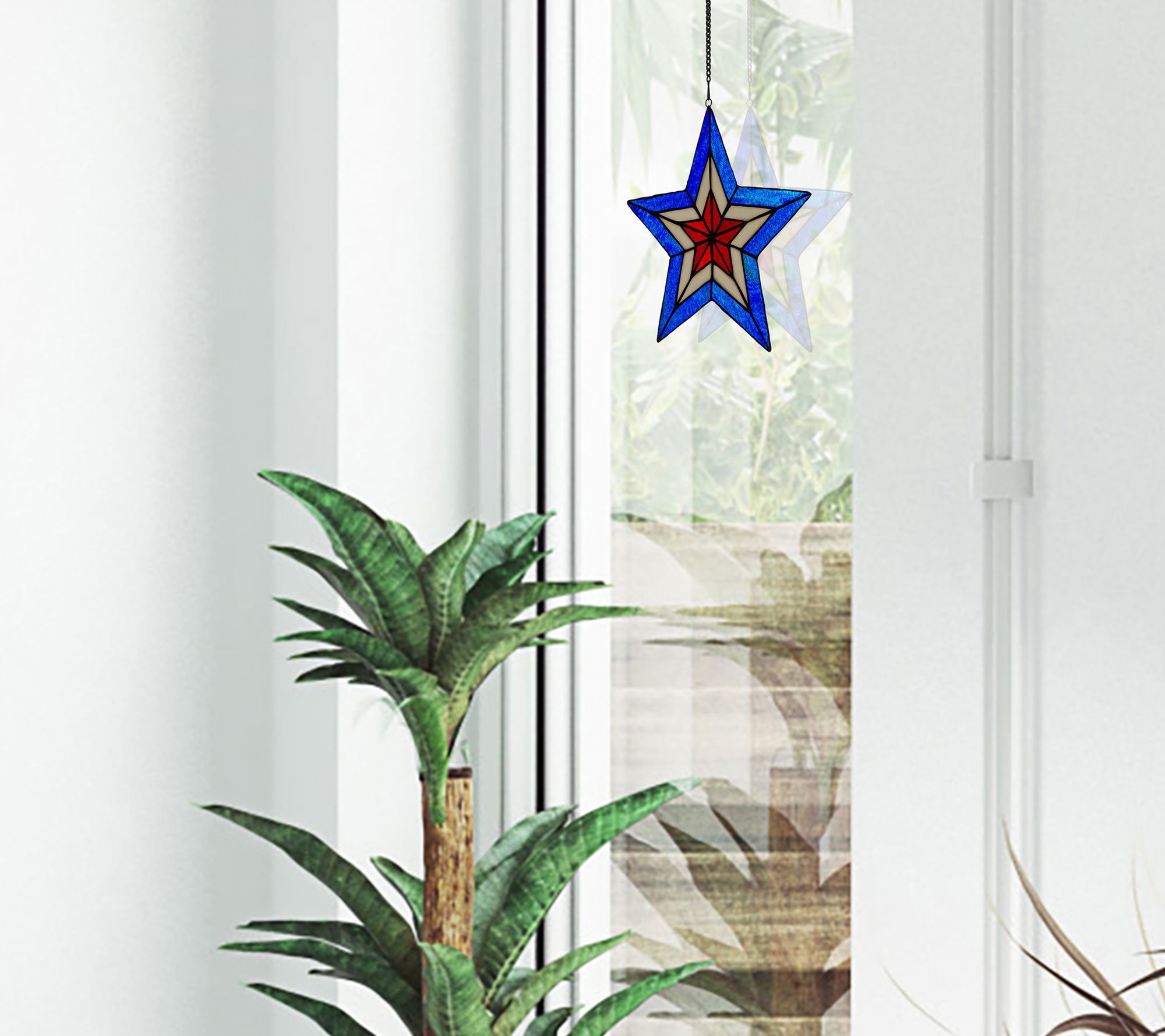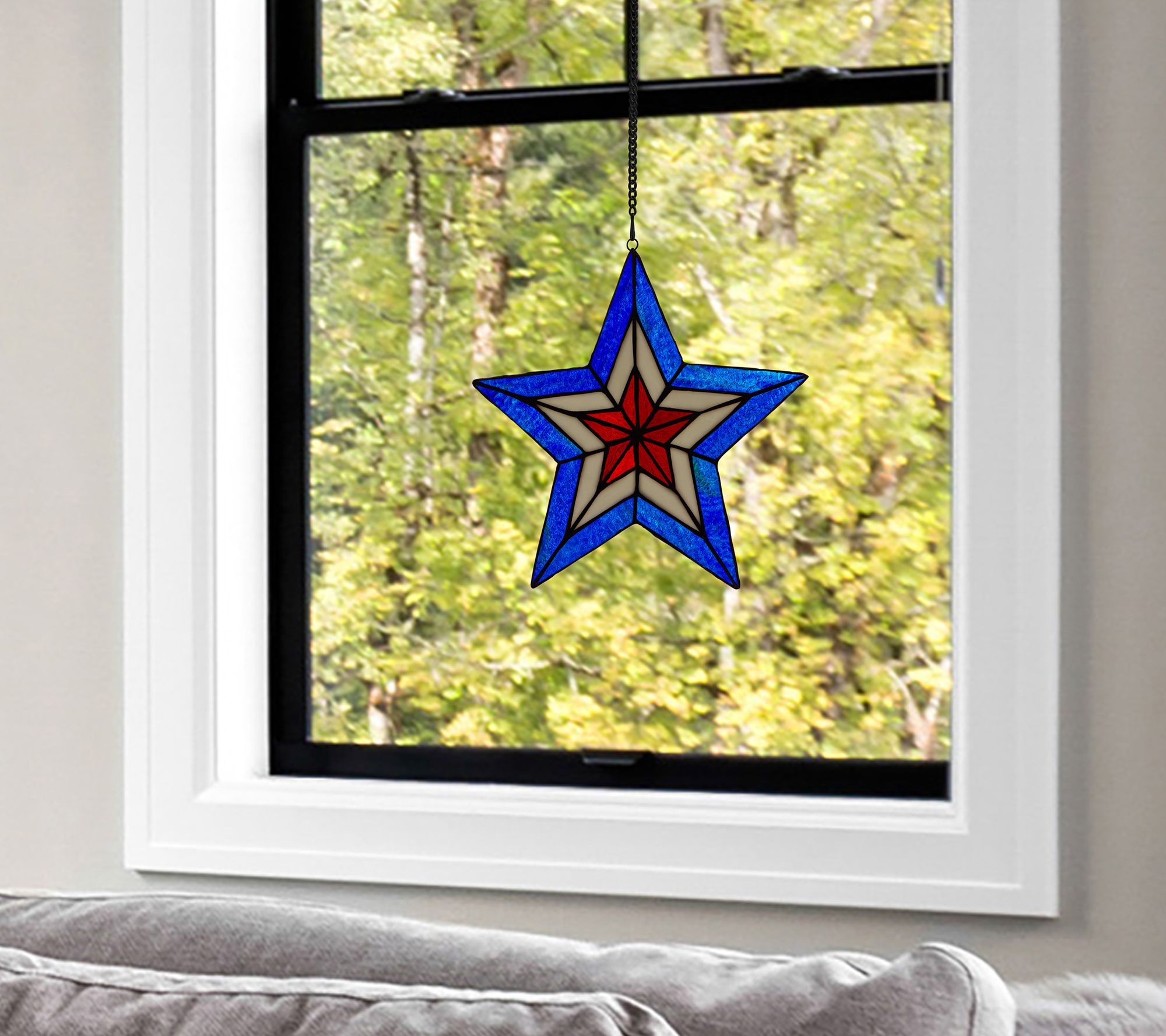 Enhance your home aesthetic with the vibrant colors of this star-shaped stained glass panel ready to hang in your window. From River of Goods.