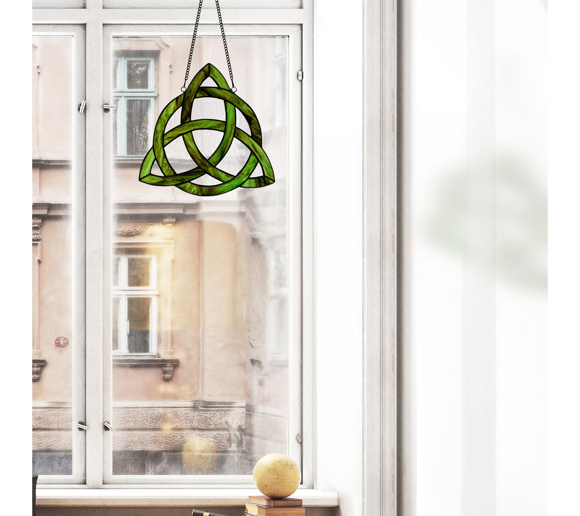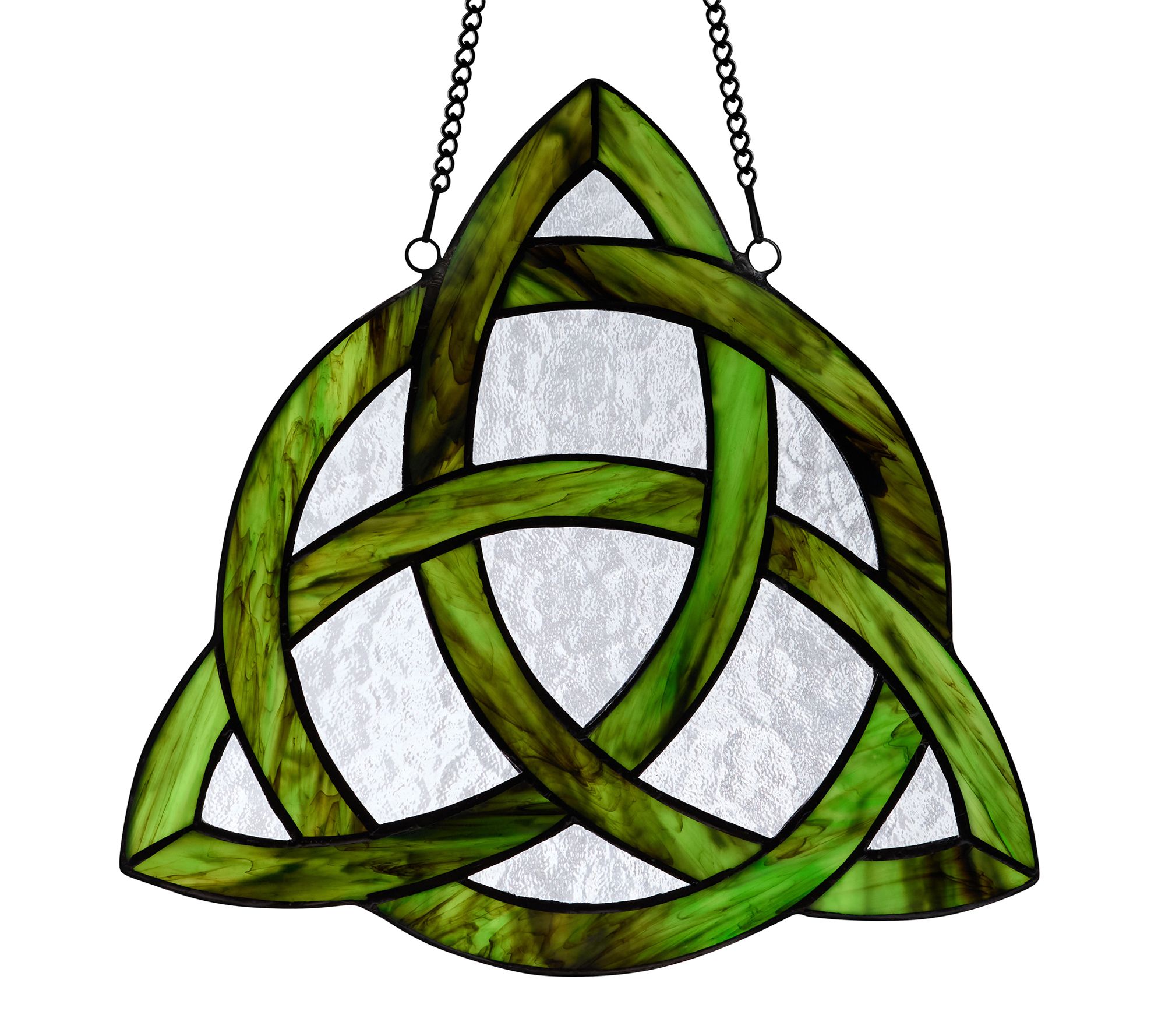 Transform any room with the luminous beauty of a stained glass window panel, capturing sunlight in shades of green and clear as it showcases a striking trinity knot Celtic design. Hang it in your favorite window and let the Tiffany-style craftsmanship add storybook charm and timeless color to your space. From River of Goods.