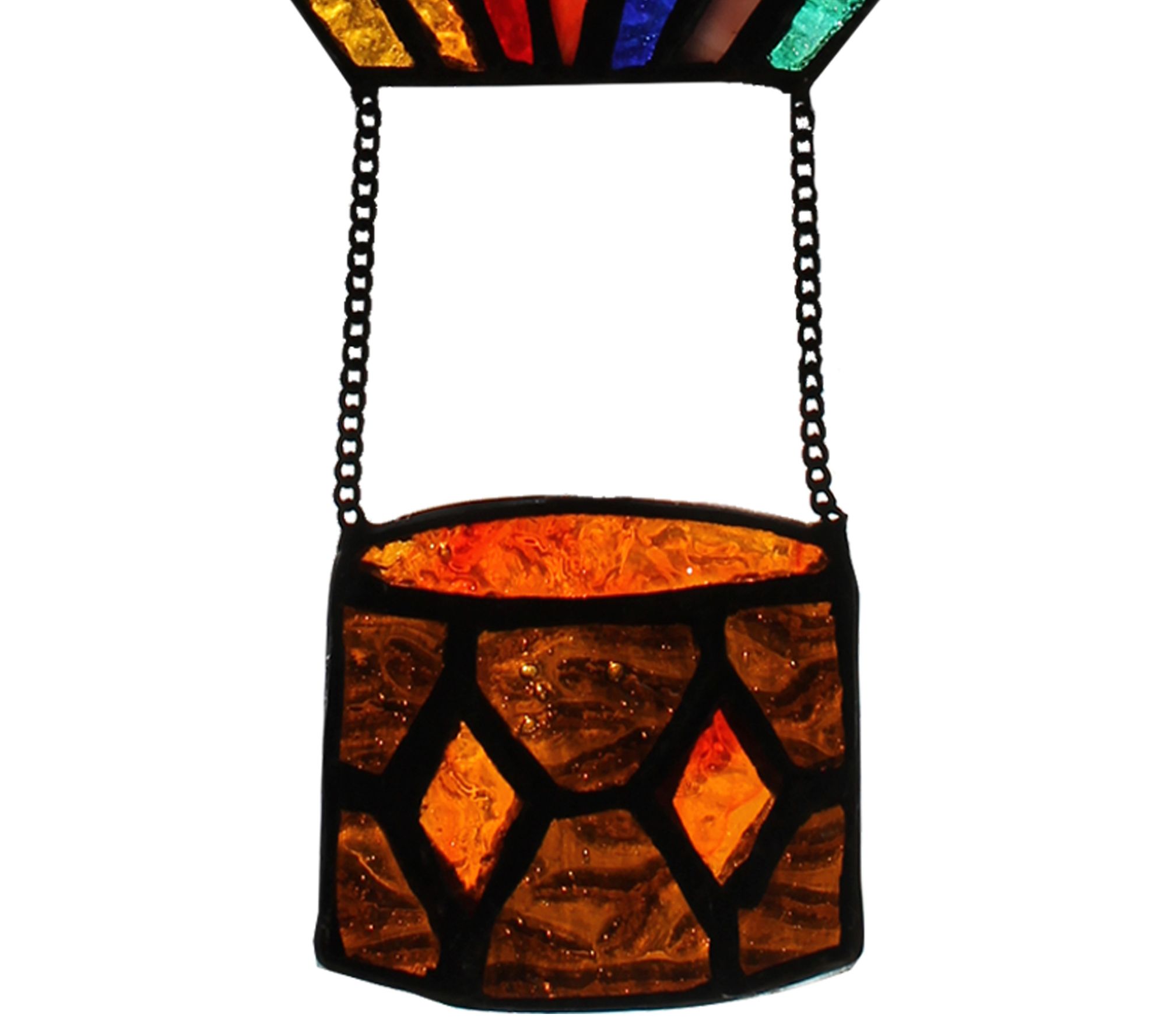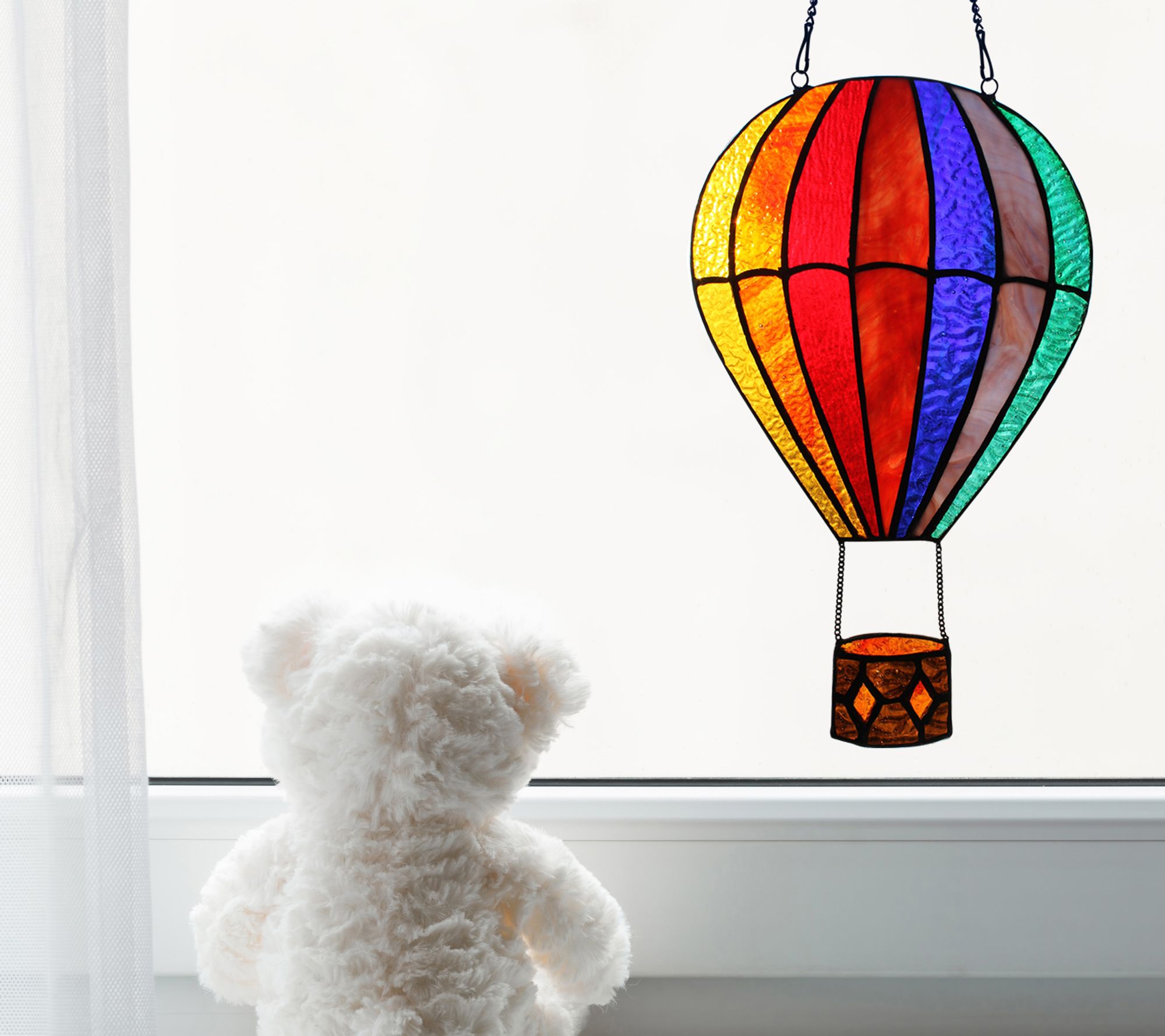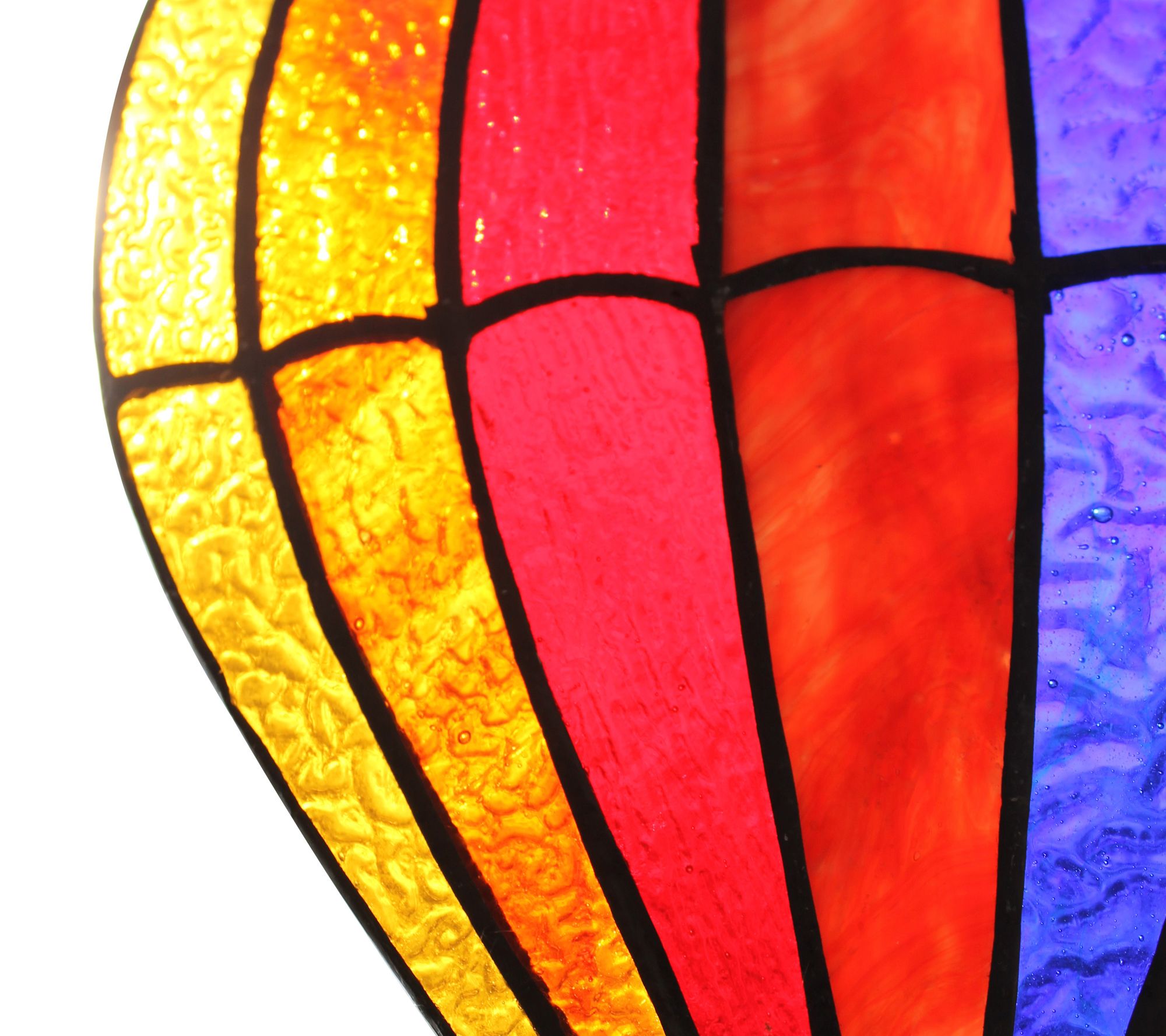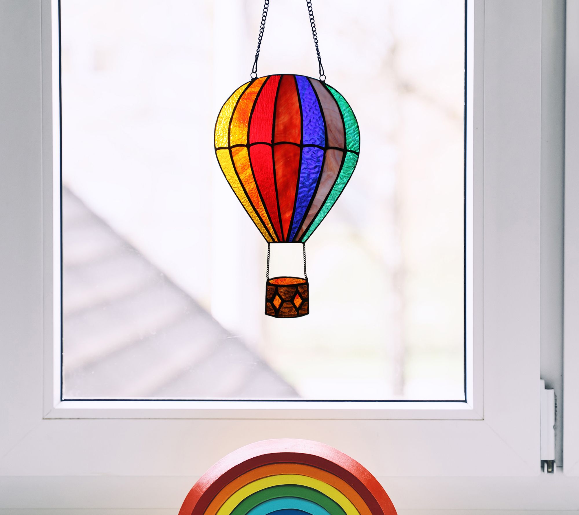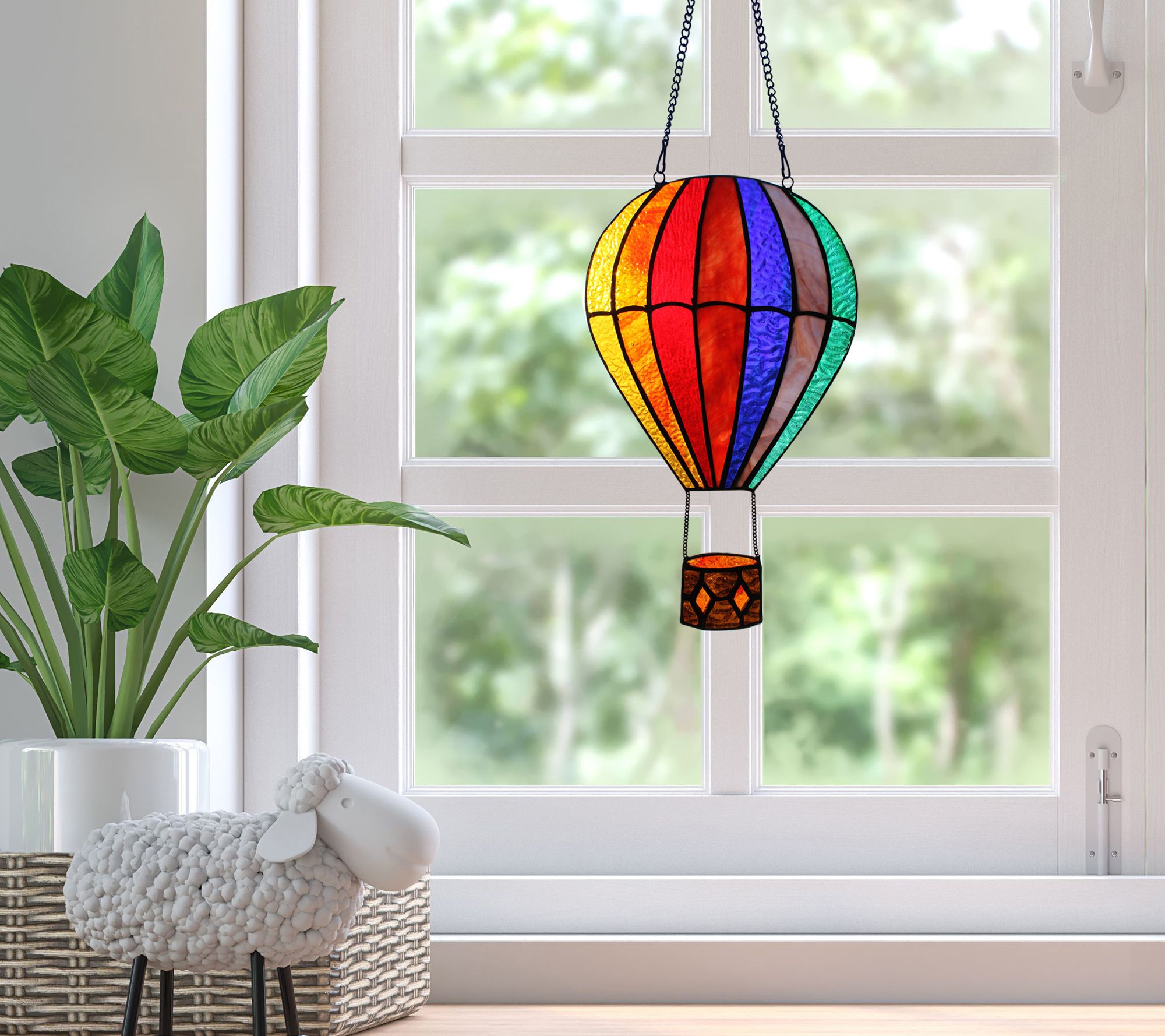 Crisply cut panels in vibrant hues radiate elegance when light penetrates this gorgeous hot air balloon stained glass panel. A chain hanger makes it easy to decorate any window of your home. From River of Goods.
