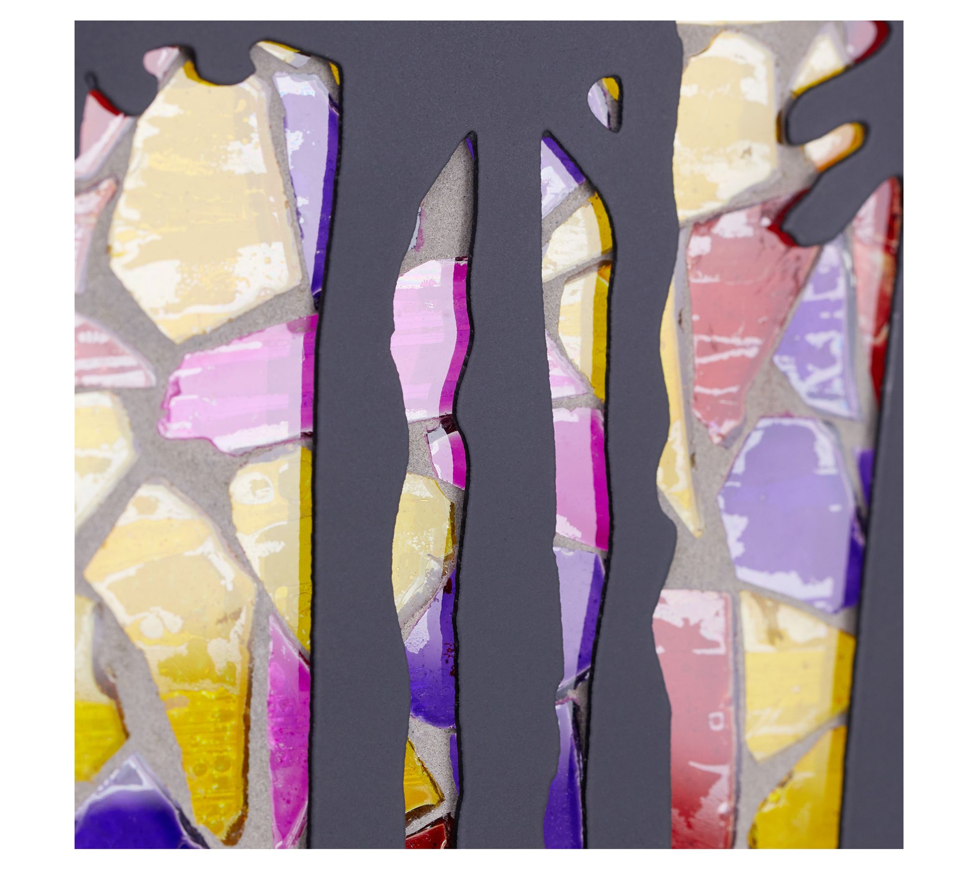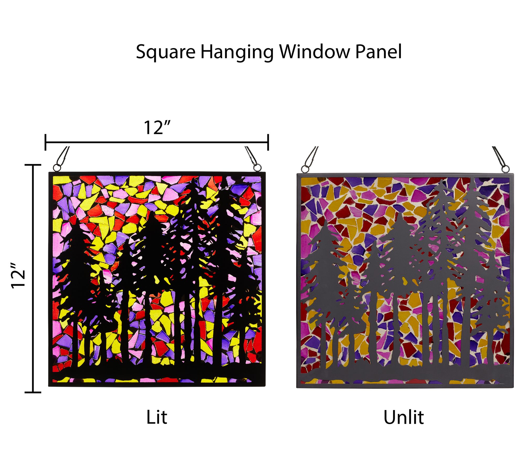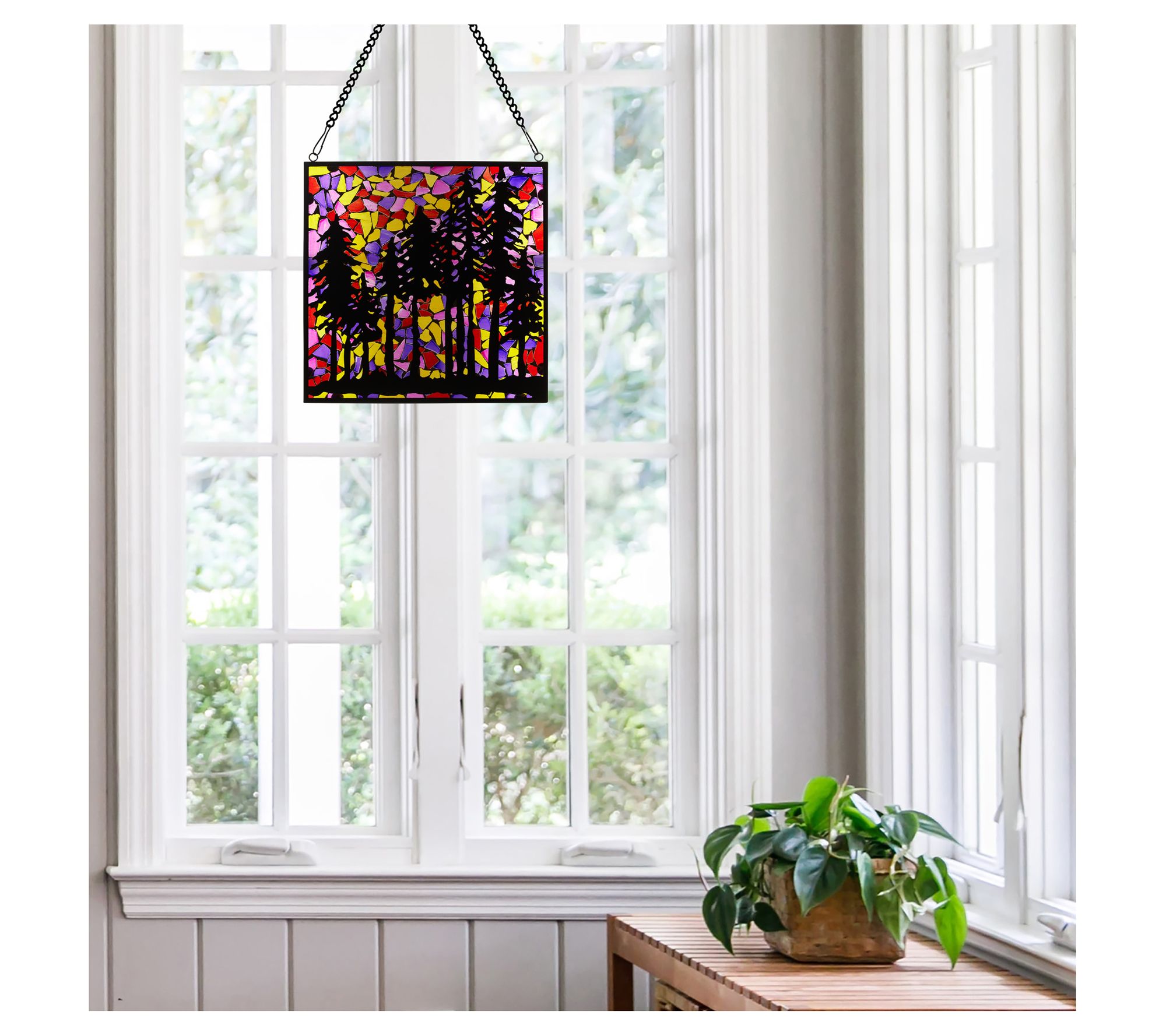 Add a touch of artistic elegance to your home with the River of Goods mosaic landscape stained glass window panel. Featuring a dynamic color display and a vibrant forest of evergreen trees, this piece is perfect for any season. From River of Goods.