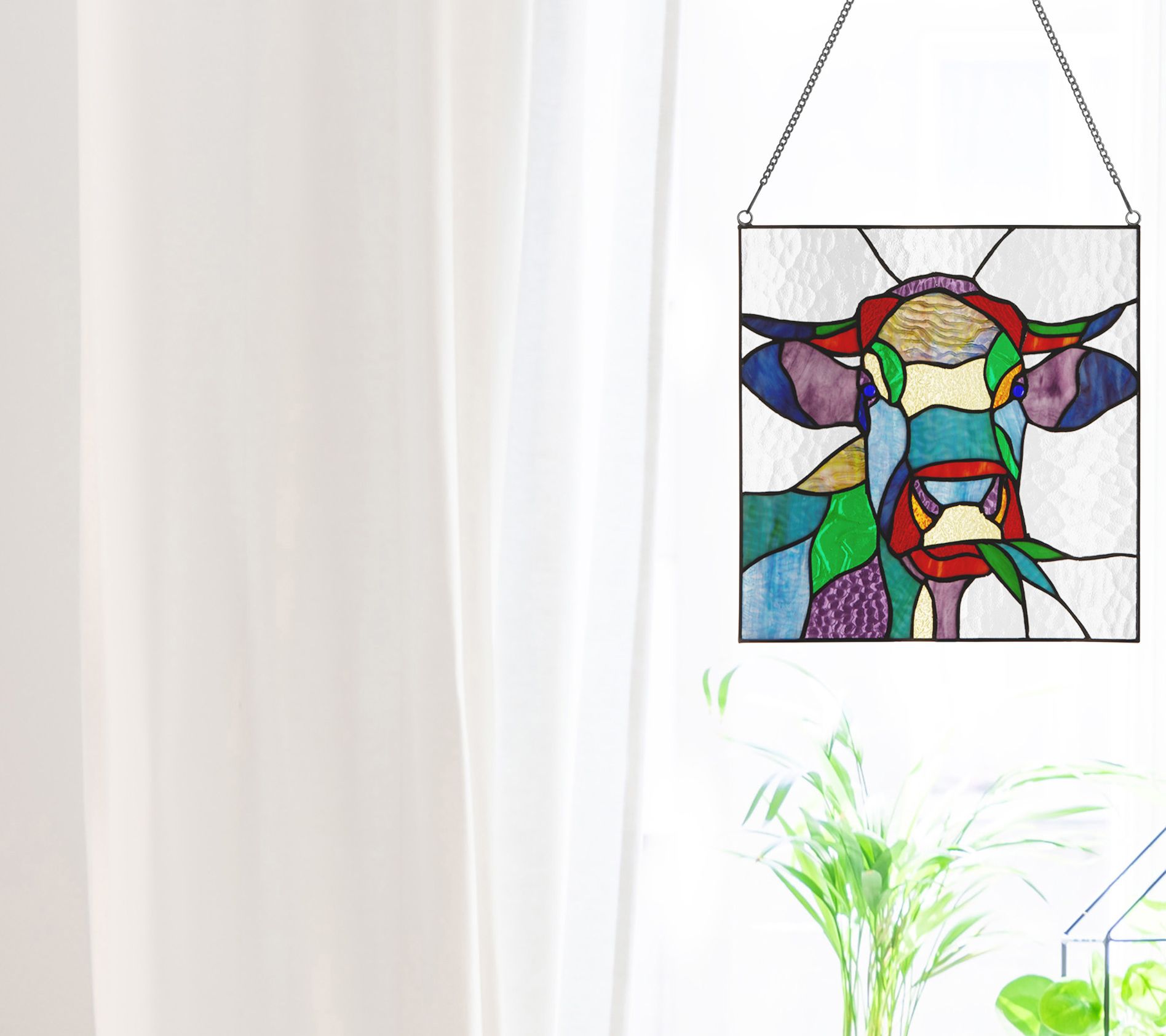 • Includes stained glass panel and metal chain hanger