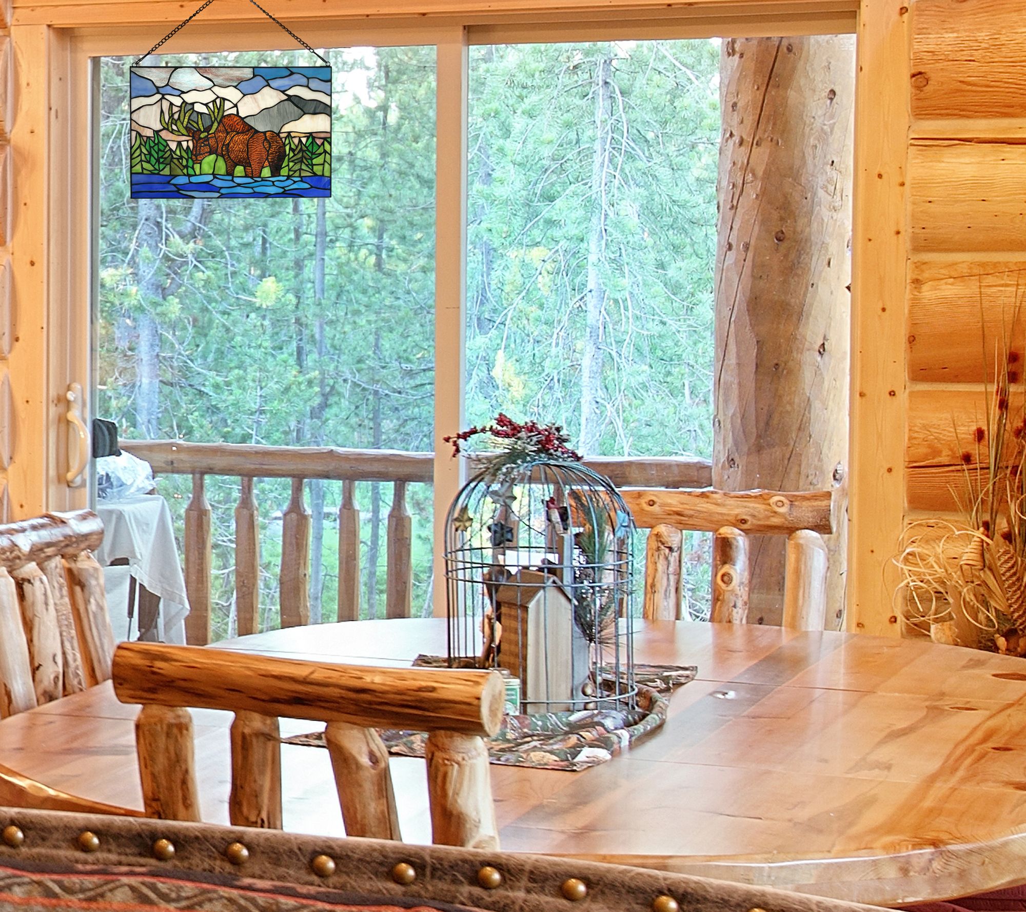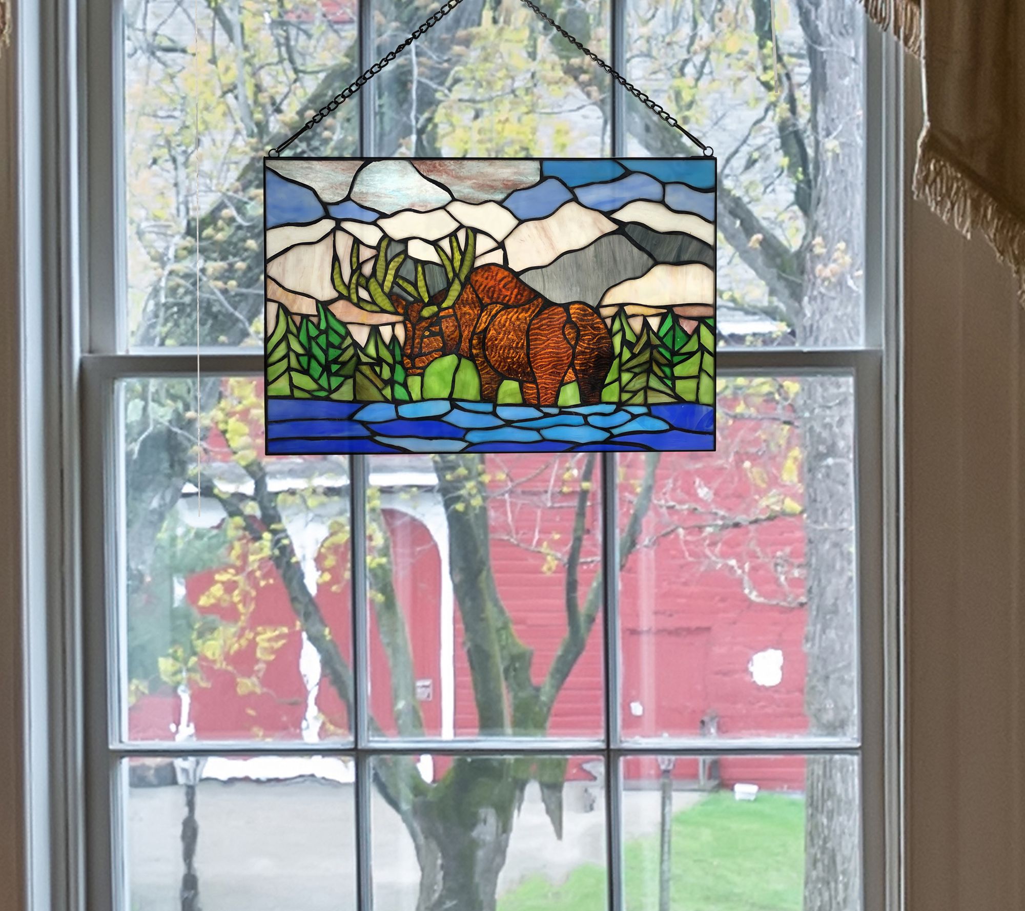 Invite the beauty of nature into your home with the addition of this fabulous stained glass wildlife scene. Hang it in your window and let the sunlight filter through in spectacular color. From River of Goods.