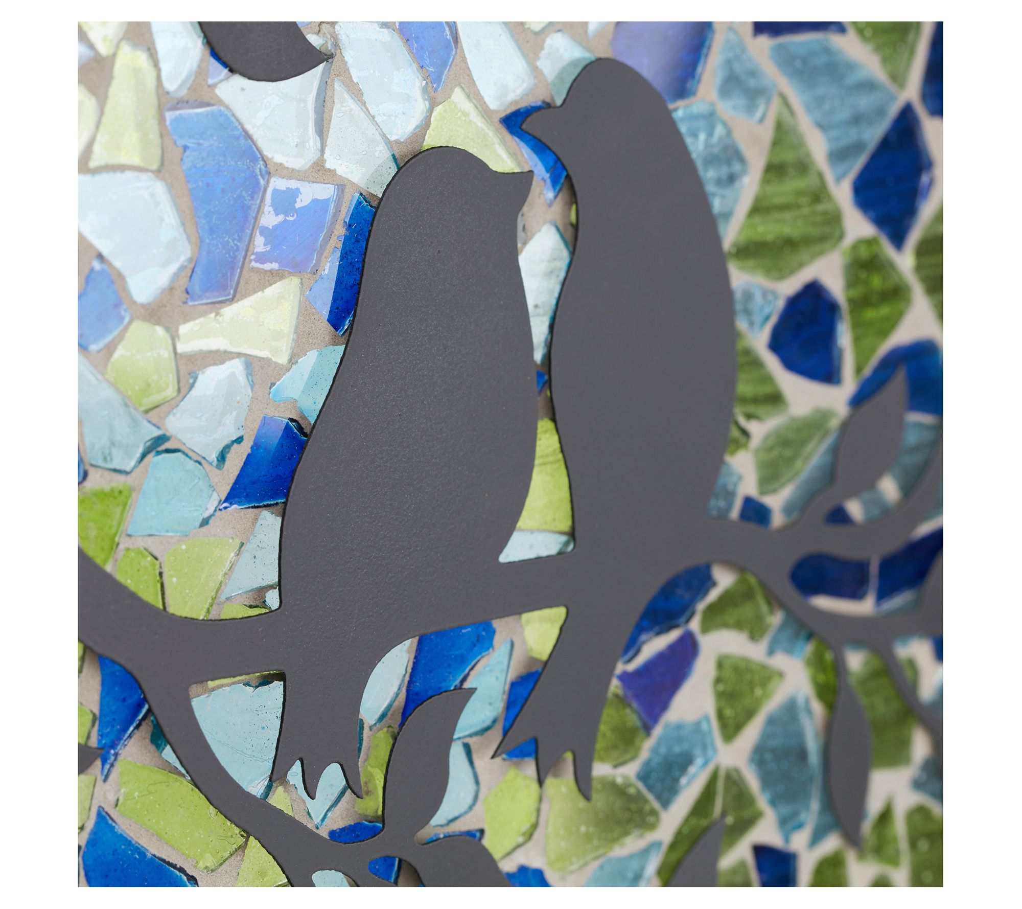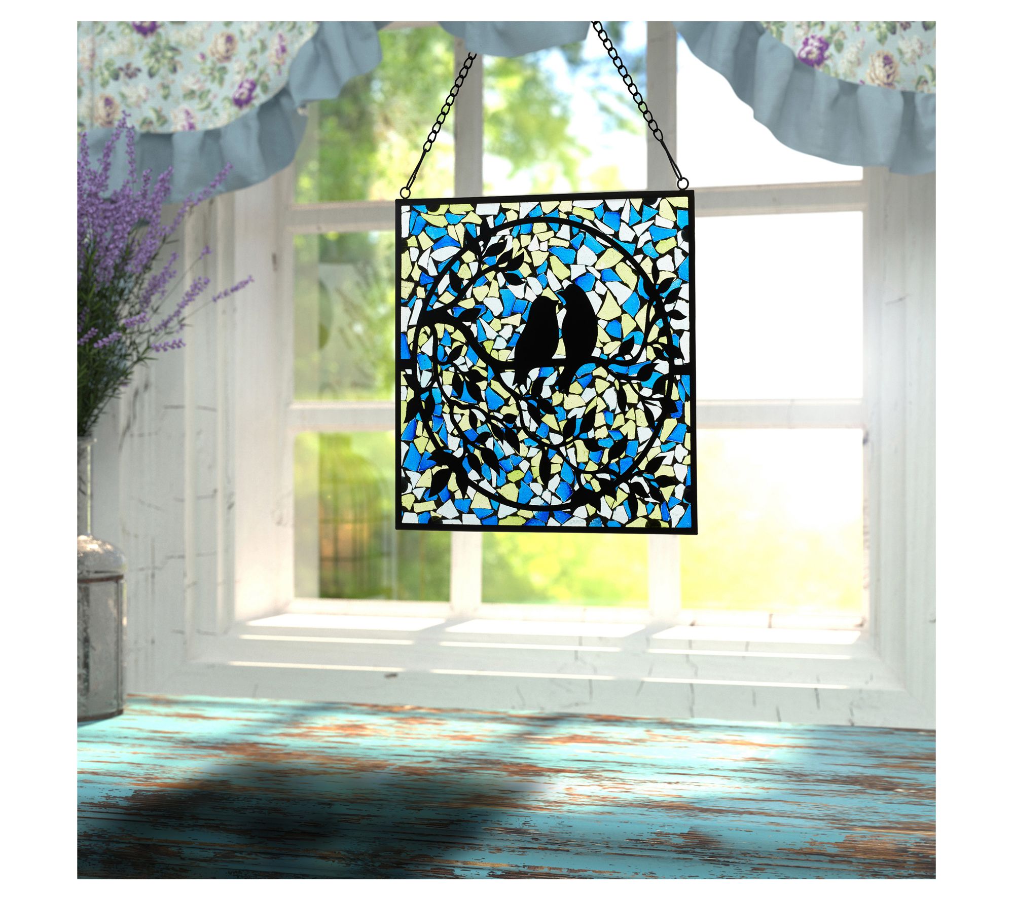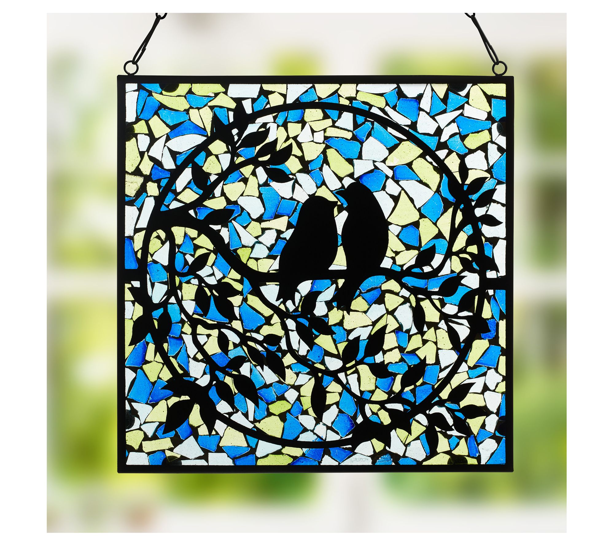 Brighten up your home with the River of Goods love birds mosaic stained glass panel. Featuring a vibrant design of two love birds perched on a circular tree branch, this charming piece is crafted with beautiful shades of blue, aqua, yellow, and black. From River of Goods.