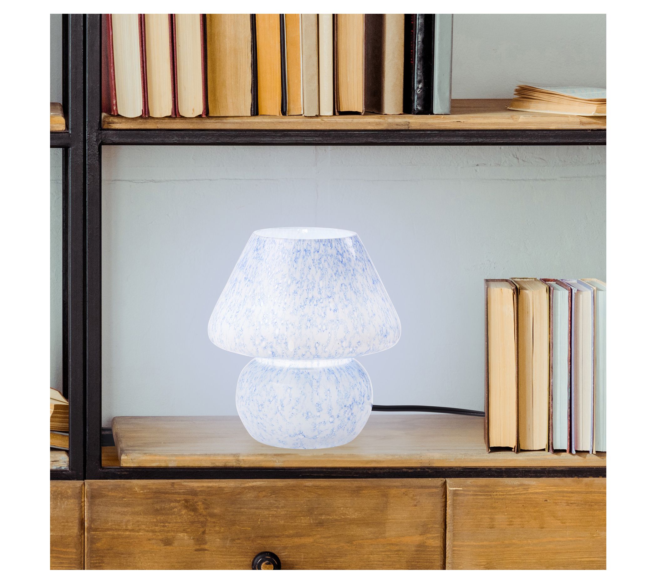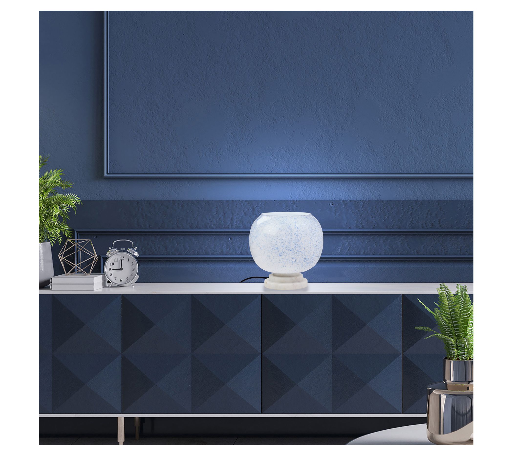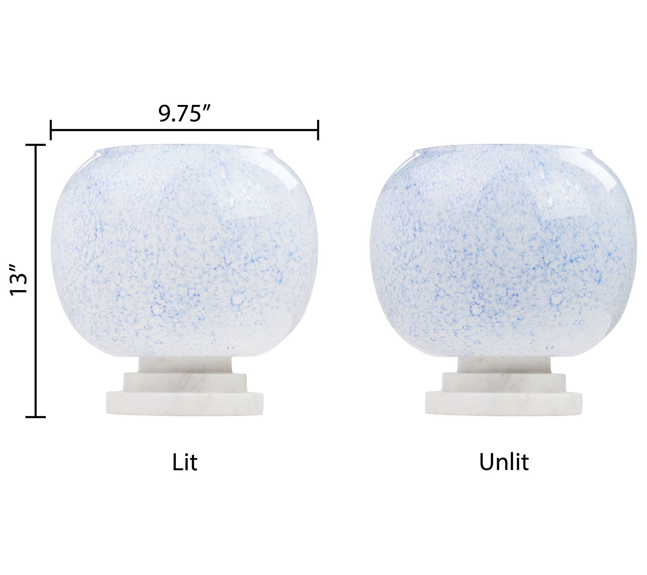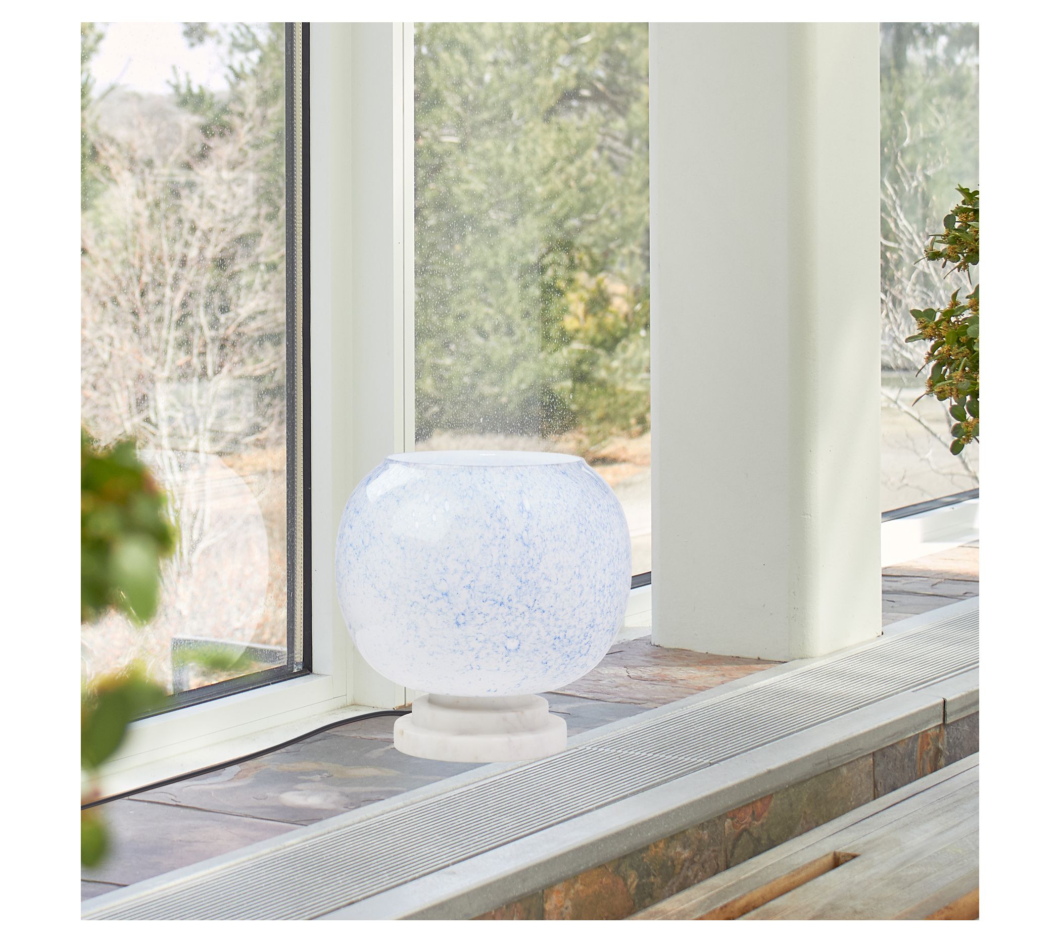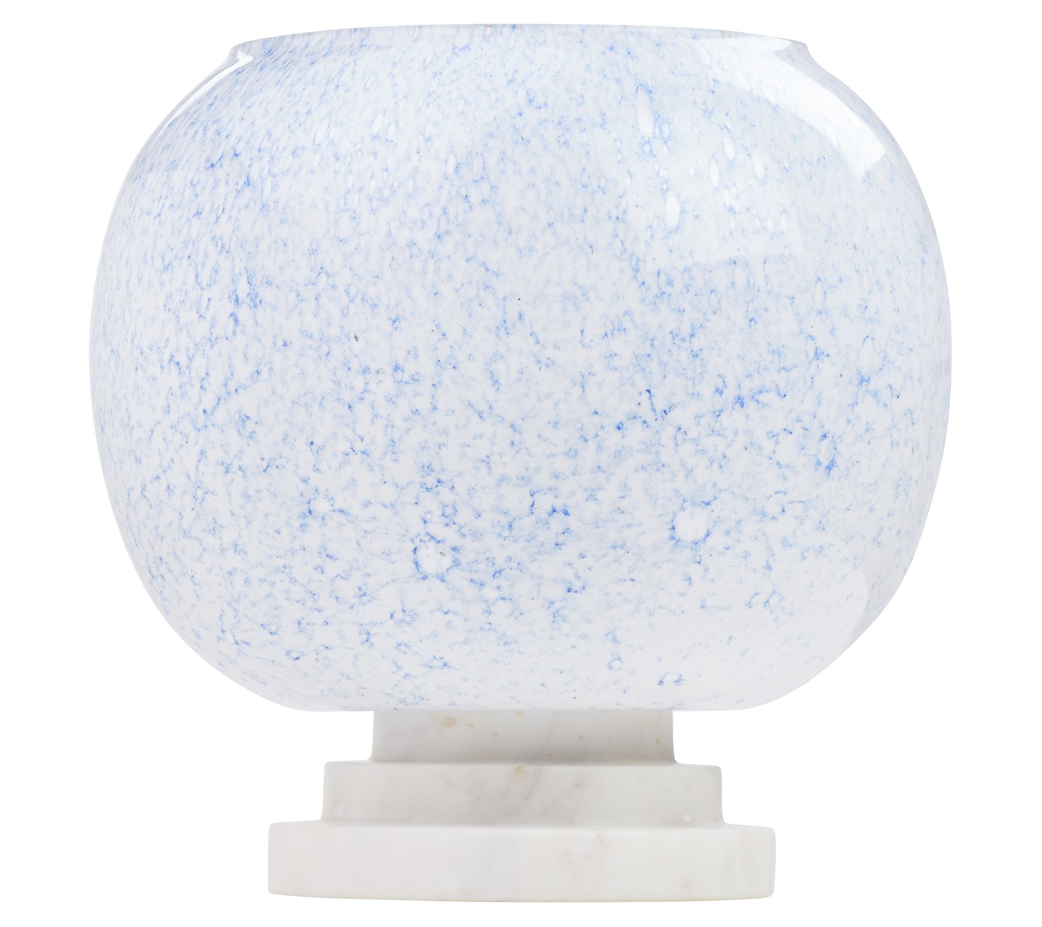 Brighten up your space with the River of Goods accent lamp. Featuring a stunning blue and white marble-look blown glass globe shade and a sleek white marble stacked base, this lamp adds a touch of elegance to any room. From River of Goods.