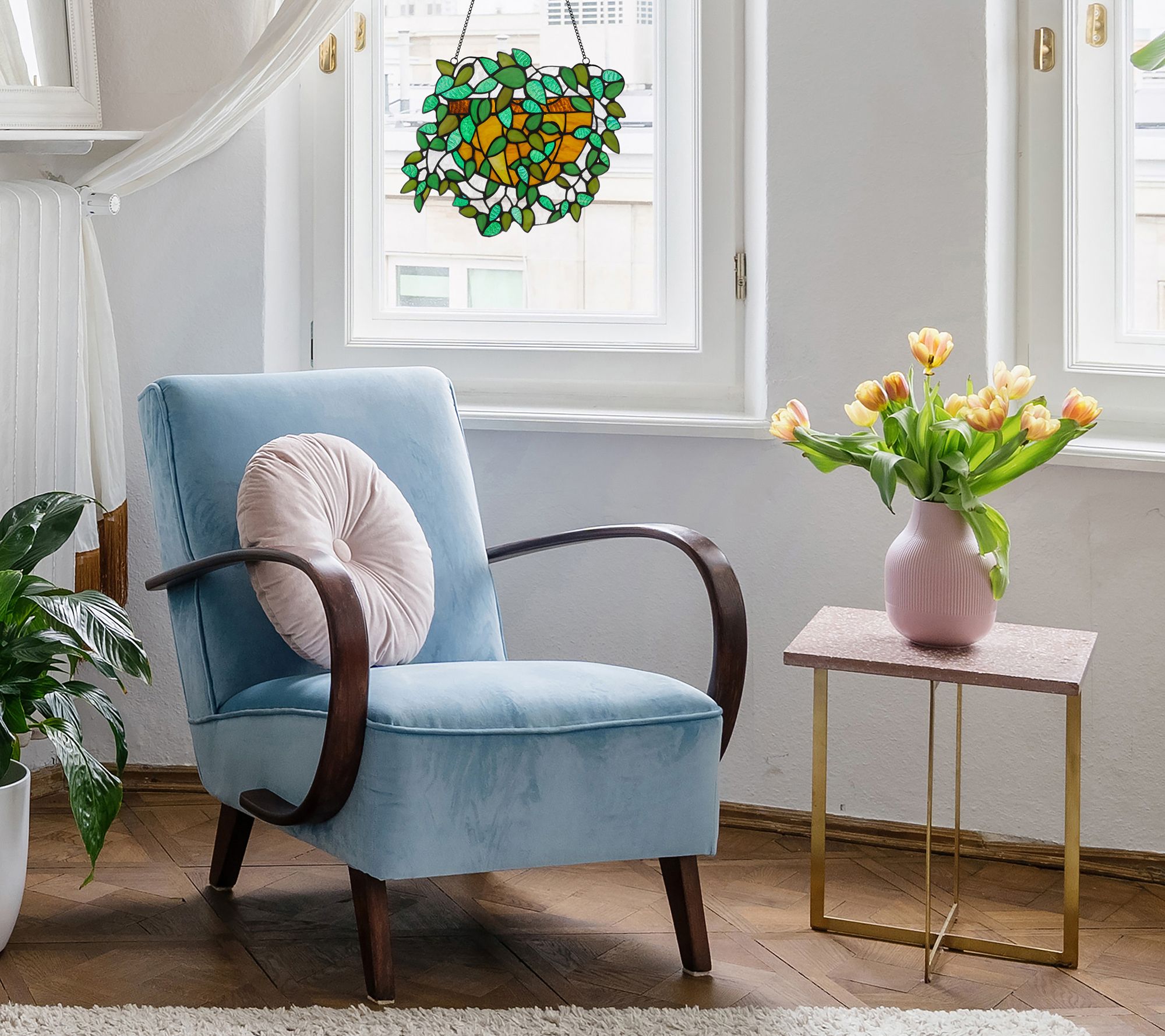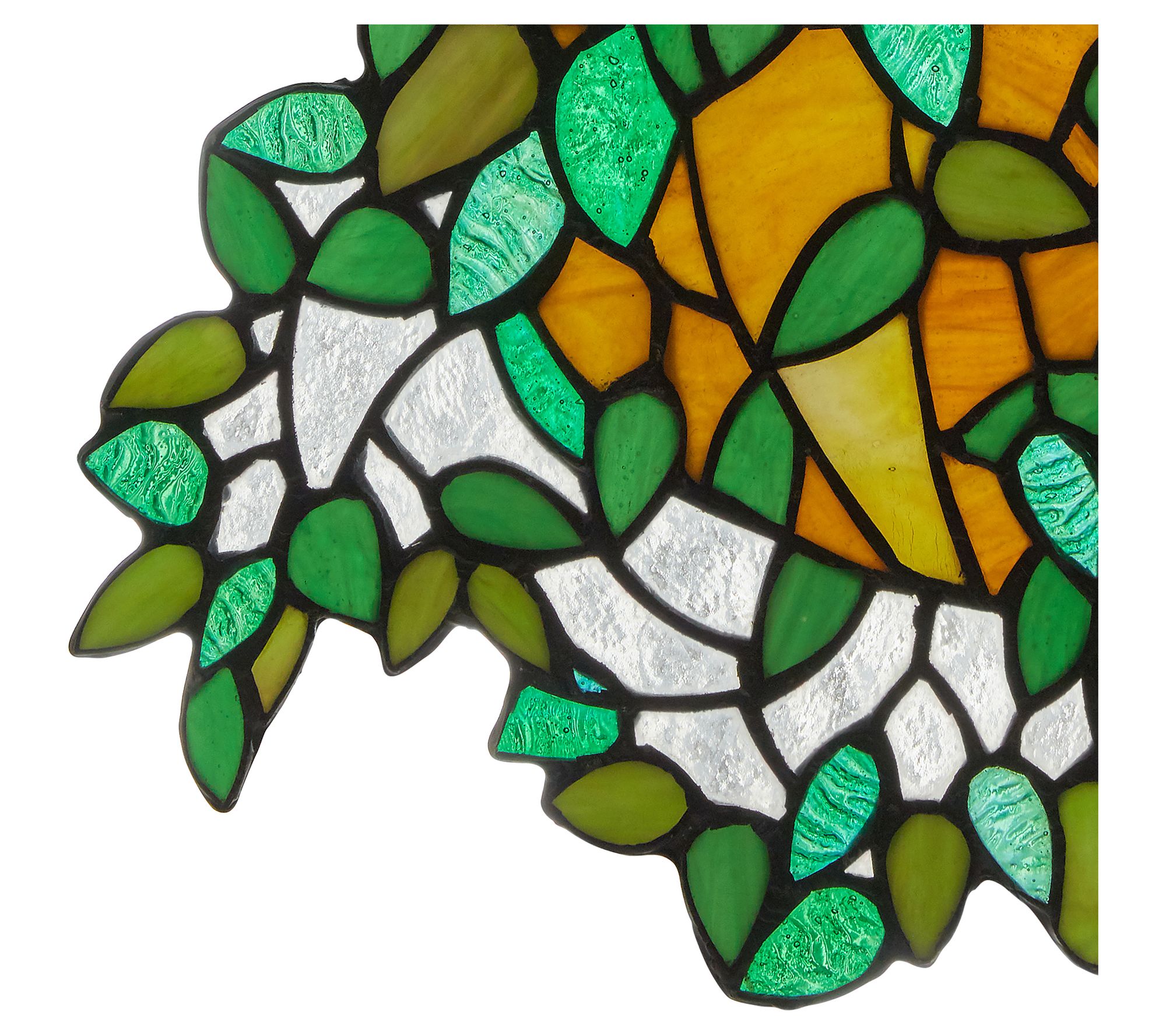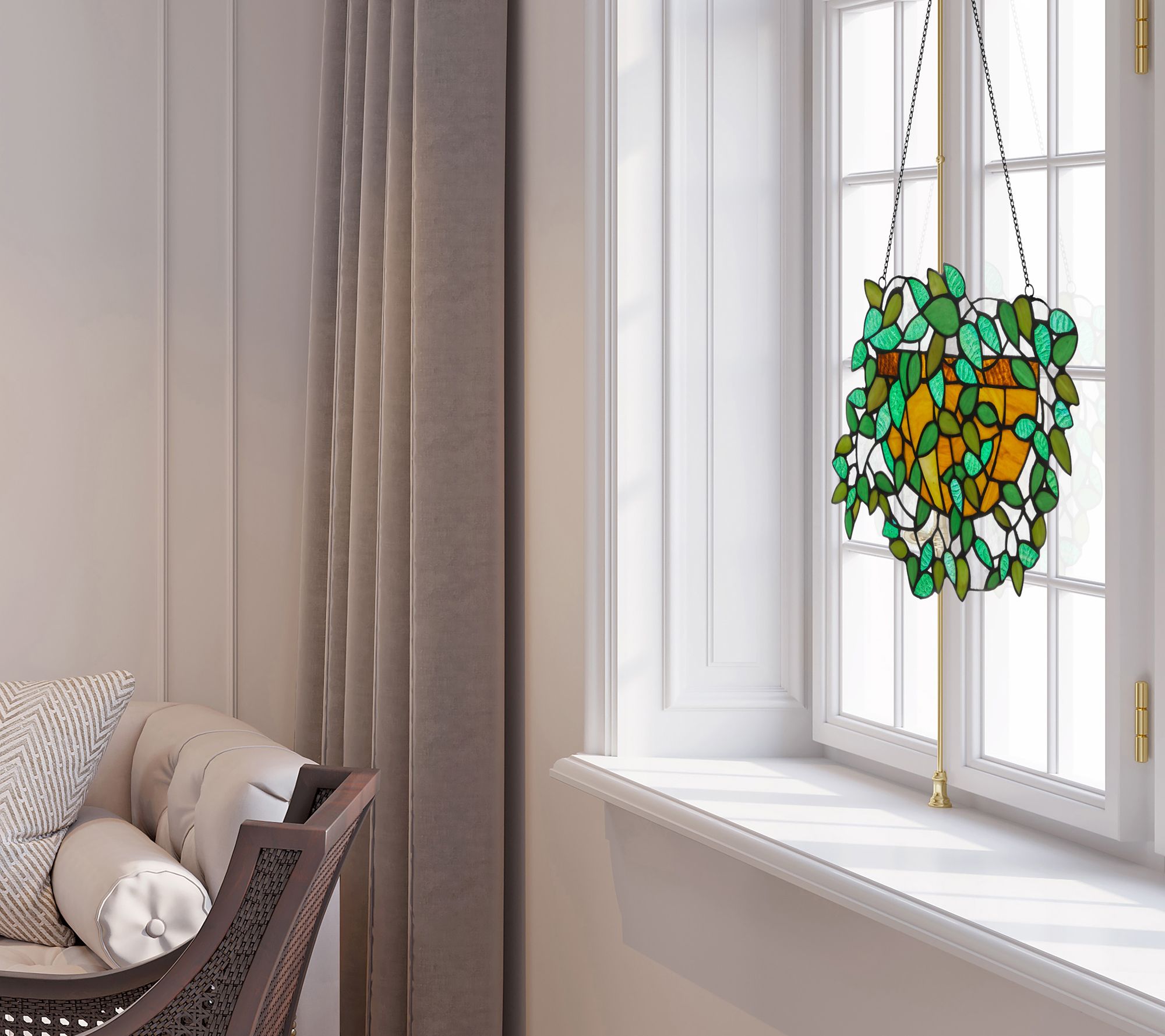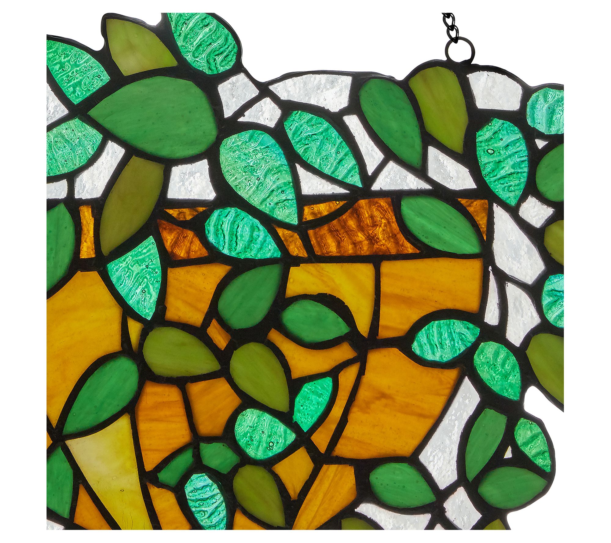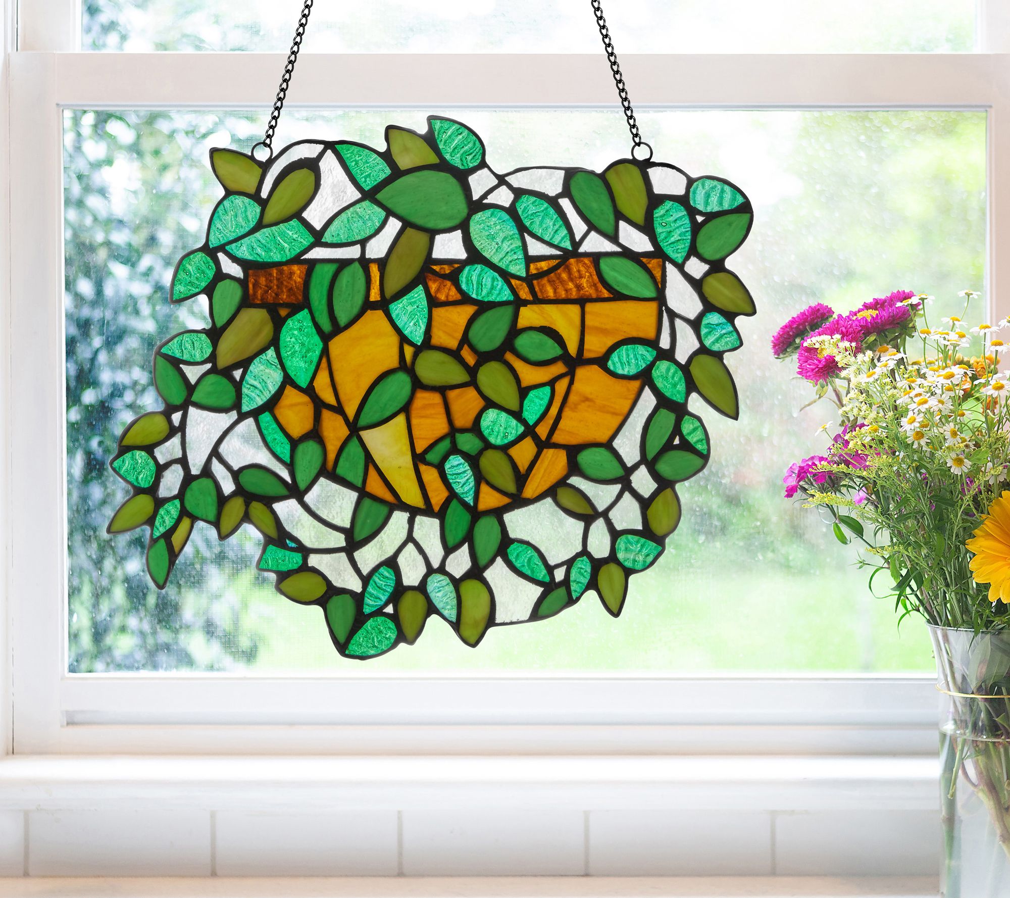 Bring a touch of whimsy to your home with this beautiful stained glass panel that showcases vibrant colors of green, amber, and brown in a delightful hanging plant motif, perfect for adding a unique flair to any room. From River of Goods.