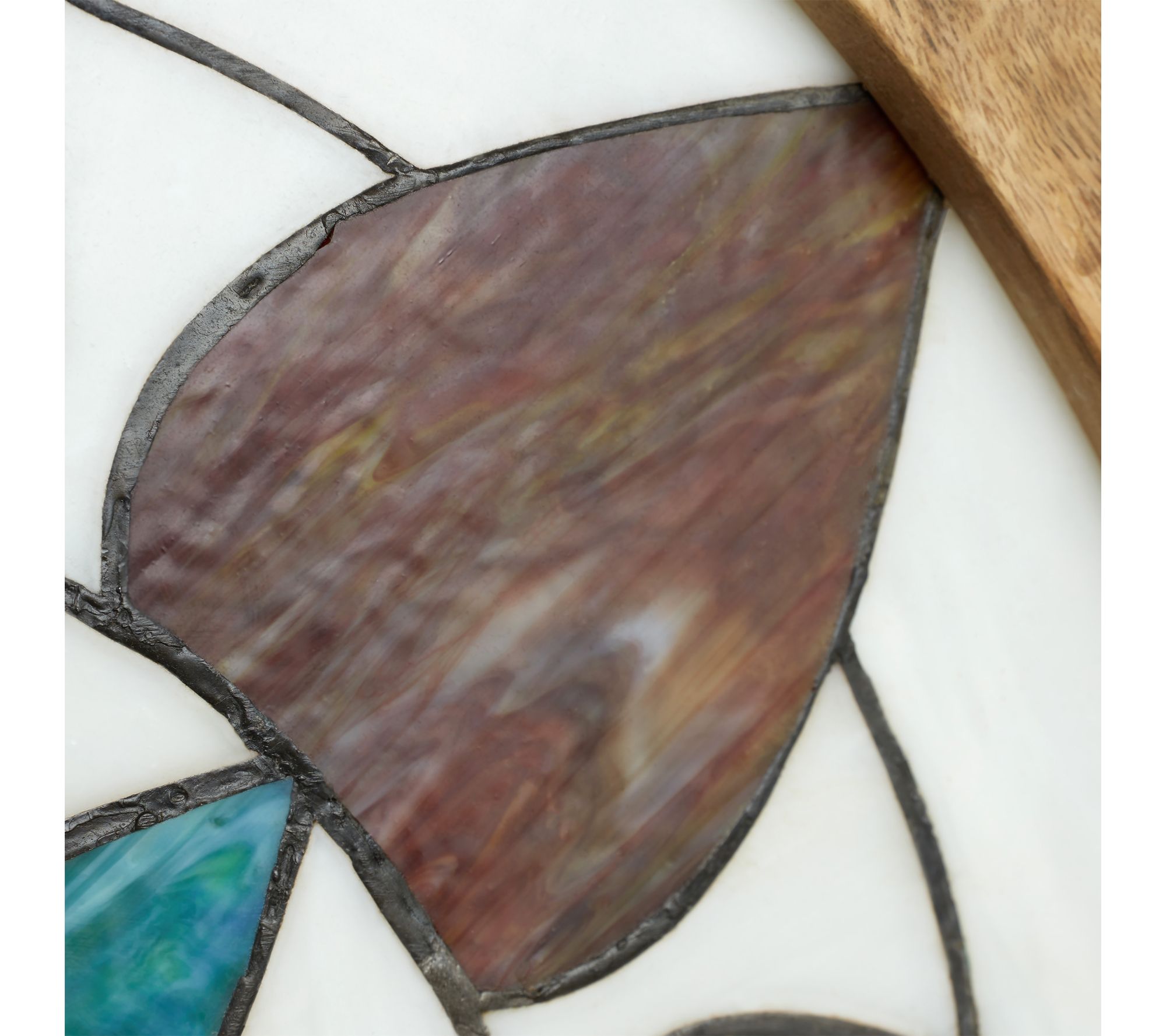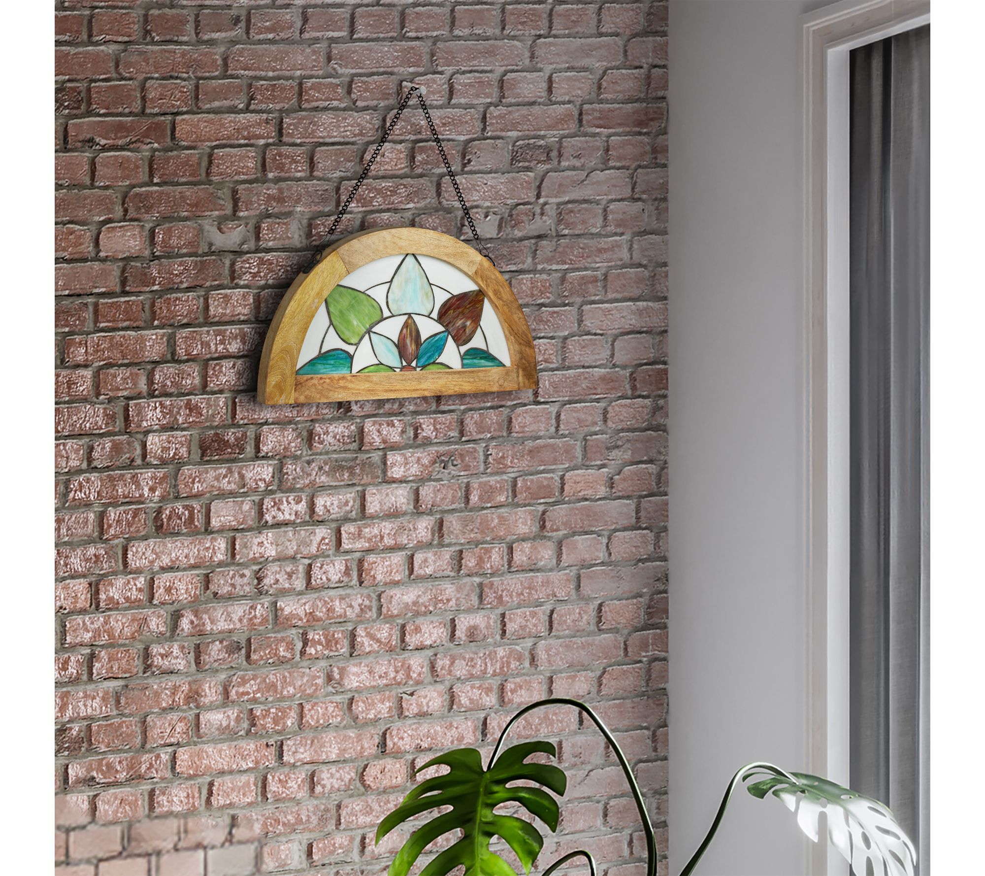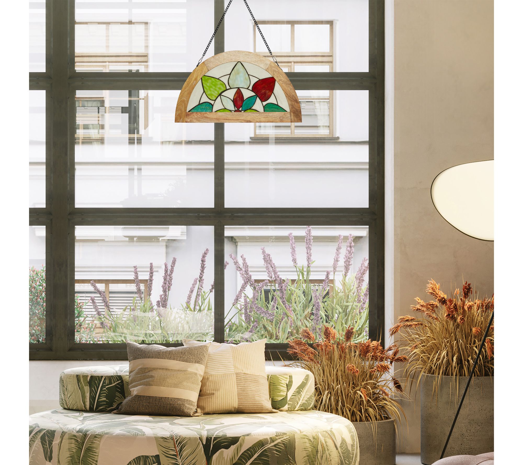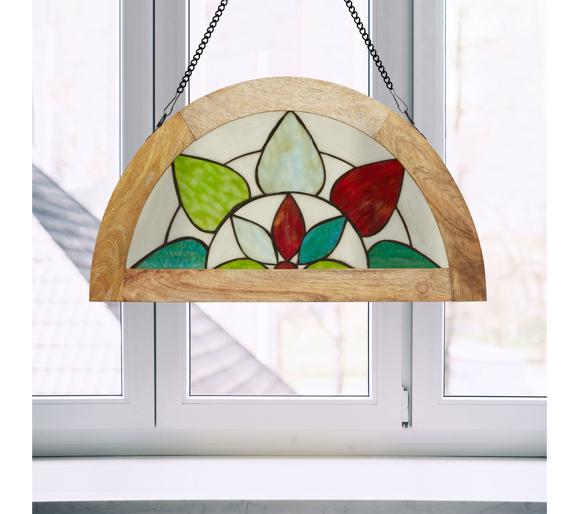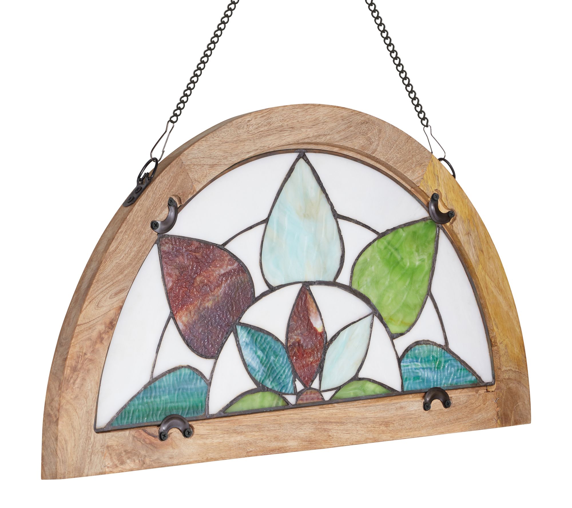 Infuse your home with vibrant color when you display this stained glass panel near a window or in your favorite nook. Tiffany-style craftsmanship brings delicate floral and geometric patterns to life in rich aqua, green, red, and white hues. Designed for effortless hanging, this decorative accent shines bright year-round. From River of Goods.
