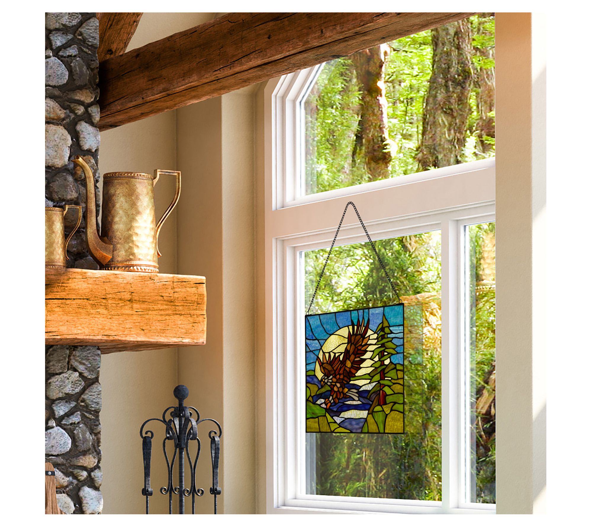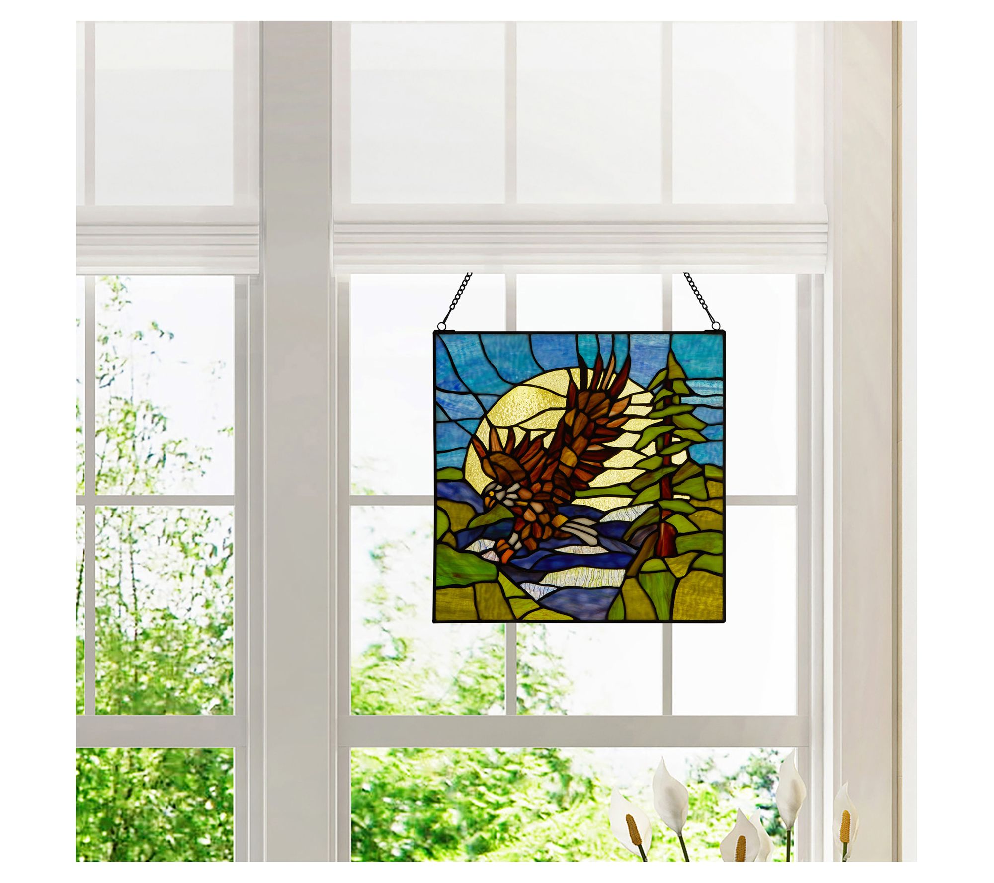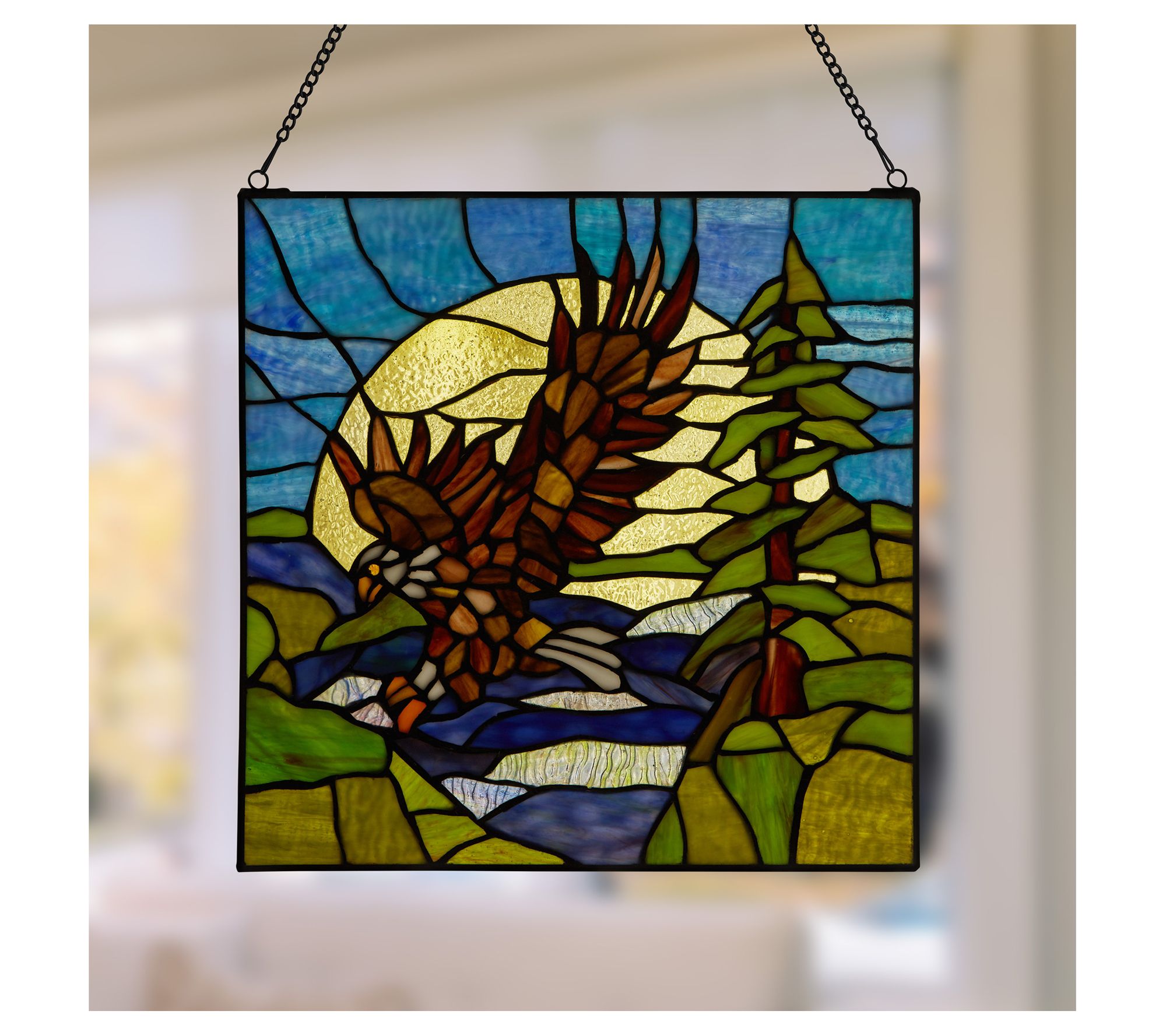 The majestic beauty of the bald eagle is depicted in rich detail and vibrant color in this stunning stained glass window panel. From River of Goods.