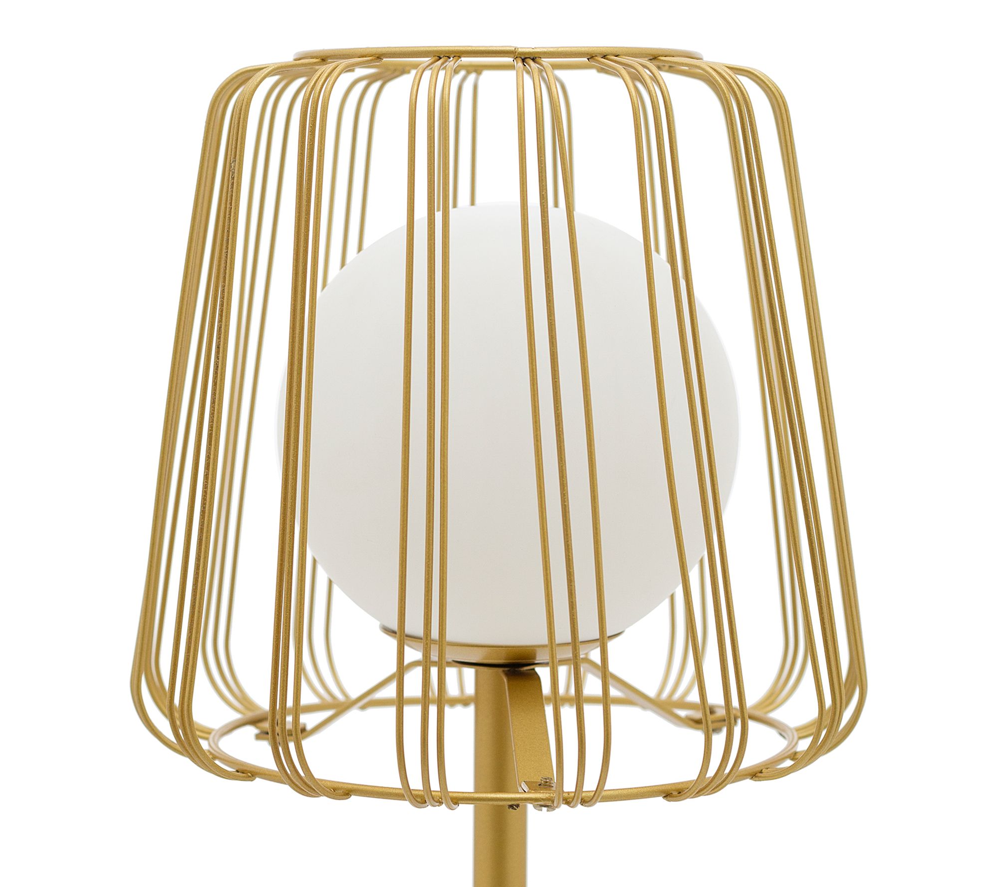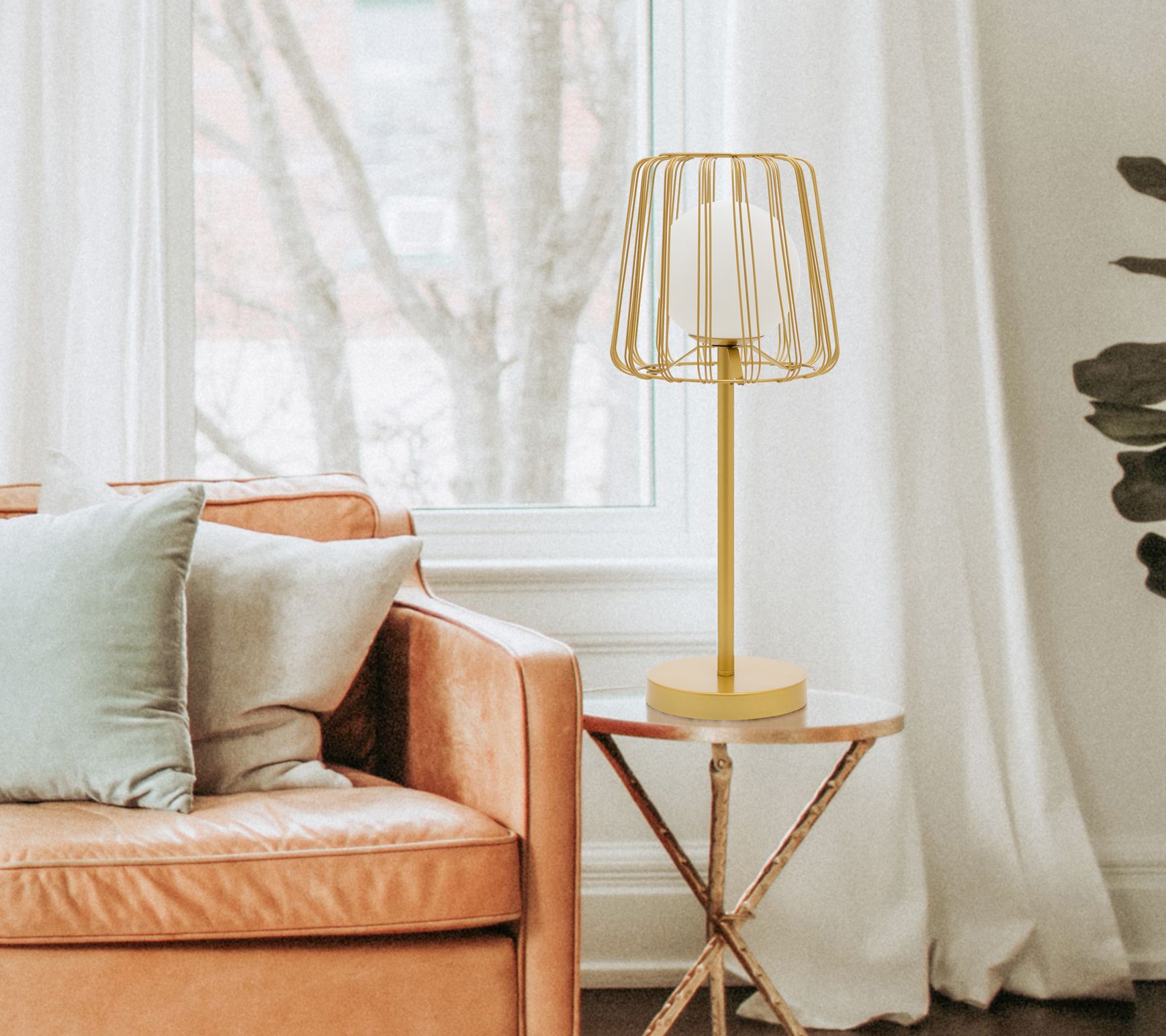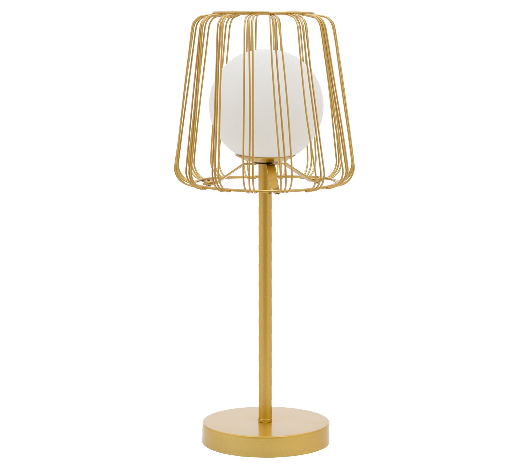 With its white frosted glass shade encased in a goldtone metal cage, the Lucas table lamp adds intrigue and elegance to any space. From River of Goods.