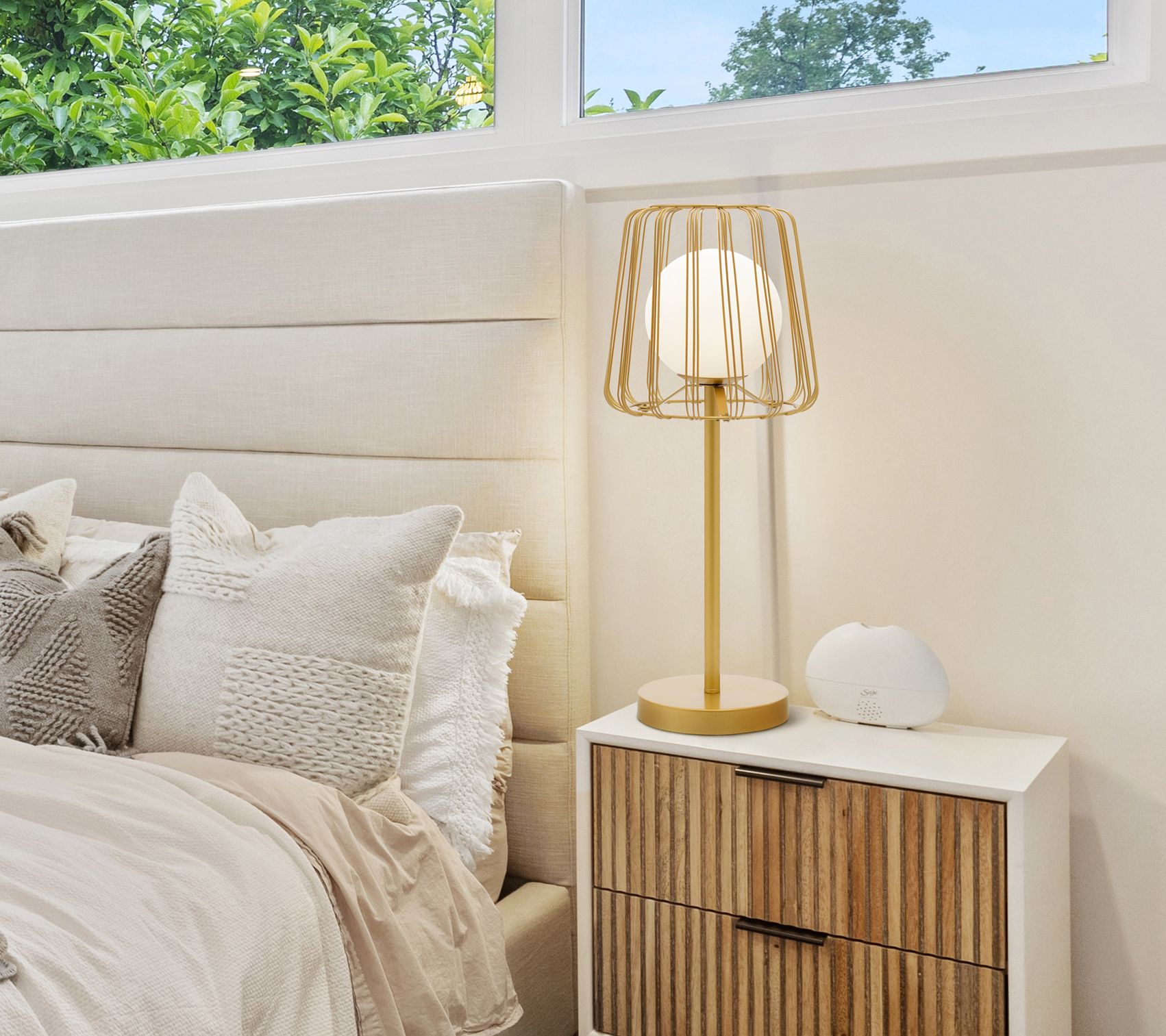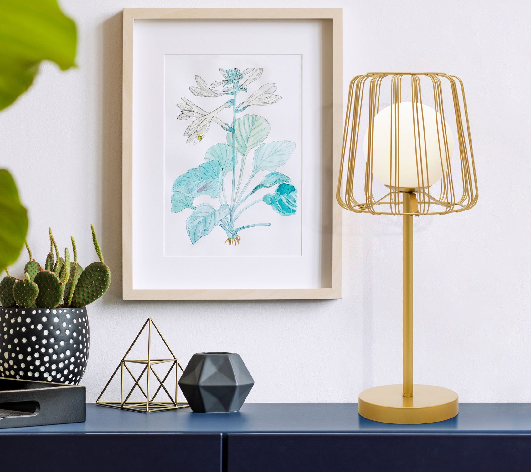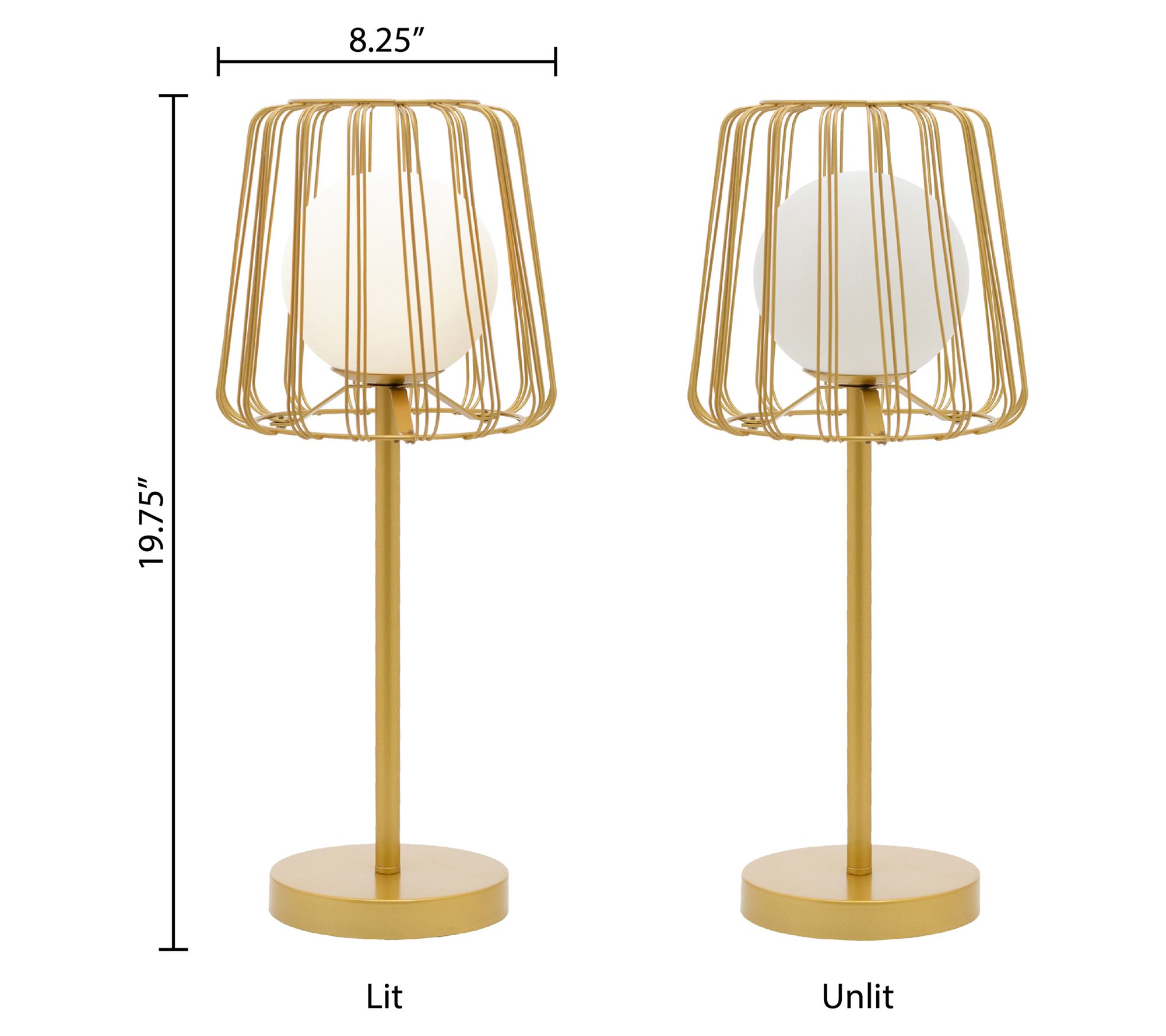 With its white frosted glass shade encased in a goldtone metal cage, the Lucas table lamp adds intrigue and elegance to any space. From River of Goods.