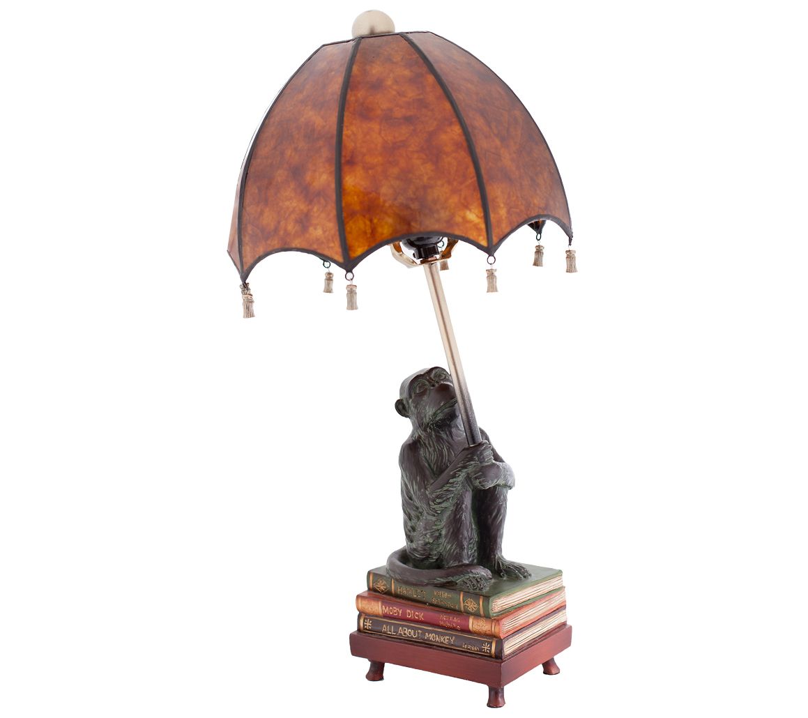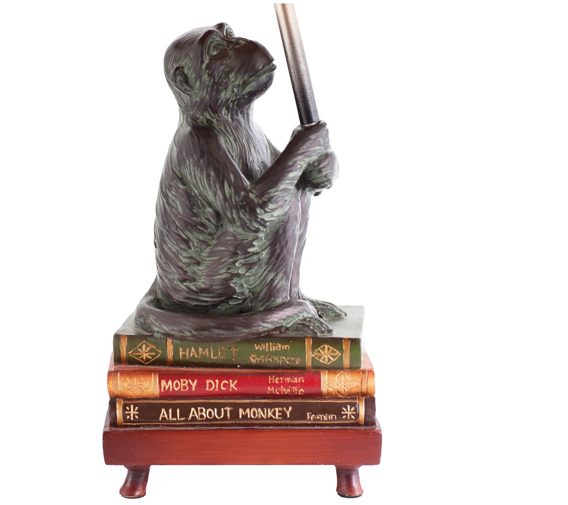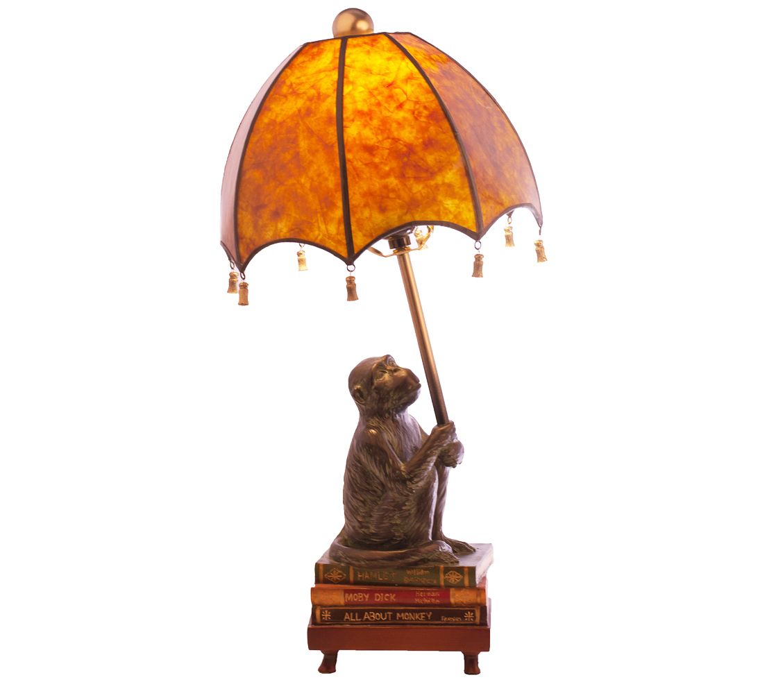 What a conversation-starter. A very erudite creature, this monkey is sitting on well-known works of Shakespeare and Melville, keeping them dry with his Mica umbrella. Shower your home with this whimsical novelty lamp, a perfect accent for a study, home office, or living room. From River of Goods.