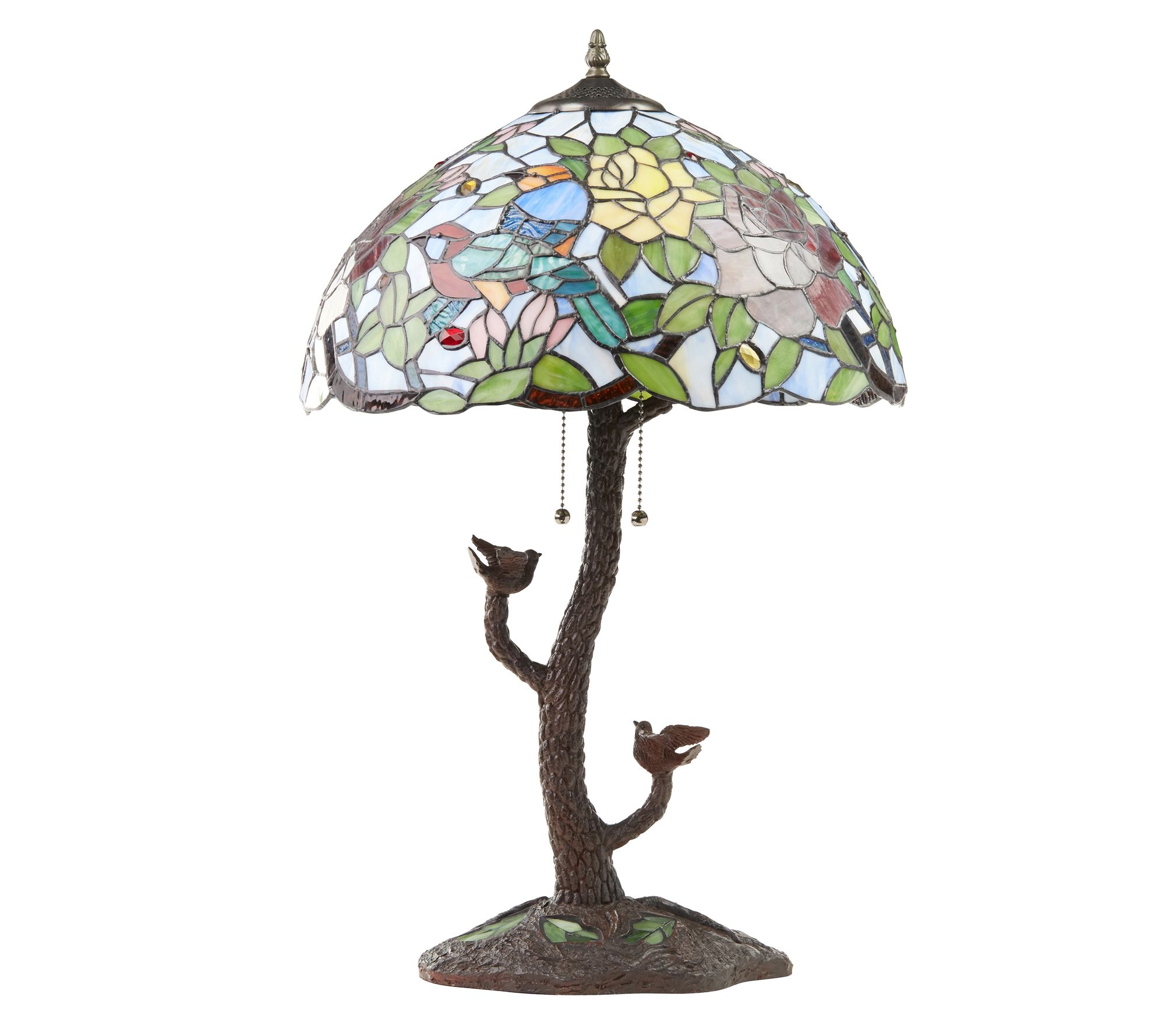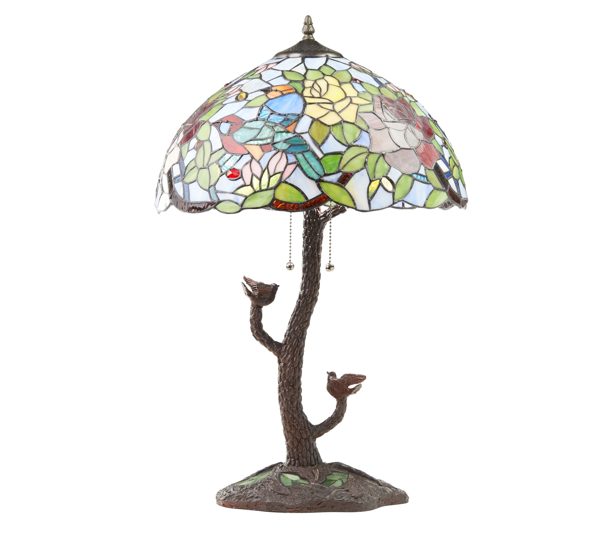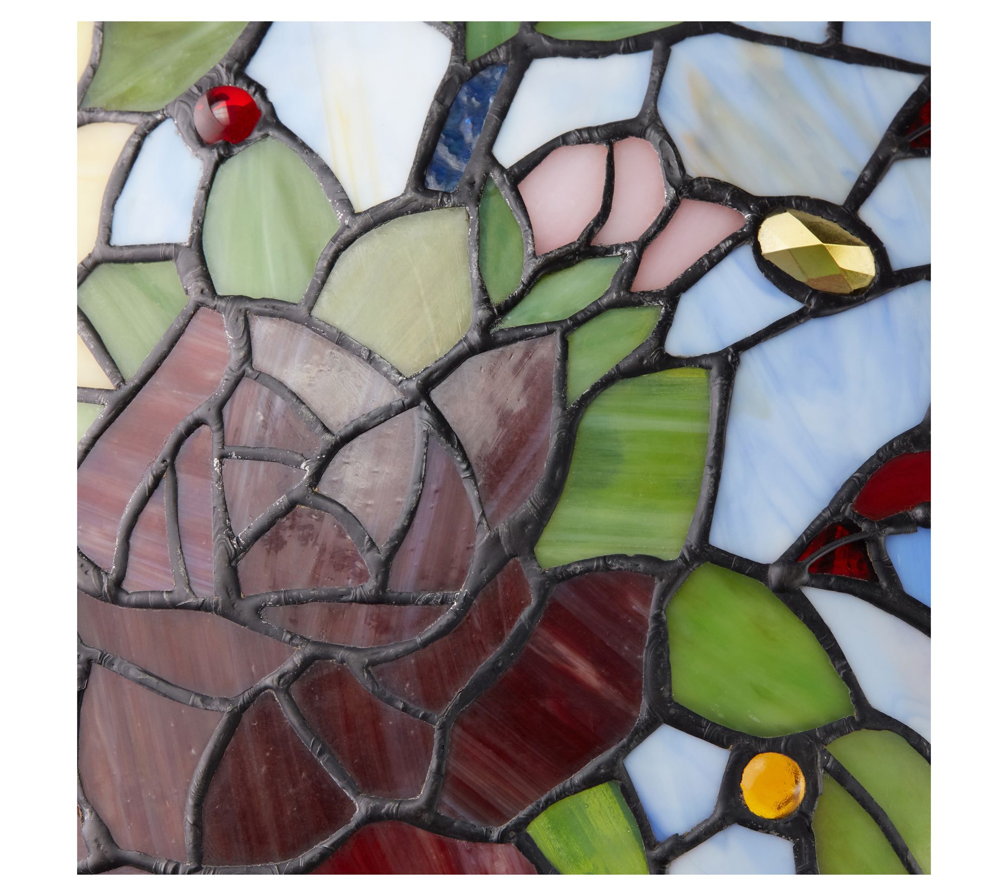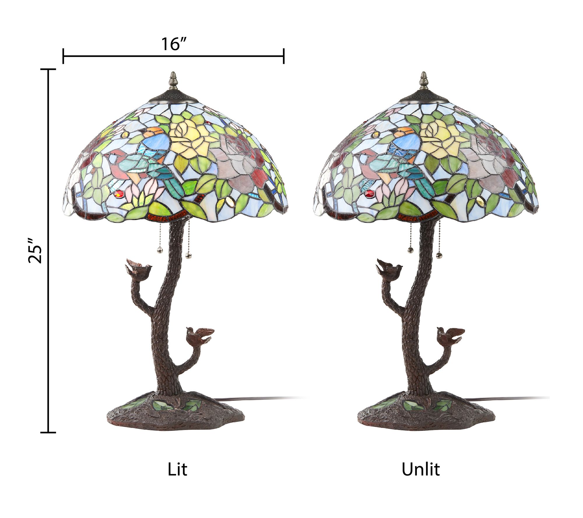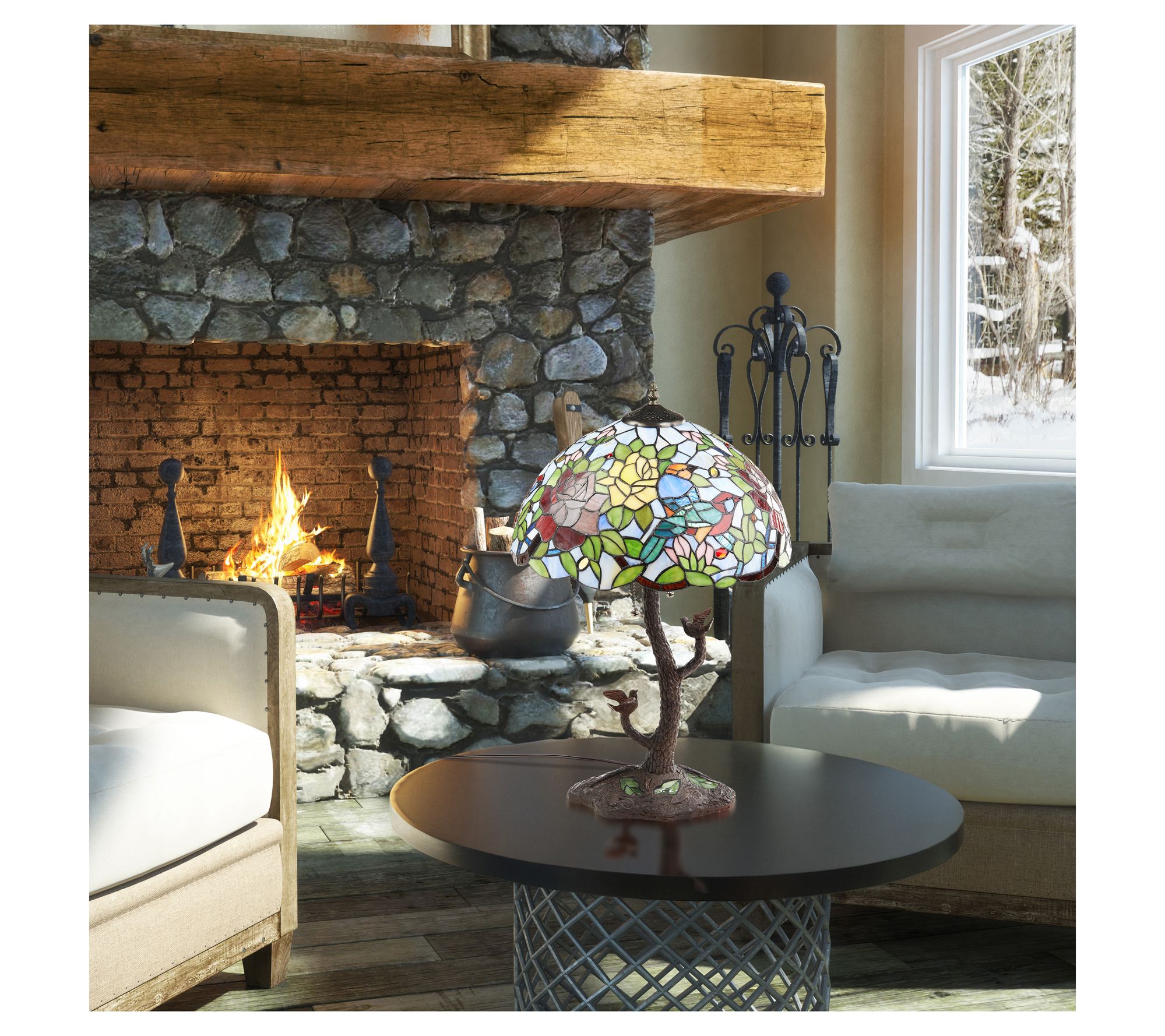 Enhance your living space with the River of Goods Phylicia Dome Stained Glass Table Lamp. Its base features intricate branches, birds, and green leaves bringing a touch of nature indoors. The dome shad beautifully depicts roses and birds, adding a timeless elegance to any room. Perfect for residential or non-residential use, this lamp offers an artistic flair while providing functional lighting. From River of Goods.