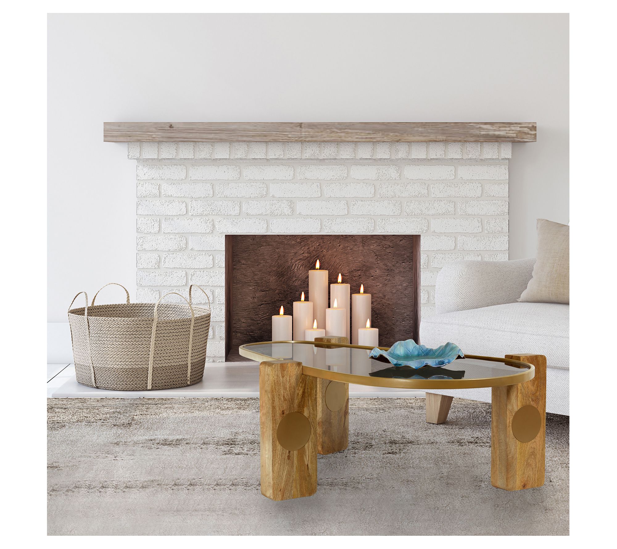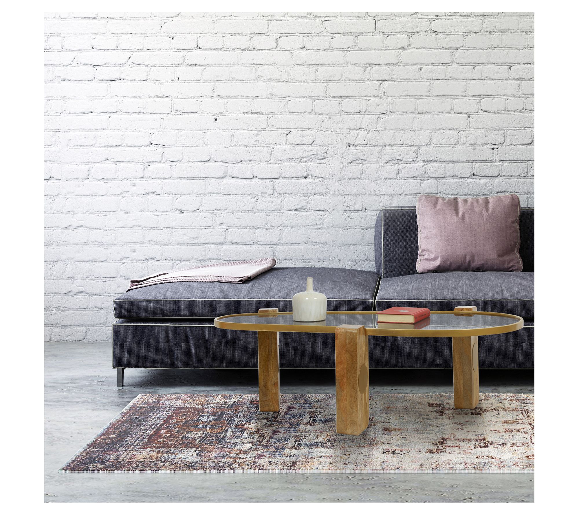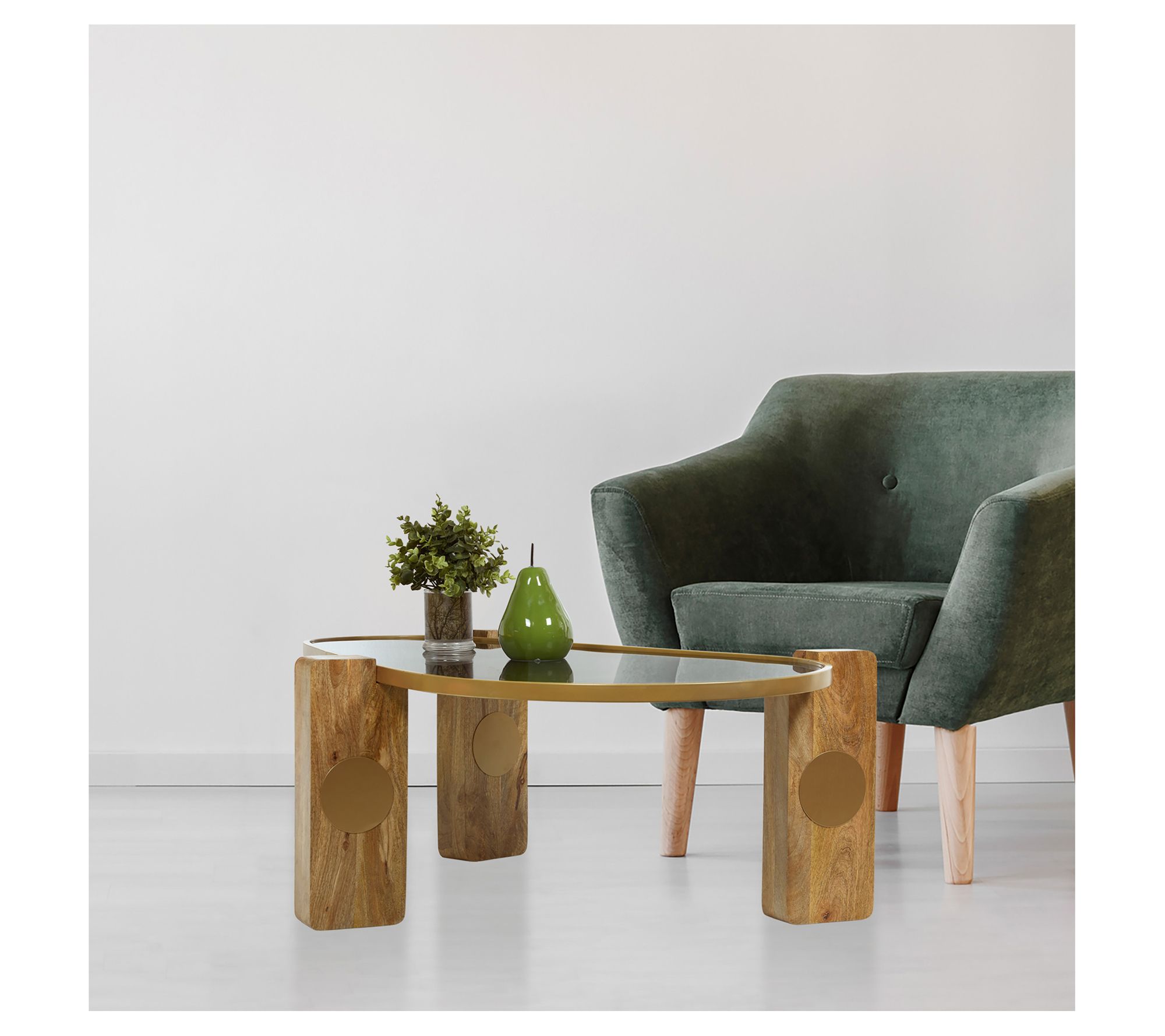 Complete your living room with the ultra-modern effect of this mixed media coffee table featuring a curvy glass top supported on solid wood legs. From River of Goods.