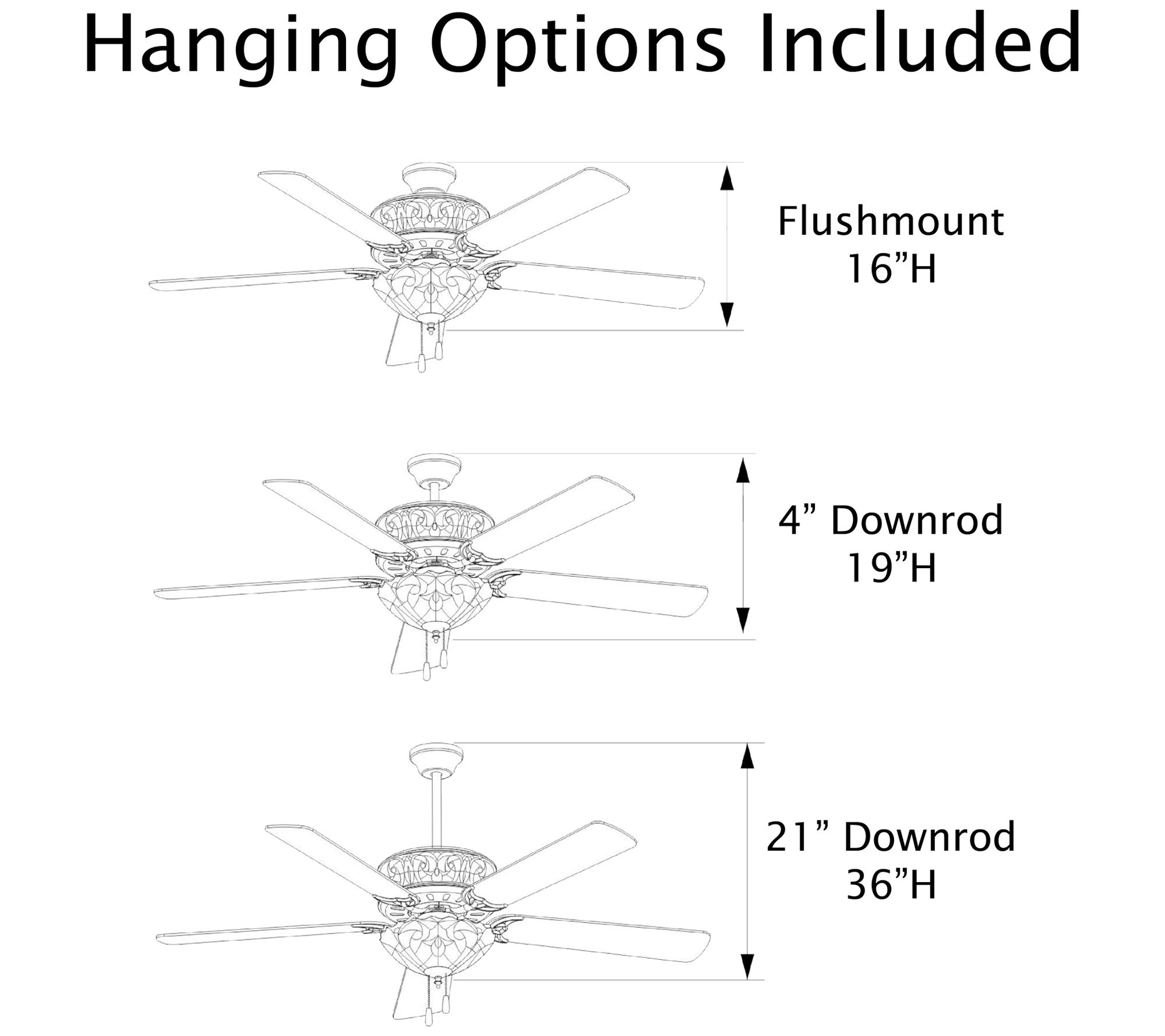 • Includes ceiling fan, 4" down rod, 21" down rod, two dimmable 6W/40W LED light bulbs, four dimmable 1W/15W incandescent light bulbs, and remote control