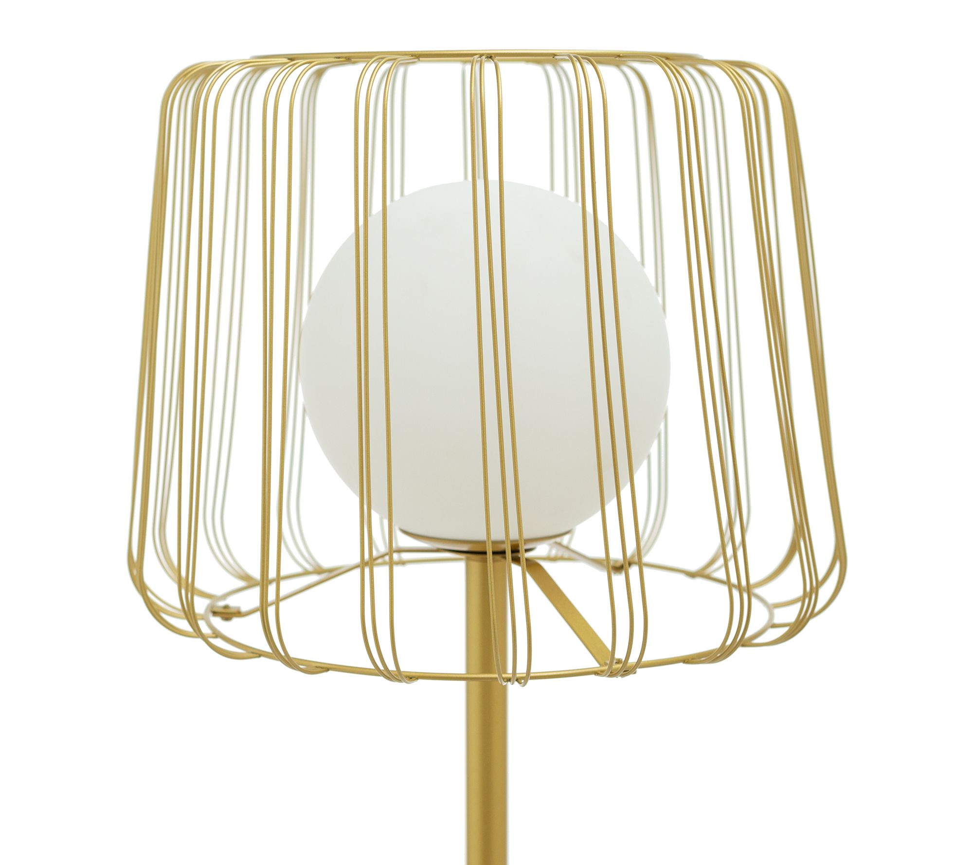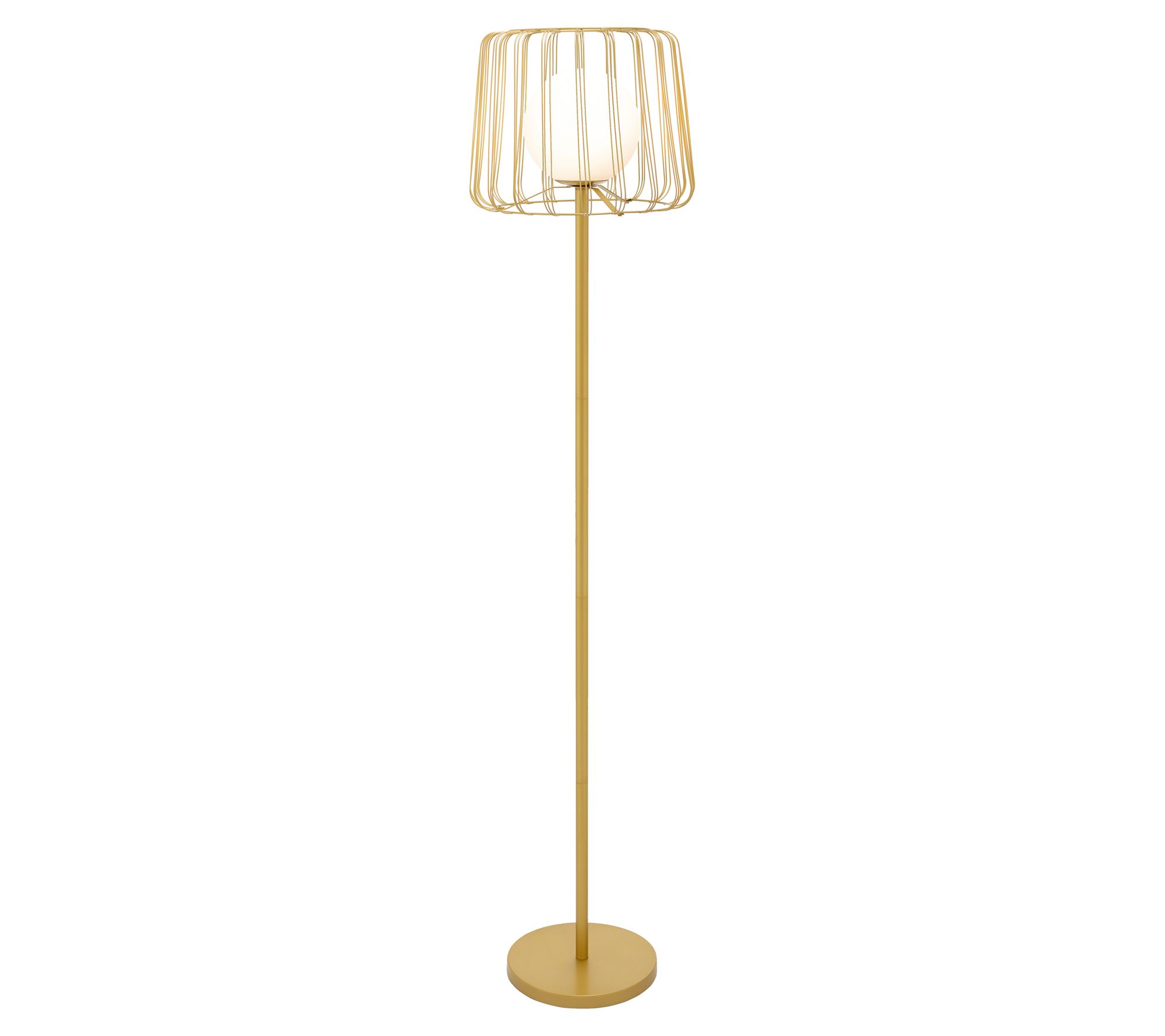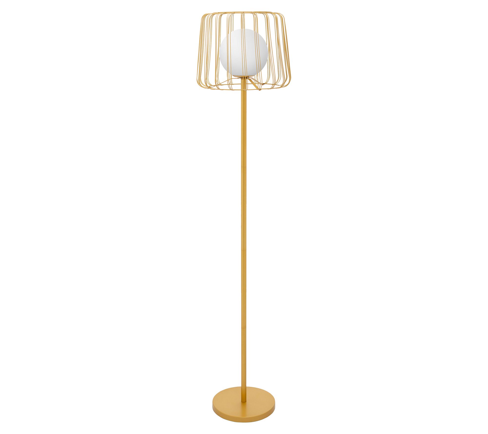 Showcasing a white frosted glass shade encased in a goldtone metal cage, the Lucas floor lamp brings an elegant focal point to any space. From River of Goods.