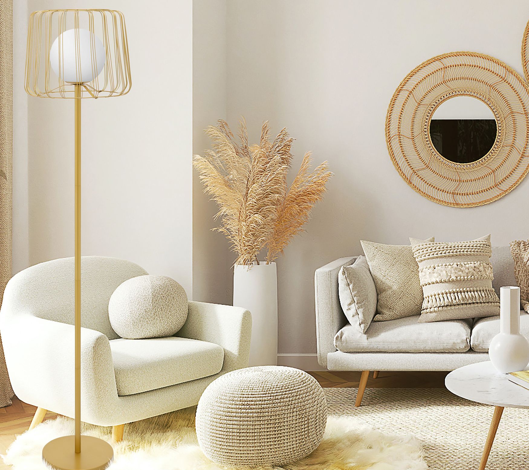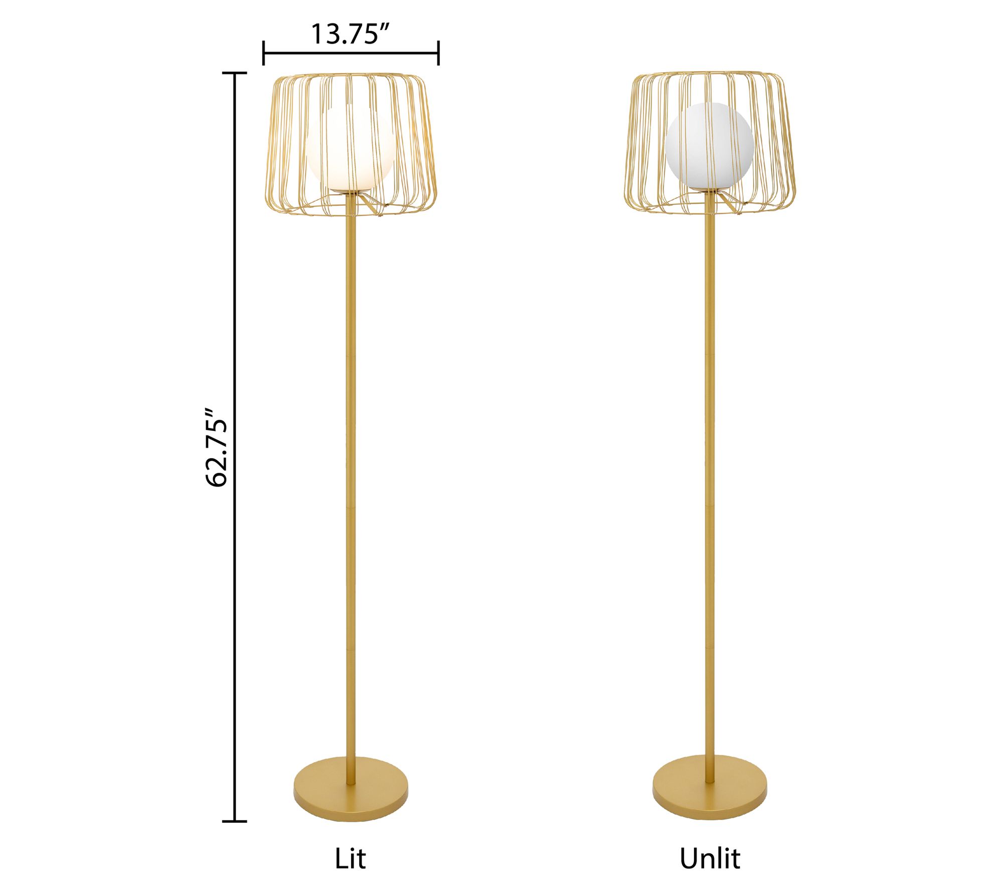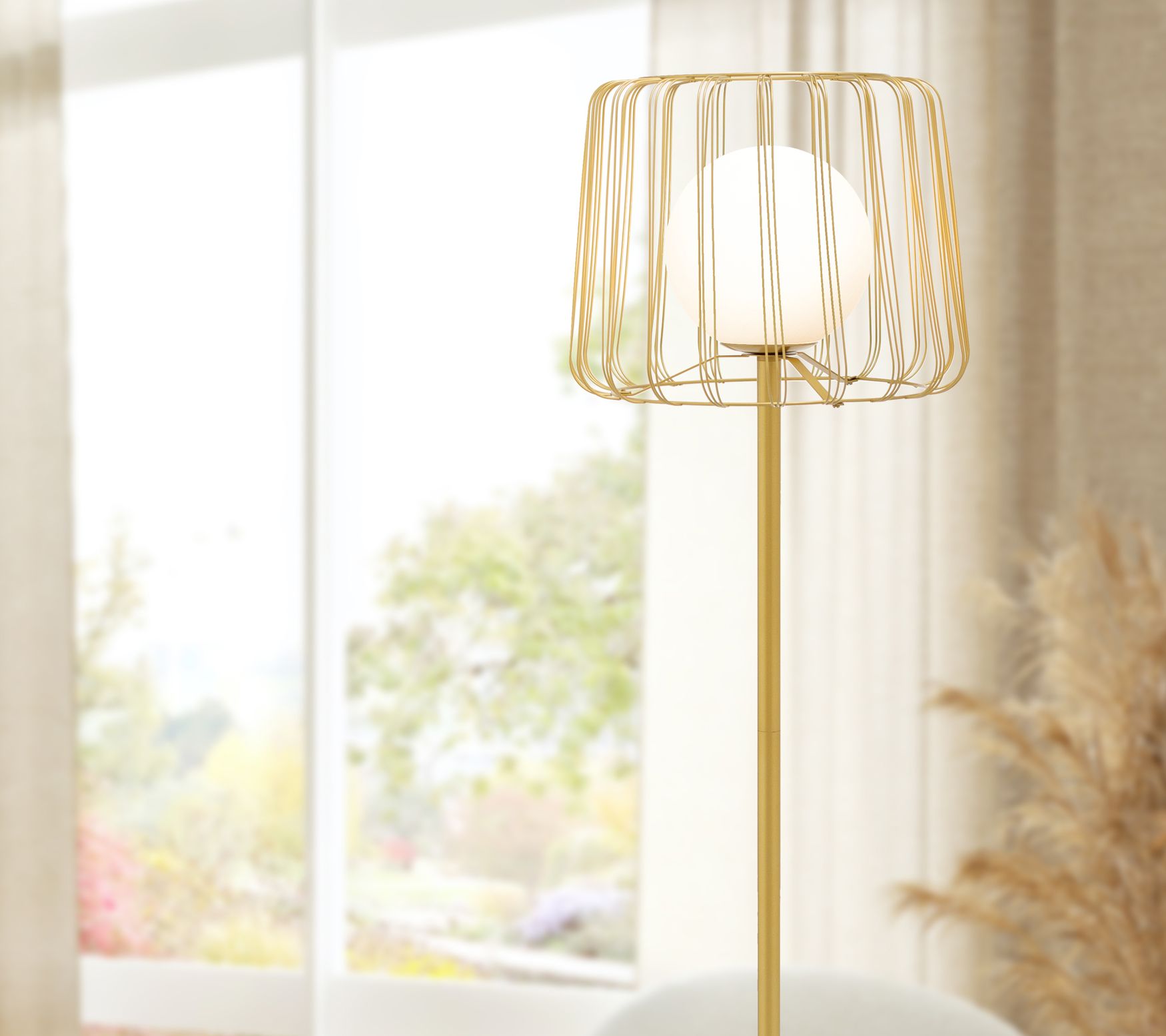 Showcasing a white frosted glass shade encased in a goldtone metal cage, the Lucas floor lamp brings an elegant focal point to any space. From River of Goods.