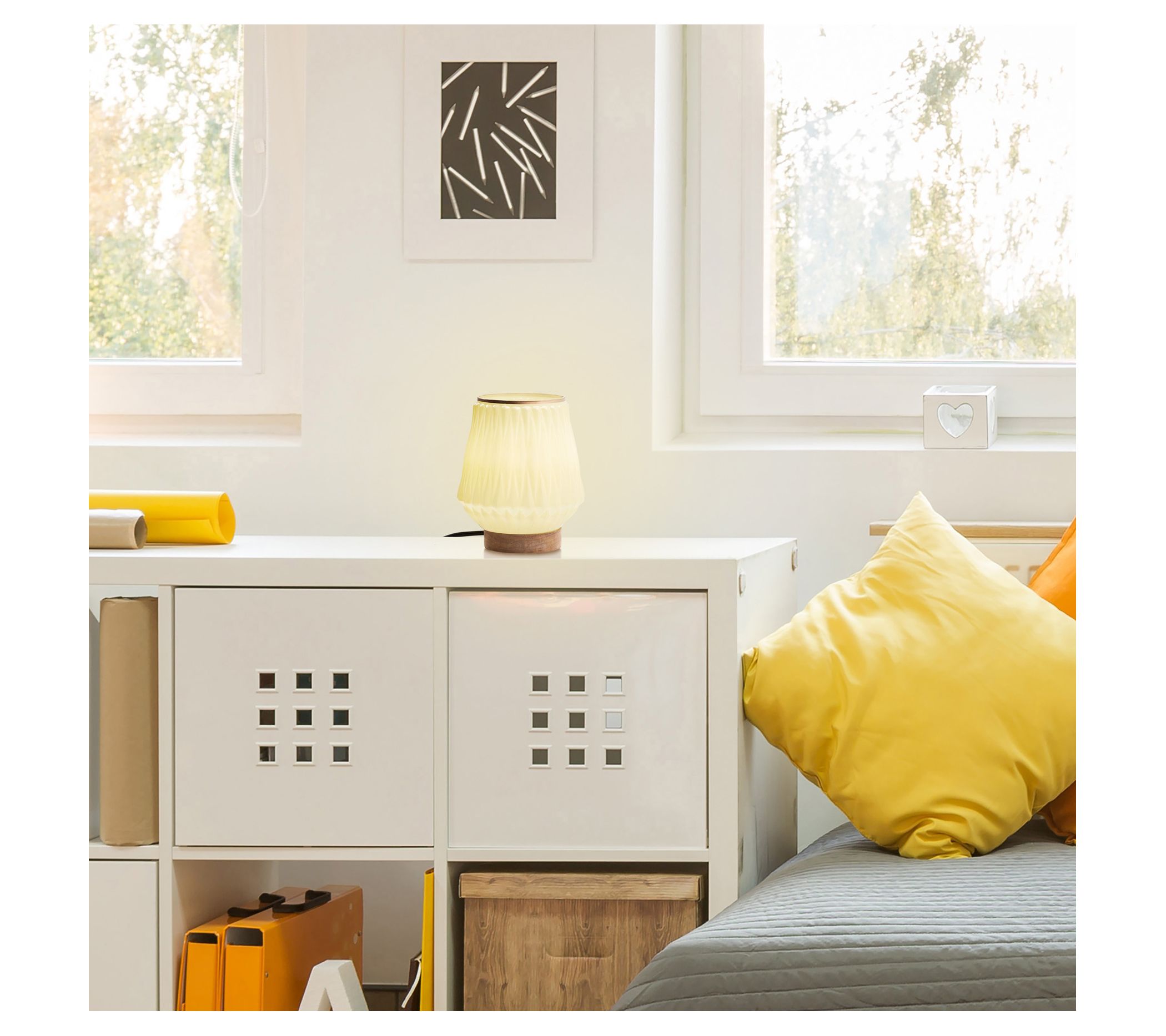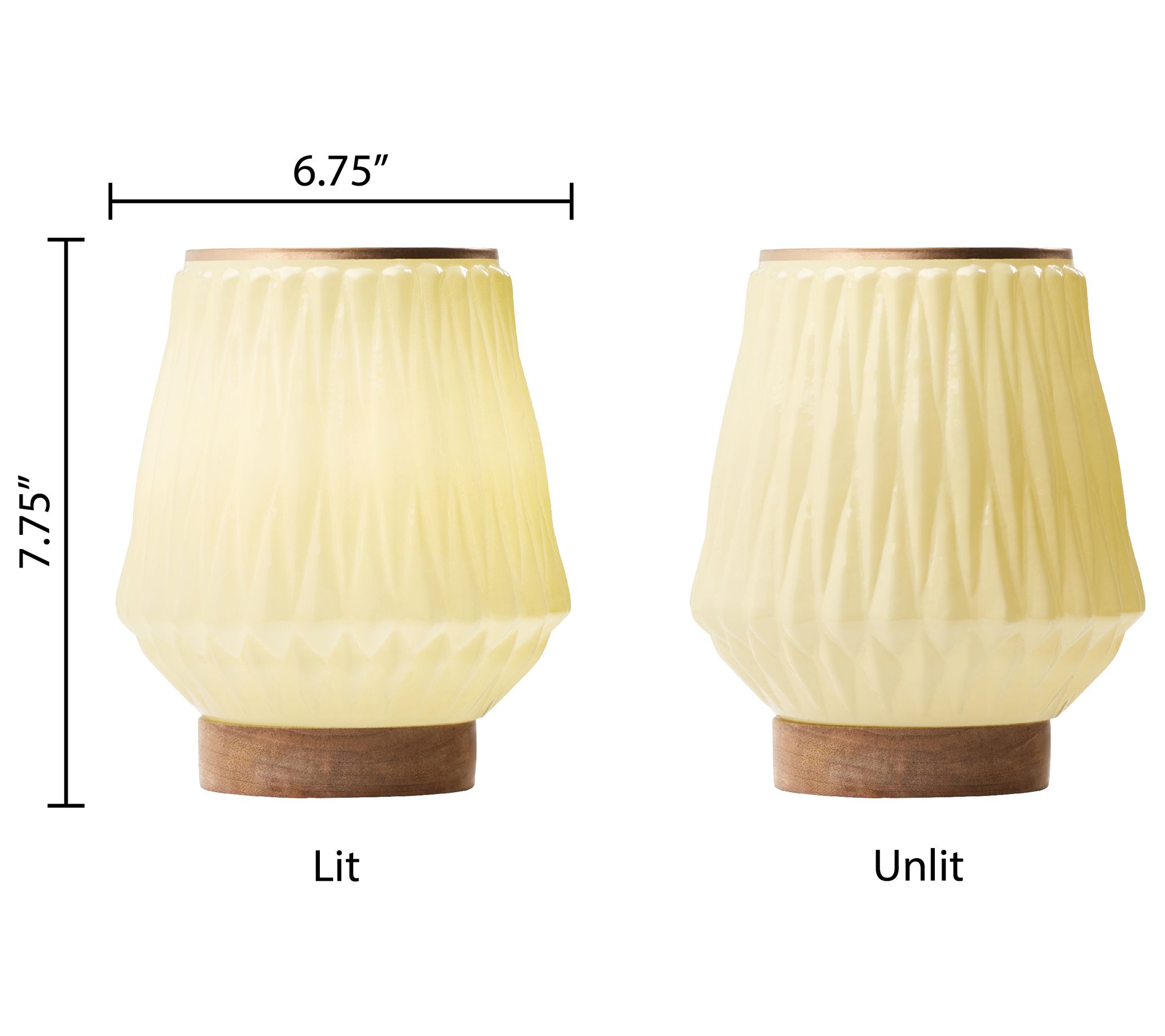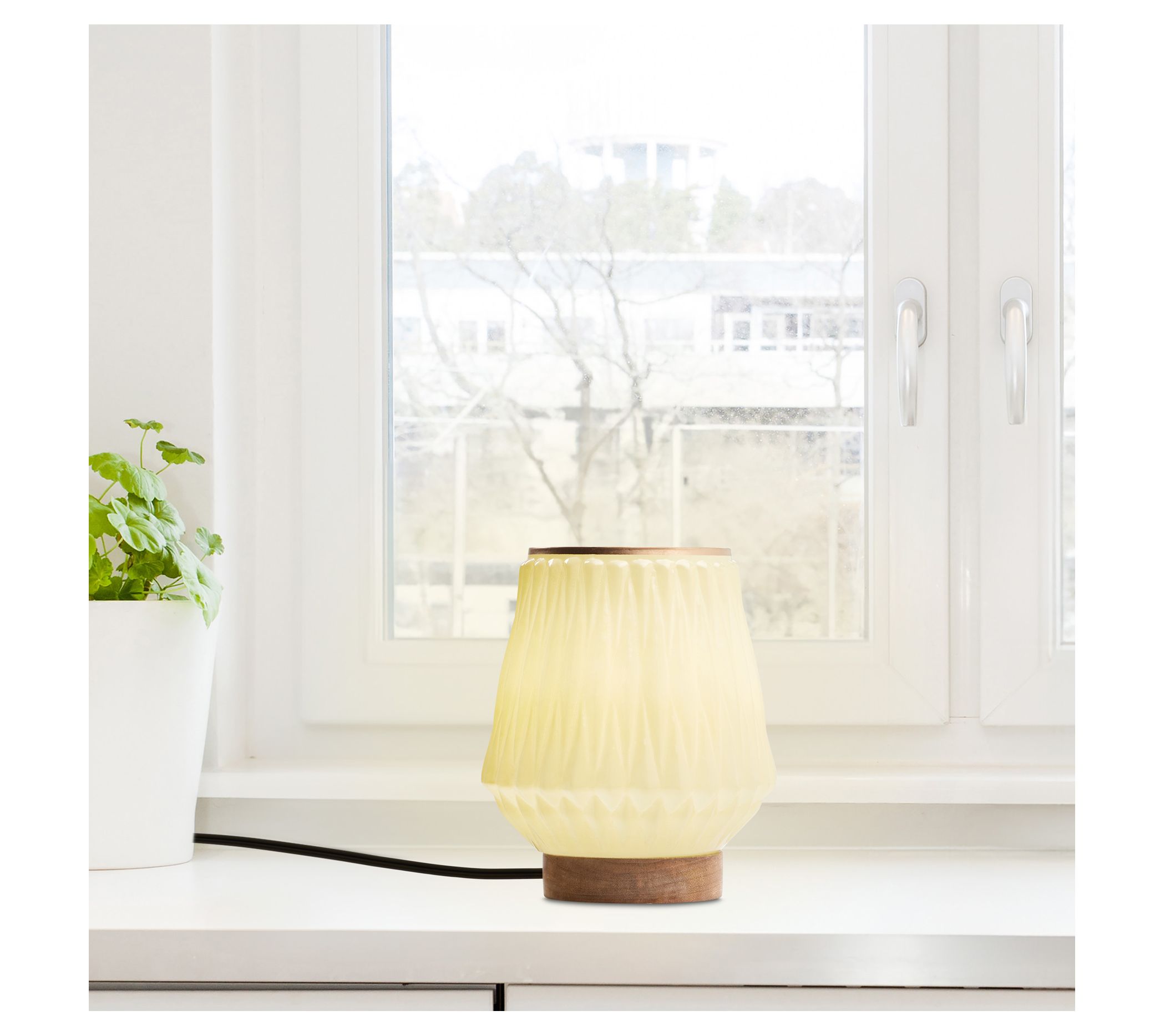 Add a splash of retro radiance to your living space with this accent lamp. Featuring a unique block-shaped mango wood base and a yellow gold-tinted trapezoid glass shade, this lamp gives off a warm, inviting glow. From River of Goods.