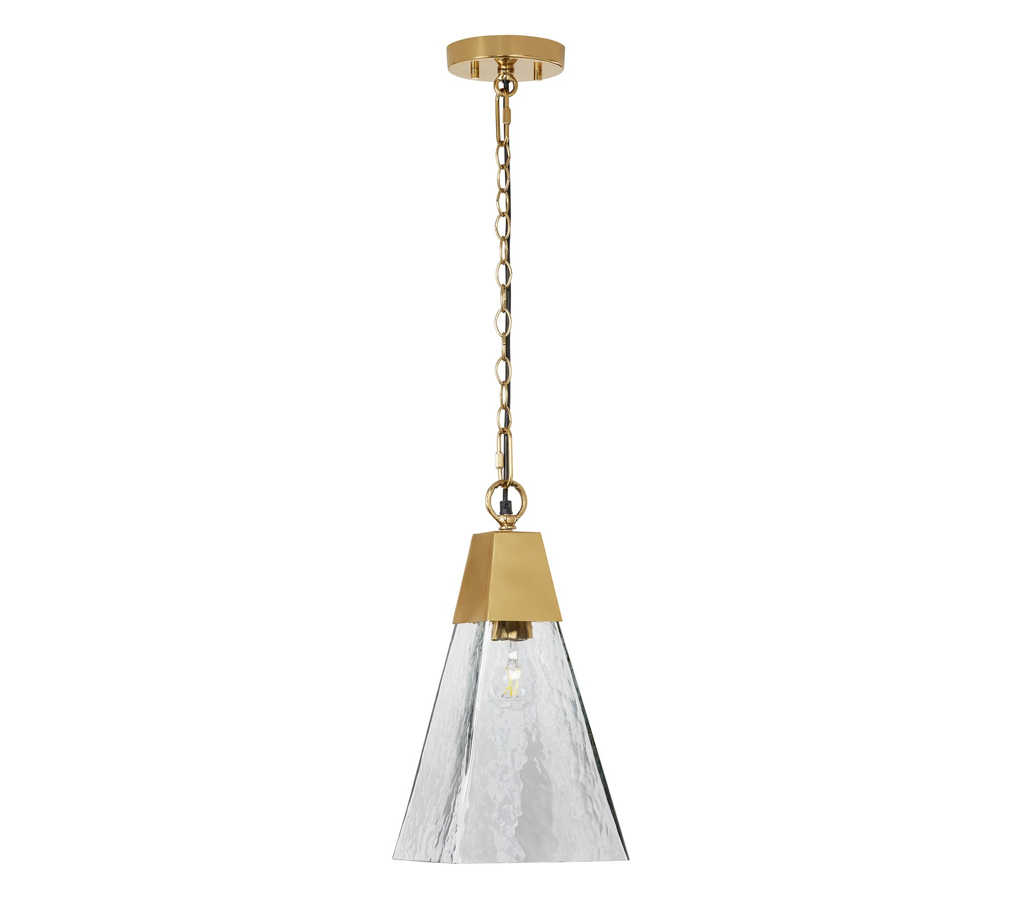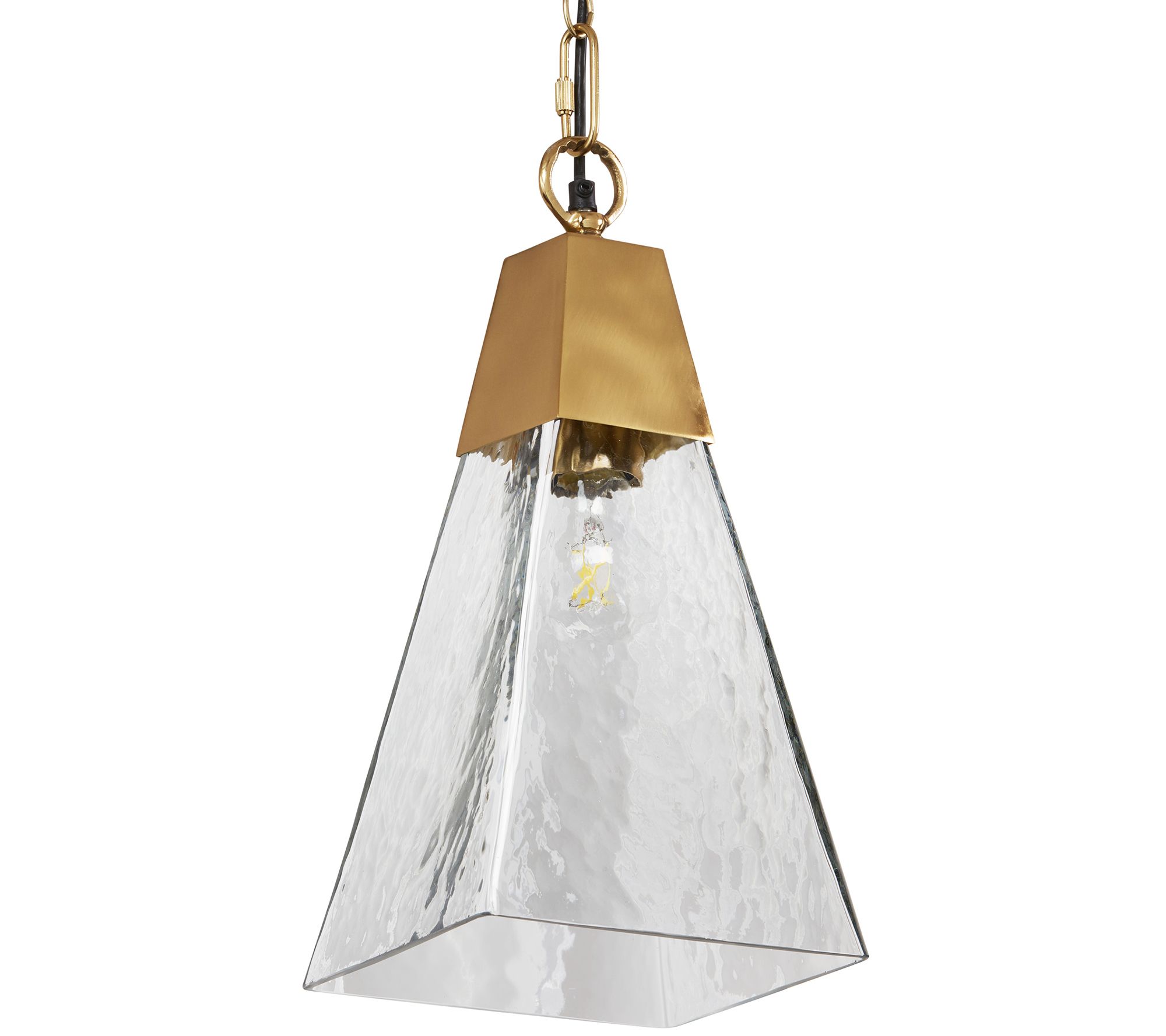 Make a statement in your home with this ornate metal pendant light, boasting a cone-shaped textured clear glass shade that allows light to shine through, providing multidirectional illumination when hardwired into your bedroom or living room ceiling. From River of Goods.