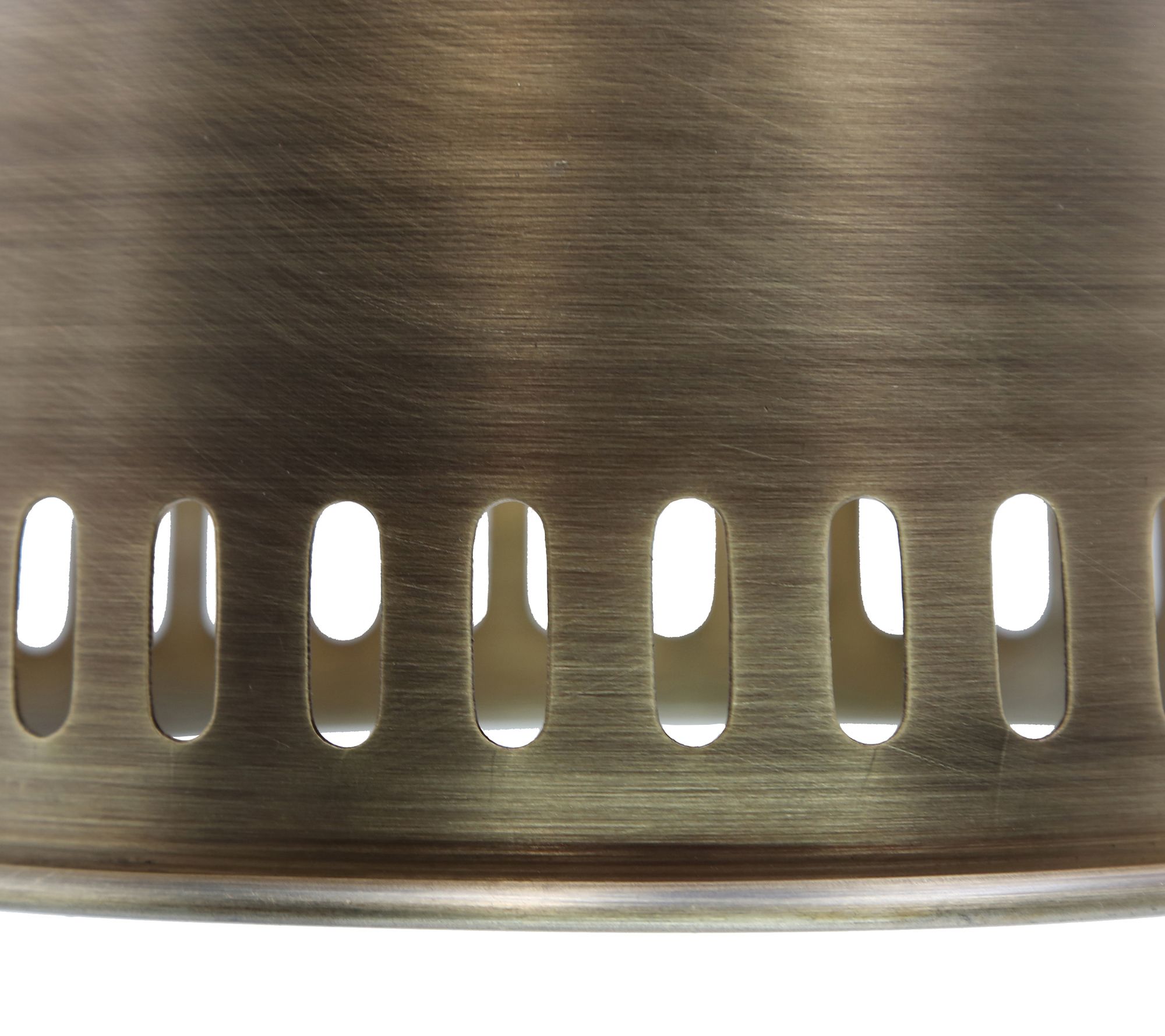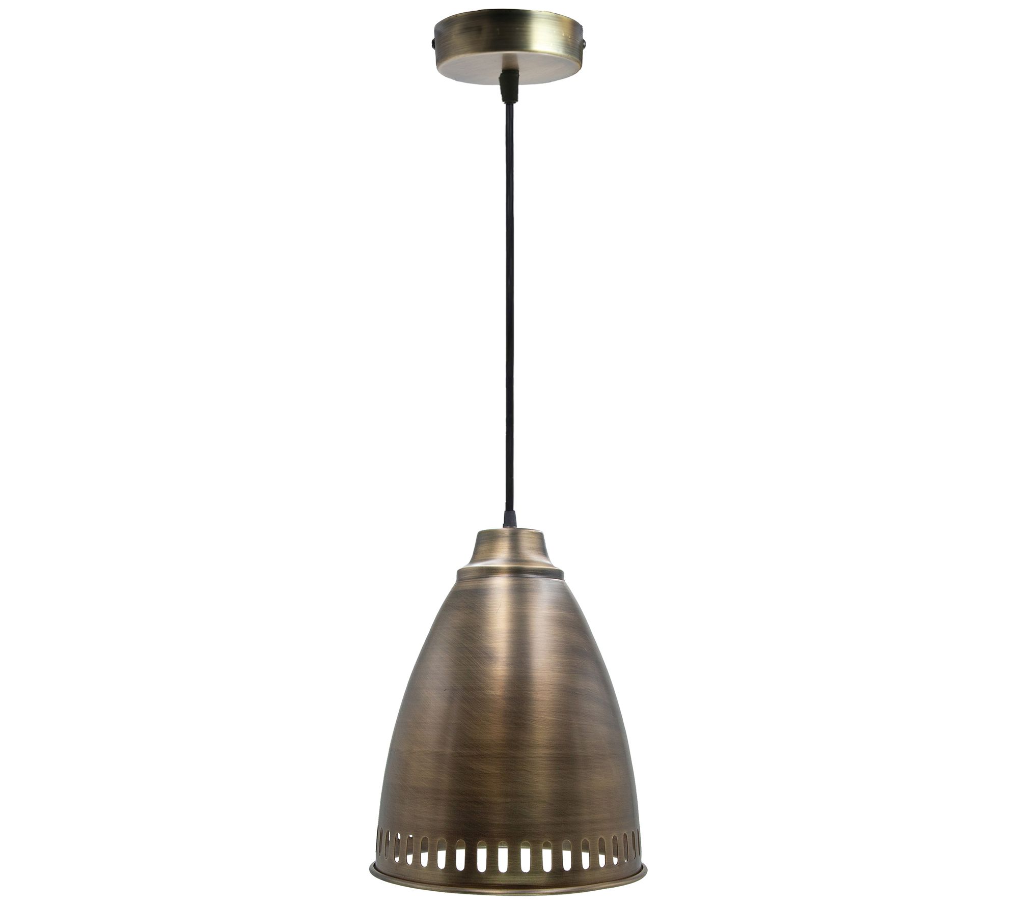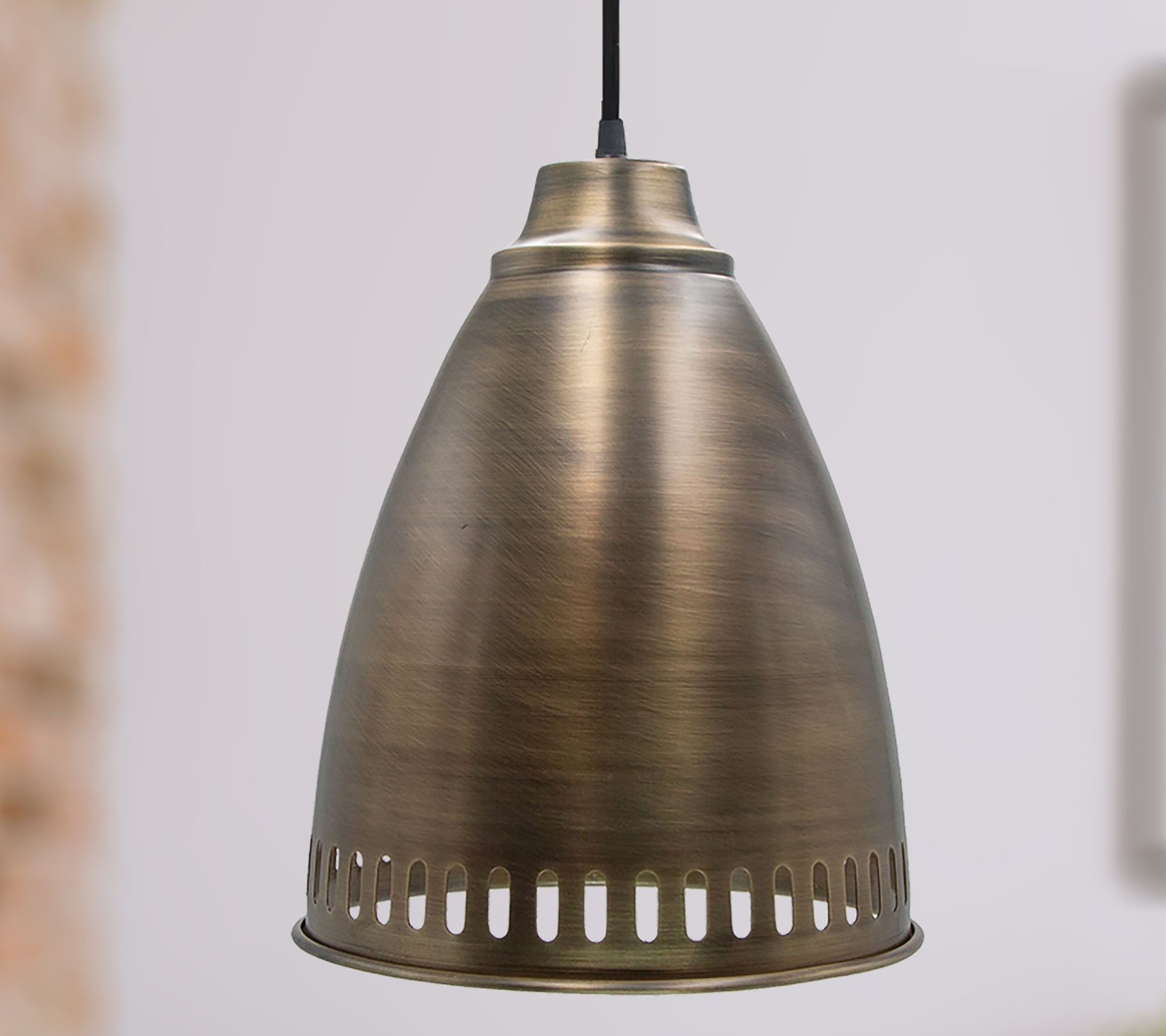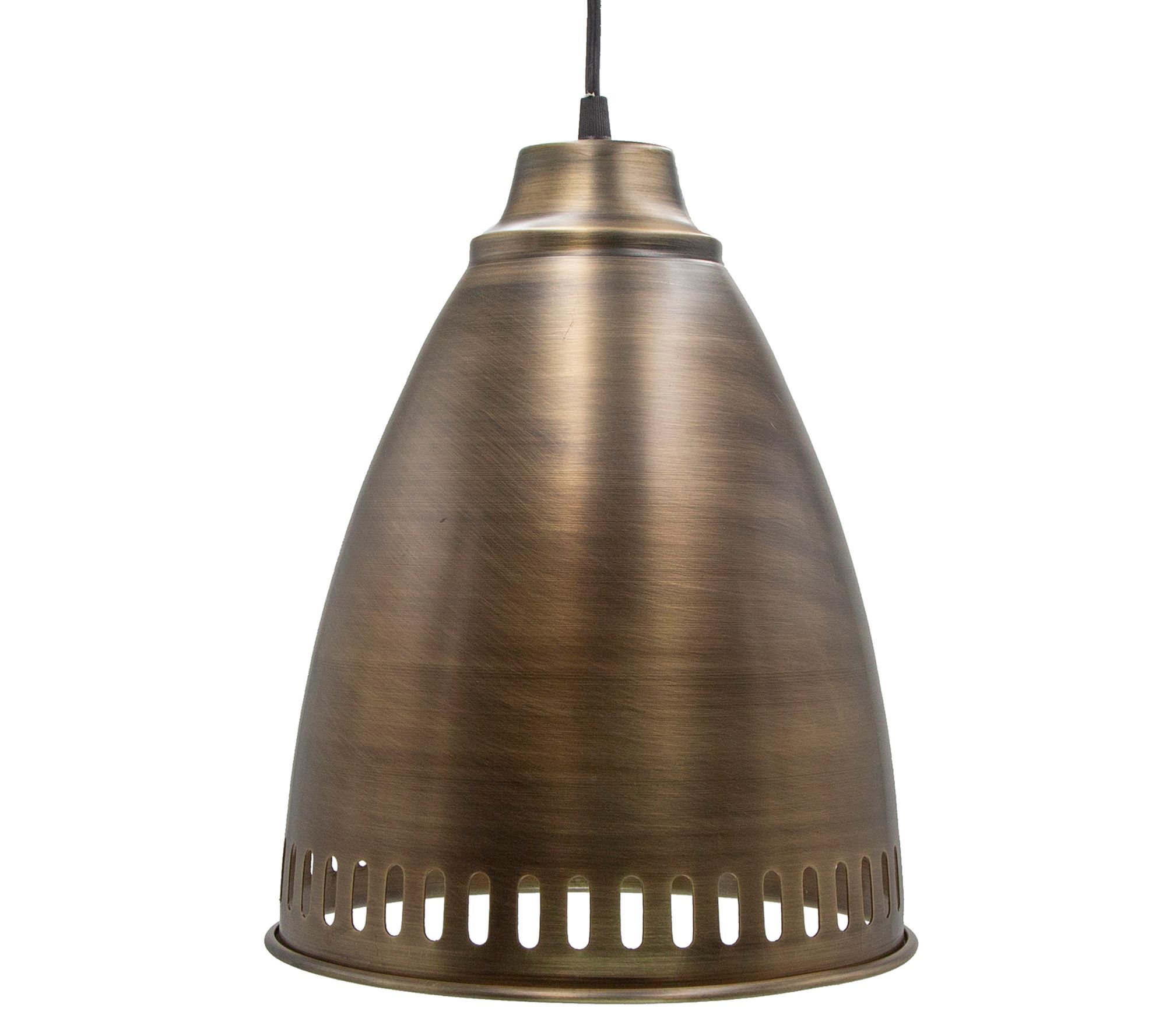 Accent your kitchen or dining room with this pierced brushed metal cone pendant light. It features a brushed brass finish and pierced metal rim to complement your decor. It's equipped with an adjustable hanging cord to accommodate any space. From River of Goods.