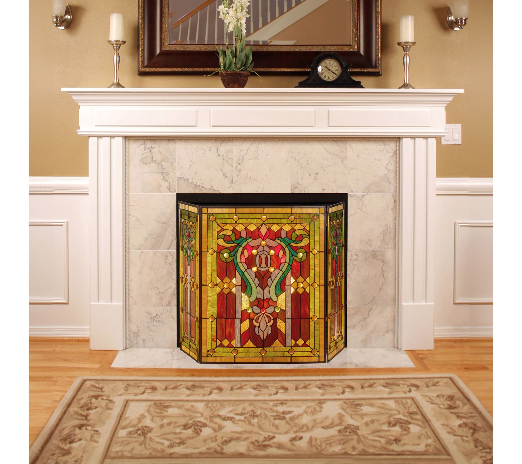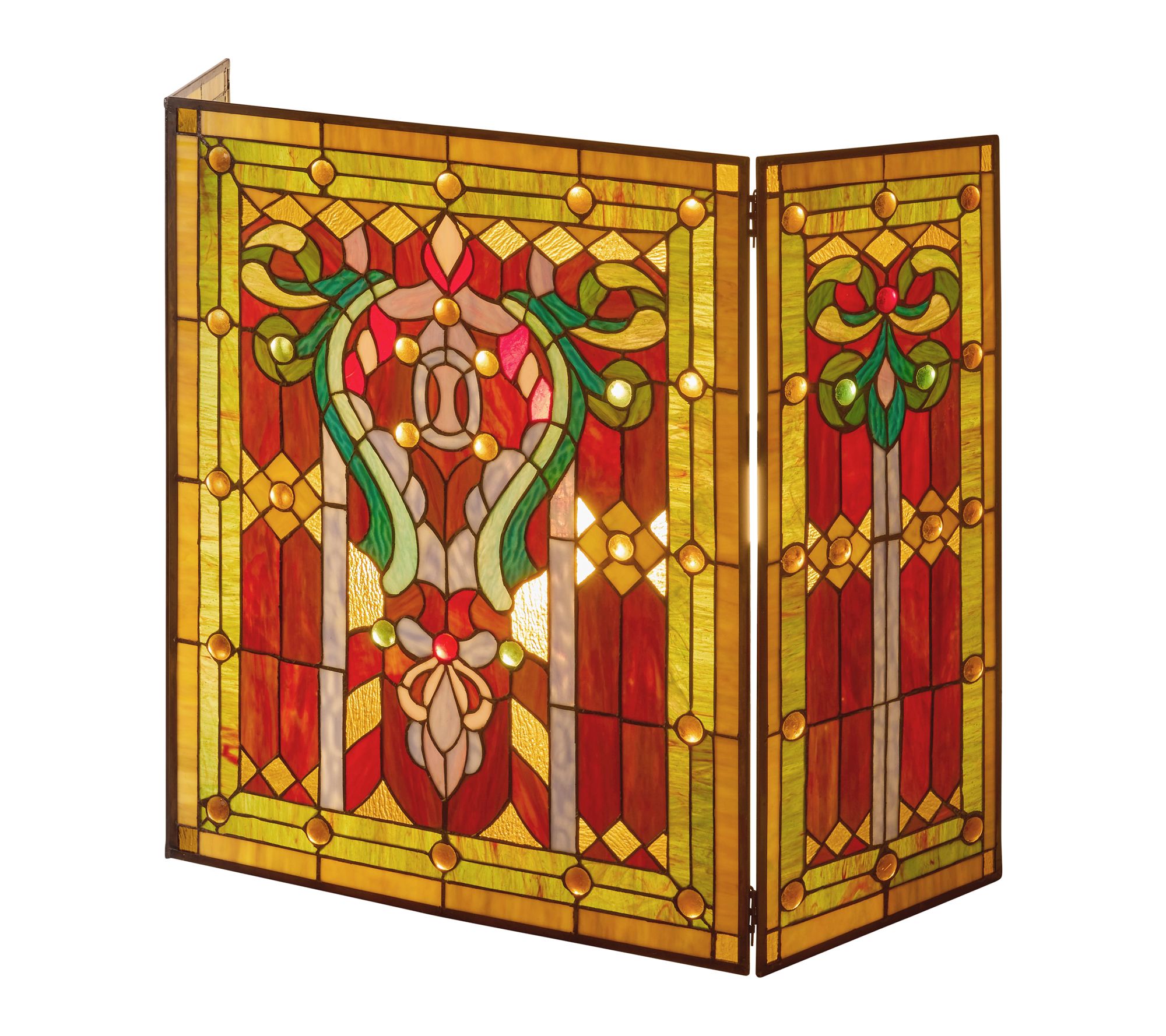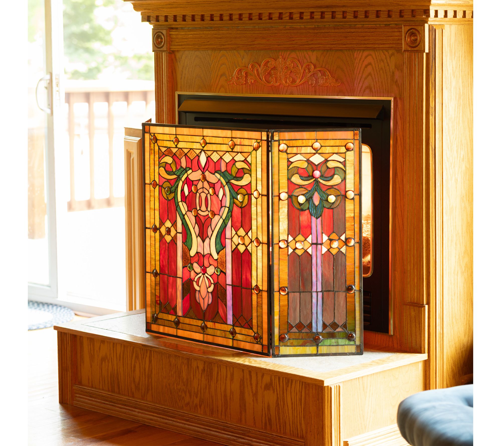 Create a warm, vivid focal point and bring timeless elegance to your living space with this stained glass fireplace screen. Rich red, green, blue, and yellow hues illuminate classic fleur de lis motifs, while 62 cabochon accents shimmer in the firelight for unforgettable ambience. From River of Goods.