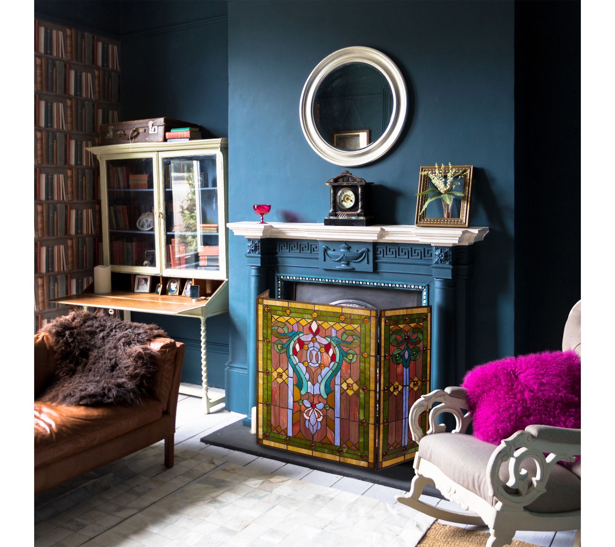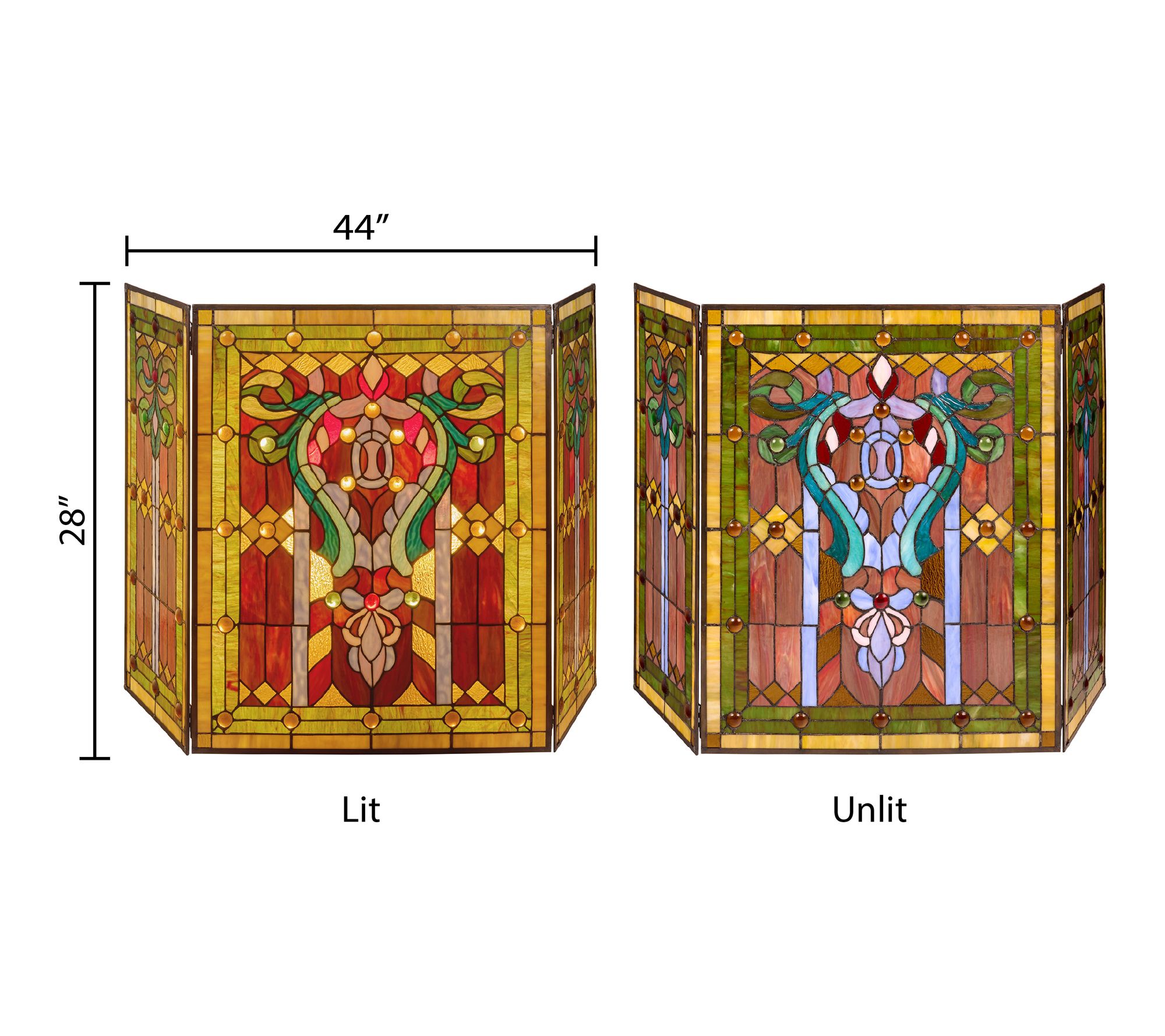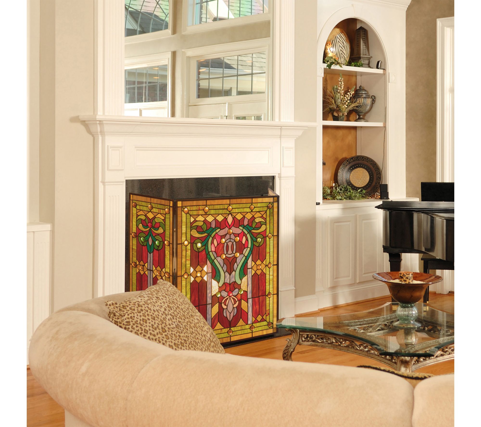 Create a warm, vivid focal point and bring timeless elegance to your living space with this stained glass fireplace screen. Rich red, green, blue, and yellow hues illuminate classic fleur de lis motifs, while 62 cabochon accents shimmer in the firelight for unforgettable ambience. From River of Goods.