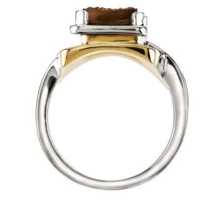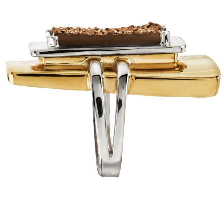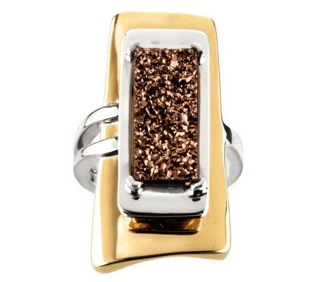 • Layered rectangular brass base; prong-style copper-brown drusy quartz gemstone; shank is split on one side; highly polished