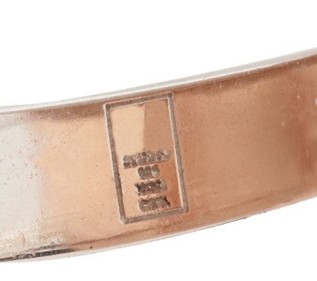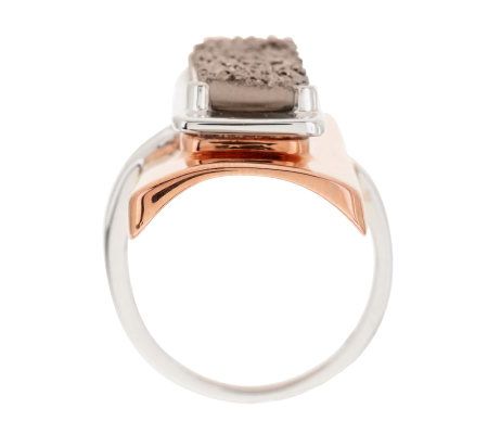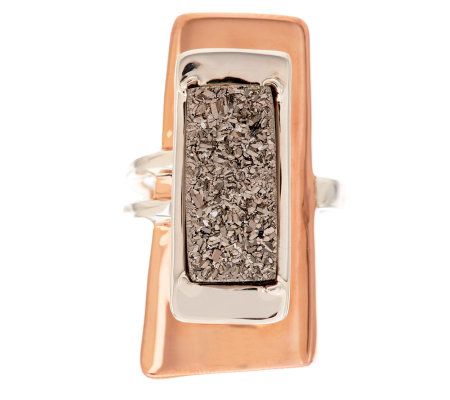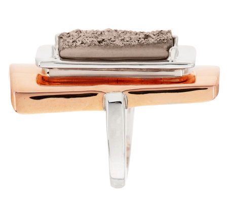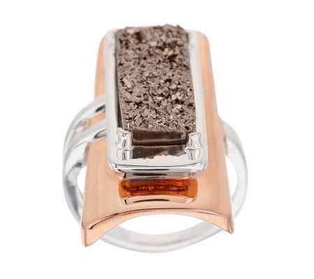 • Layered rectangular design of bronze, sterling silver, and a prong-style set platinumtone drusy quartz; sterling silver shank is split on one side; highly polished finish