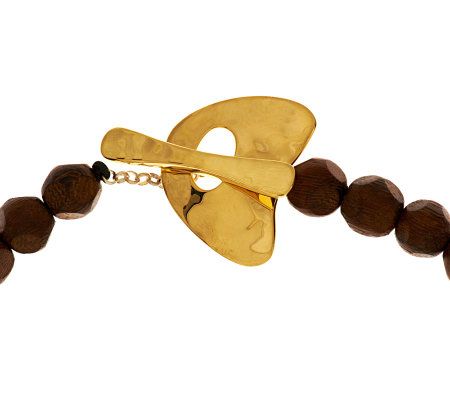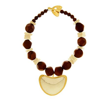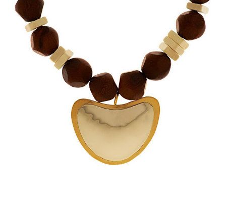 Mixed media. With a hammered, layered metal design, the enhancer at the center of this wood bead necklace gives the piece unexpected shine. It's a chic combination that offers out-of-the-ordinary style. From RLM Studio by Robert Lee Morris.
