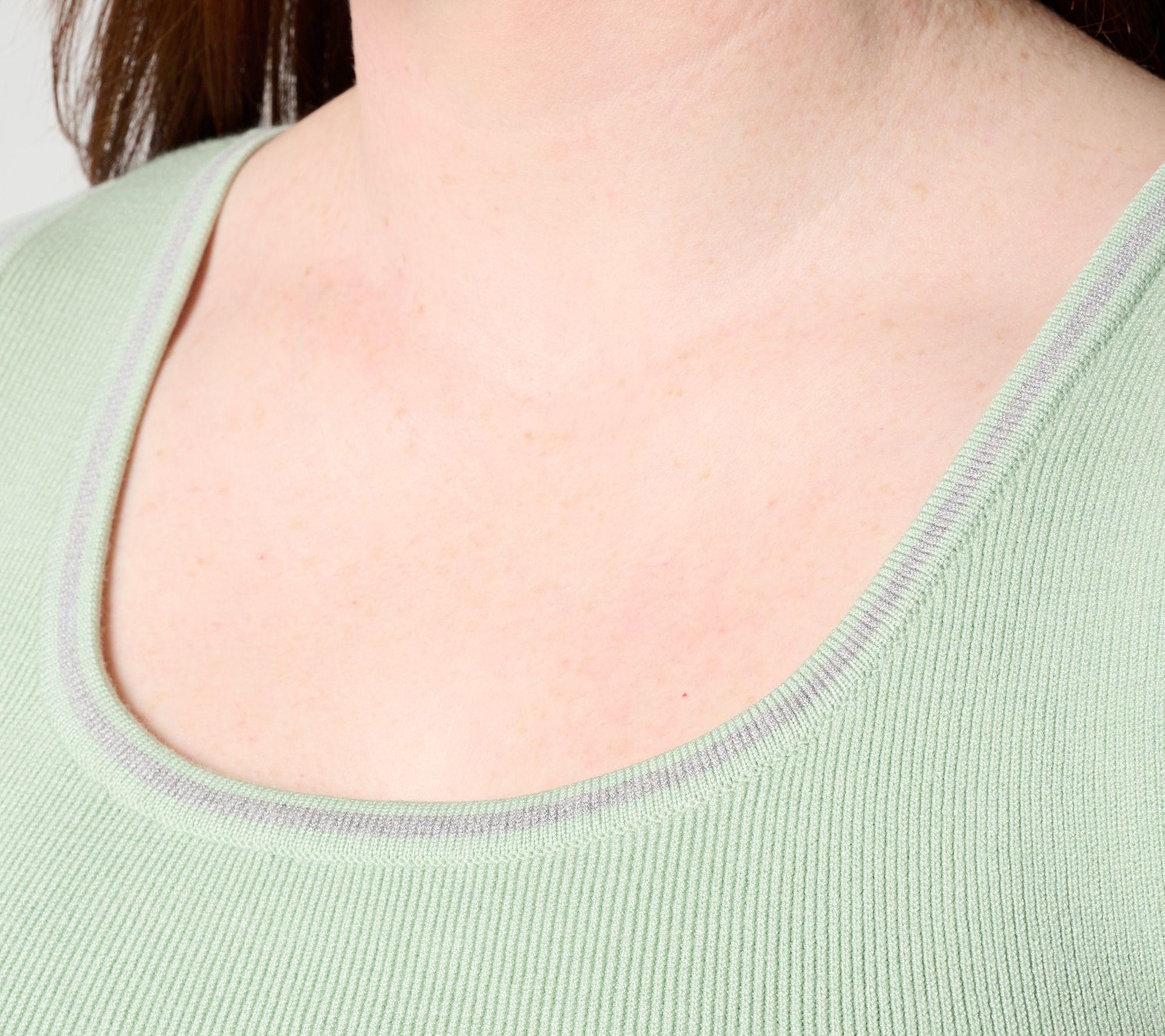Features: scoop neckline, contrast trim at neckline and arm holes