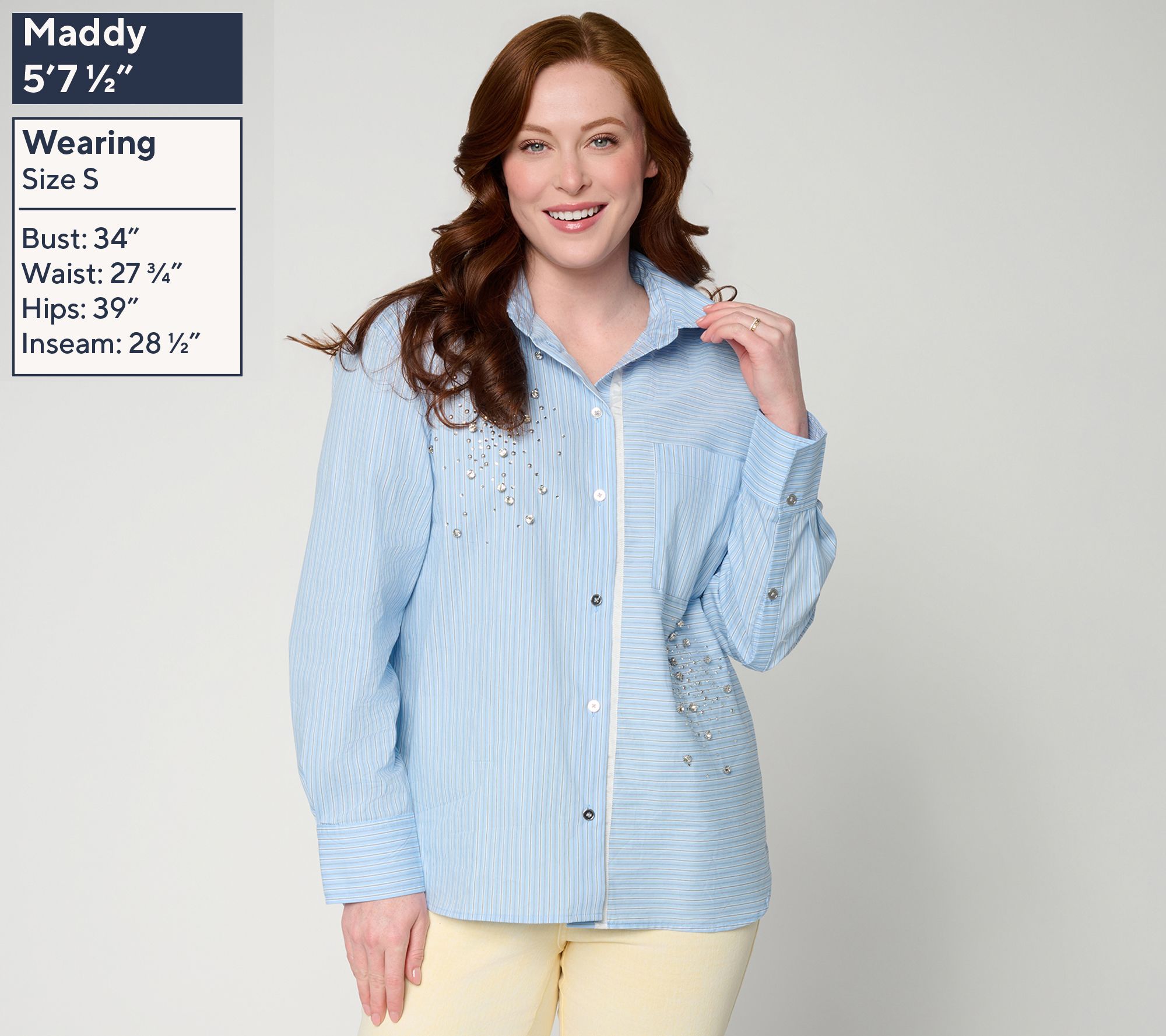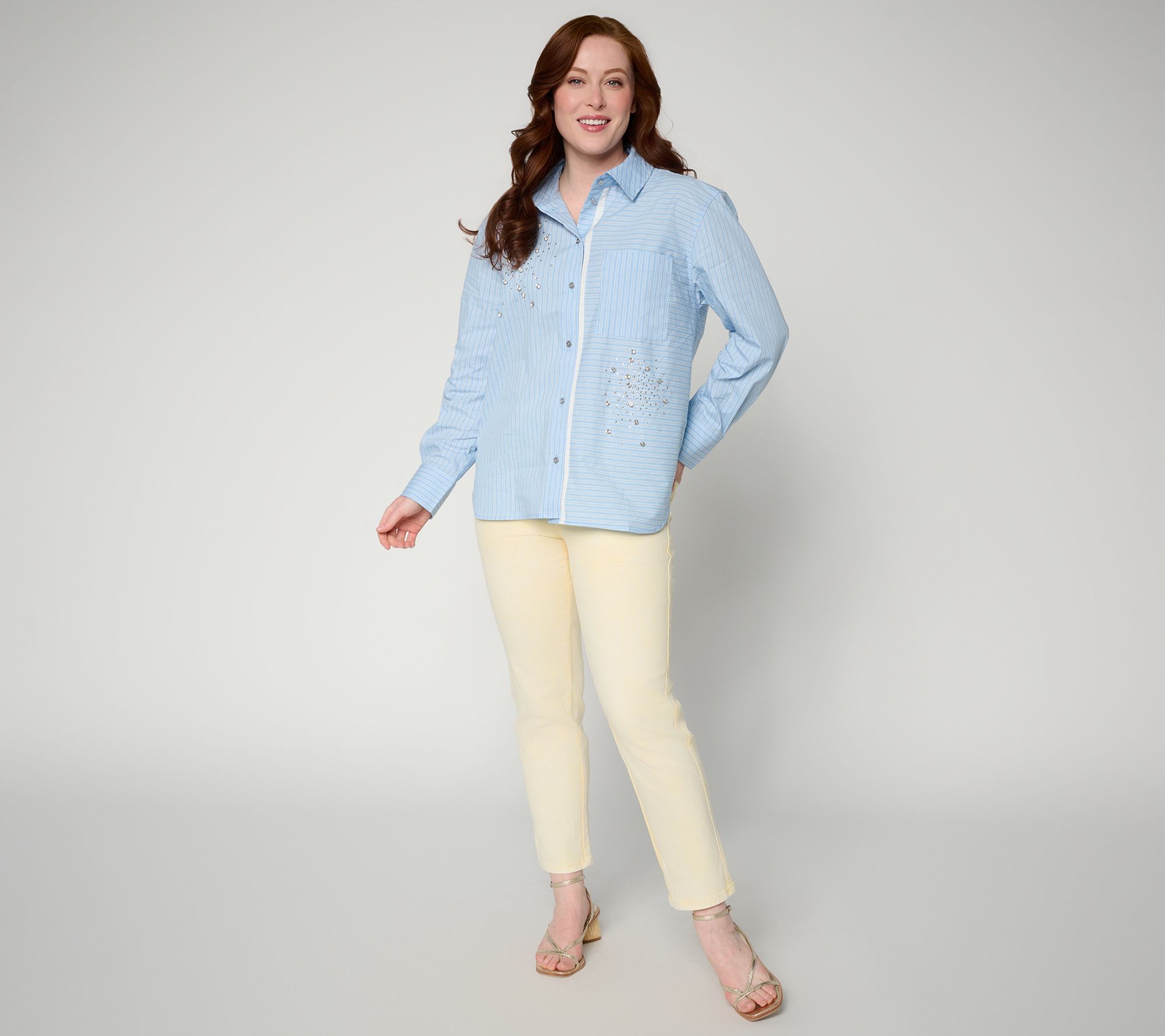 Features: self collar and stand, button-front placket with contrast detail, chest patch pocket, directional stripes, high-low shirttail hem, rhinestone detail at right chest and bottom left