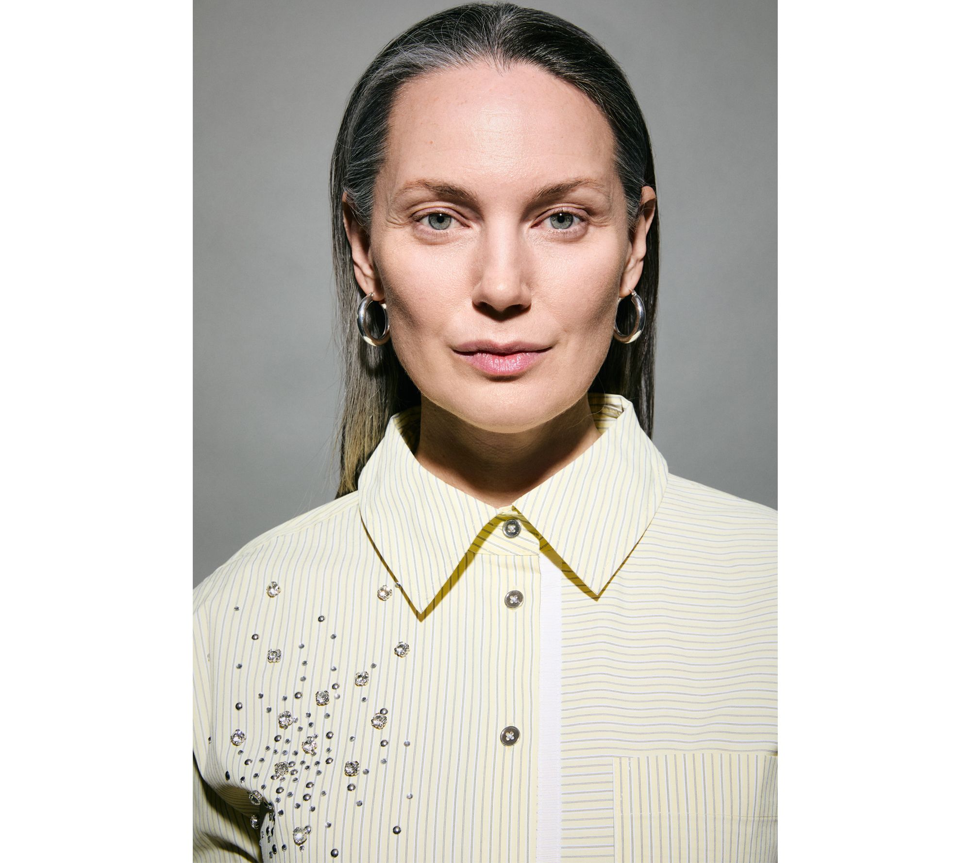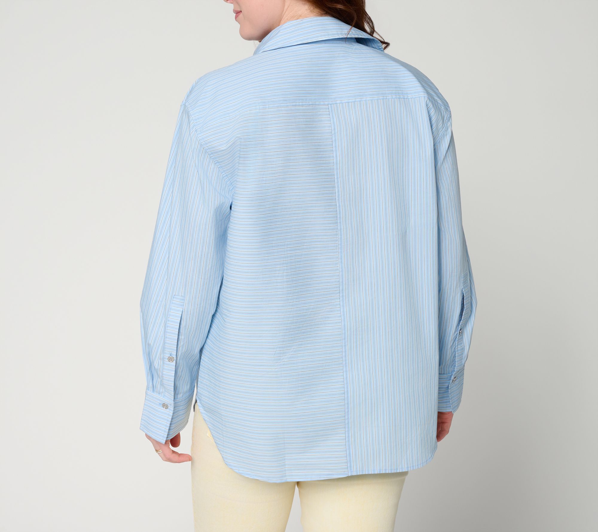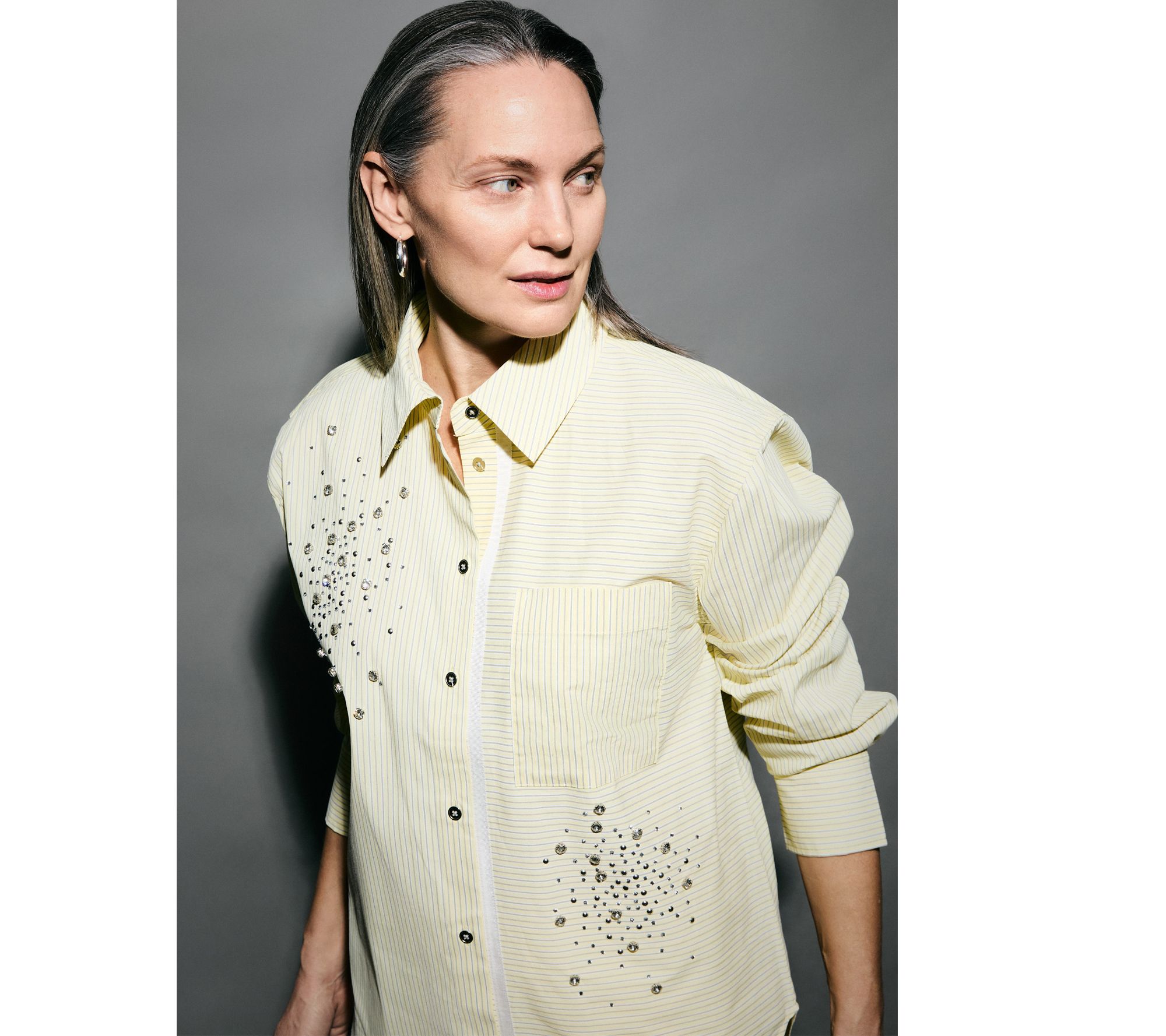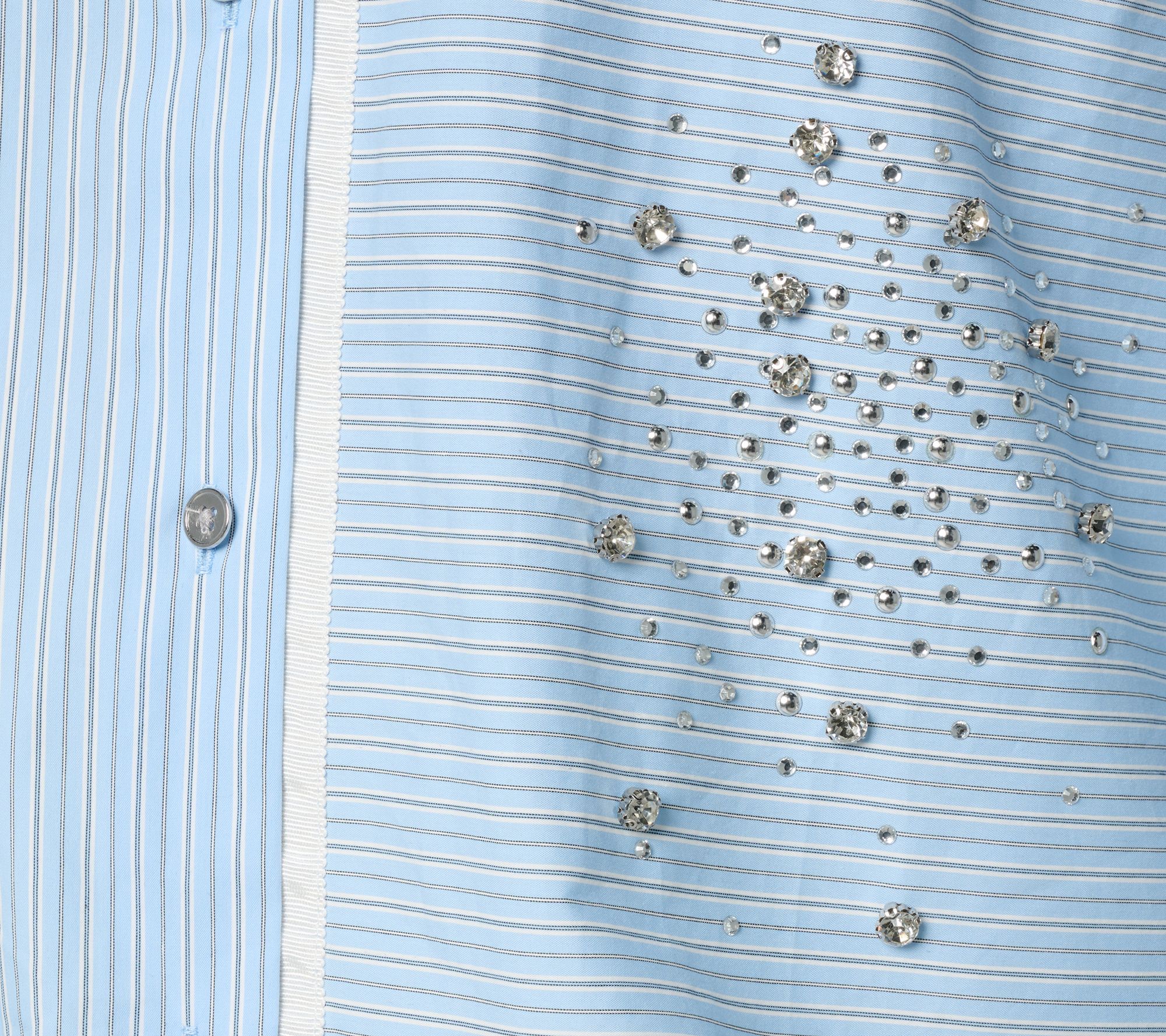 Weekend brunch or office catch-ups become just a bit more special with this woven cotton poplin shirt, designed with directional stripes and rhinestone touches for standout shine. The relaxed silhouette layers easily over tanks or under jackets, while the chest pocket and high-low hem keep things effortlessly put-together. From RM Studio x Rebecca Minkoff.