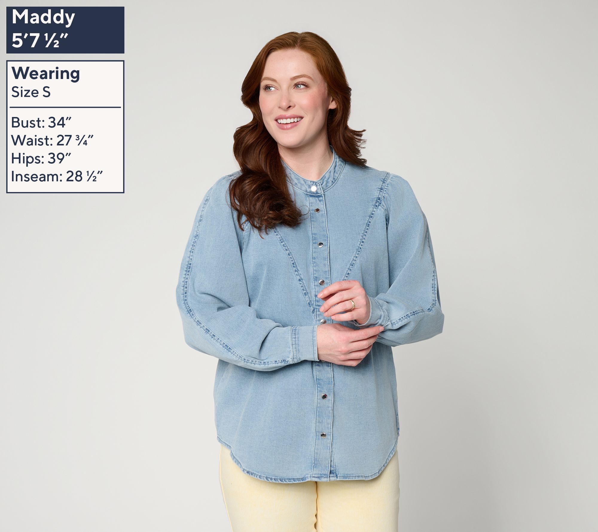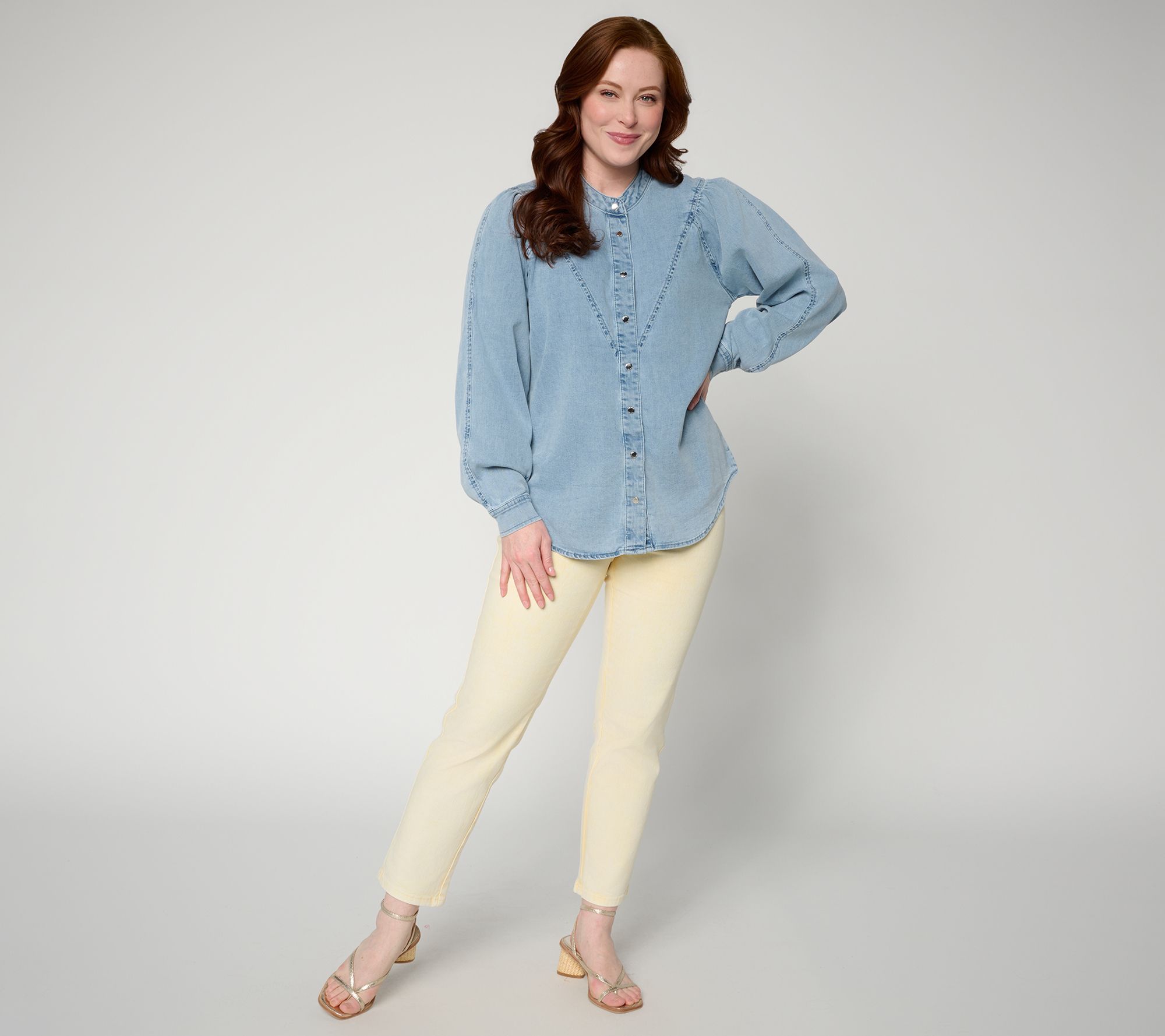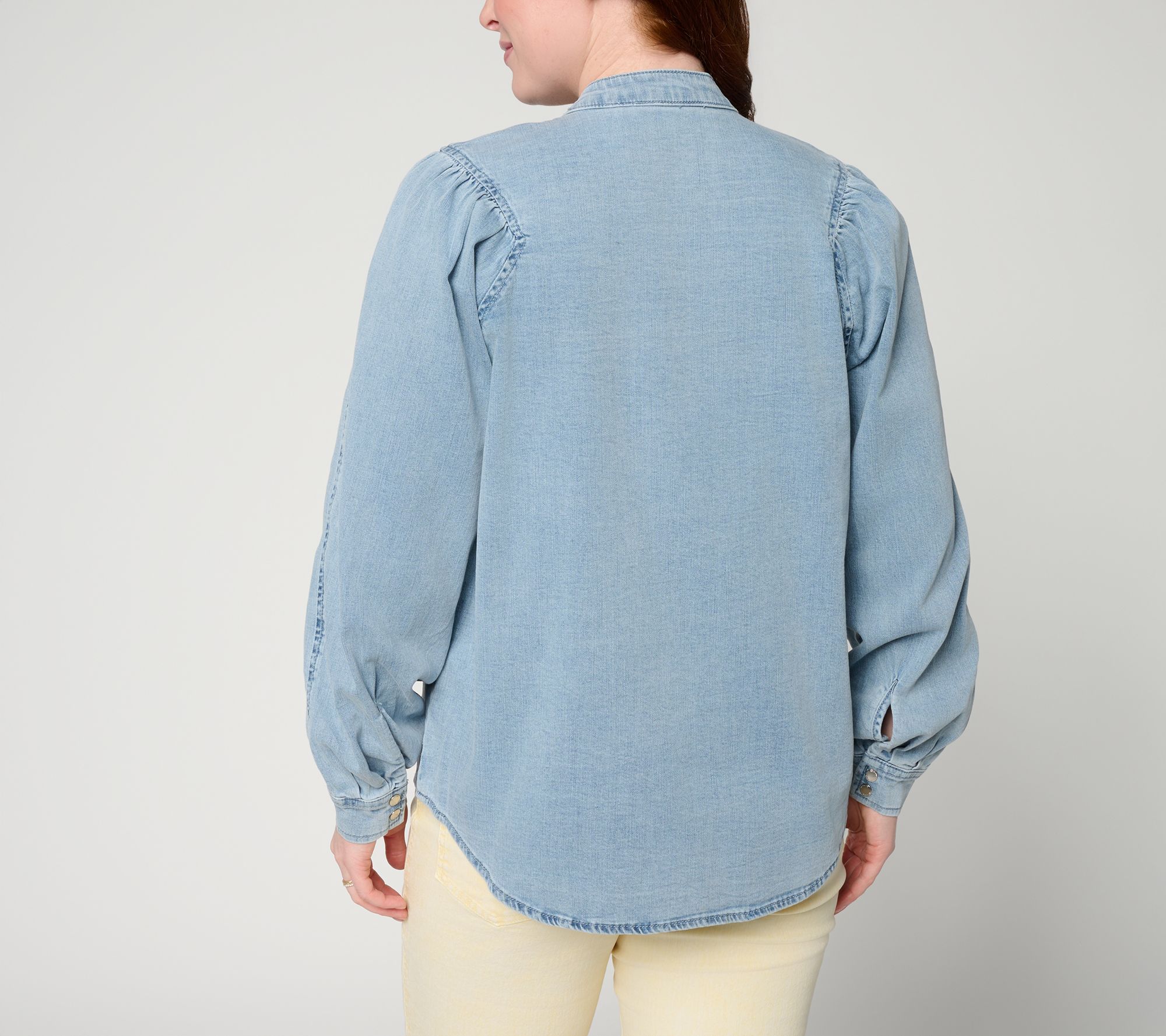 Commuting to the city, meeting friends for dinner, or relaxing during weekend errands, this stretch denim shirt pairs classic structure with effortless versatility. A mandarin collar and extended front yoke accented with topstitching give it a touch of contemporary charm, while gathered shoulders create an easygoing silhouette you can style up or down. From RM Studio x Rebecca Minkoff.