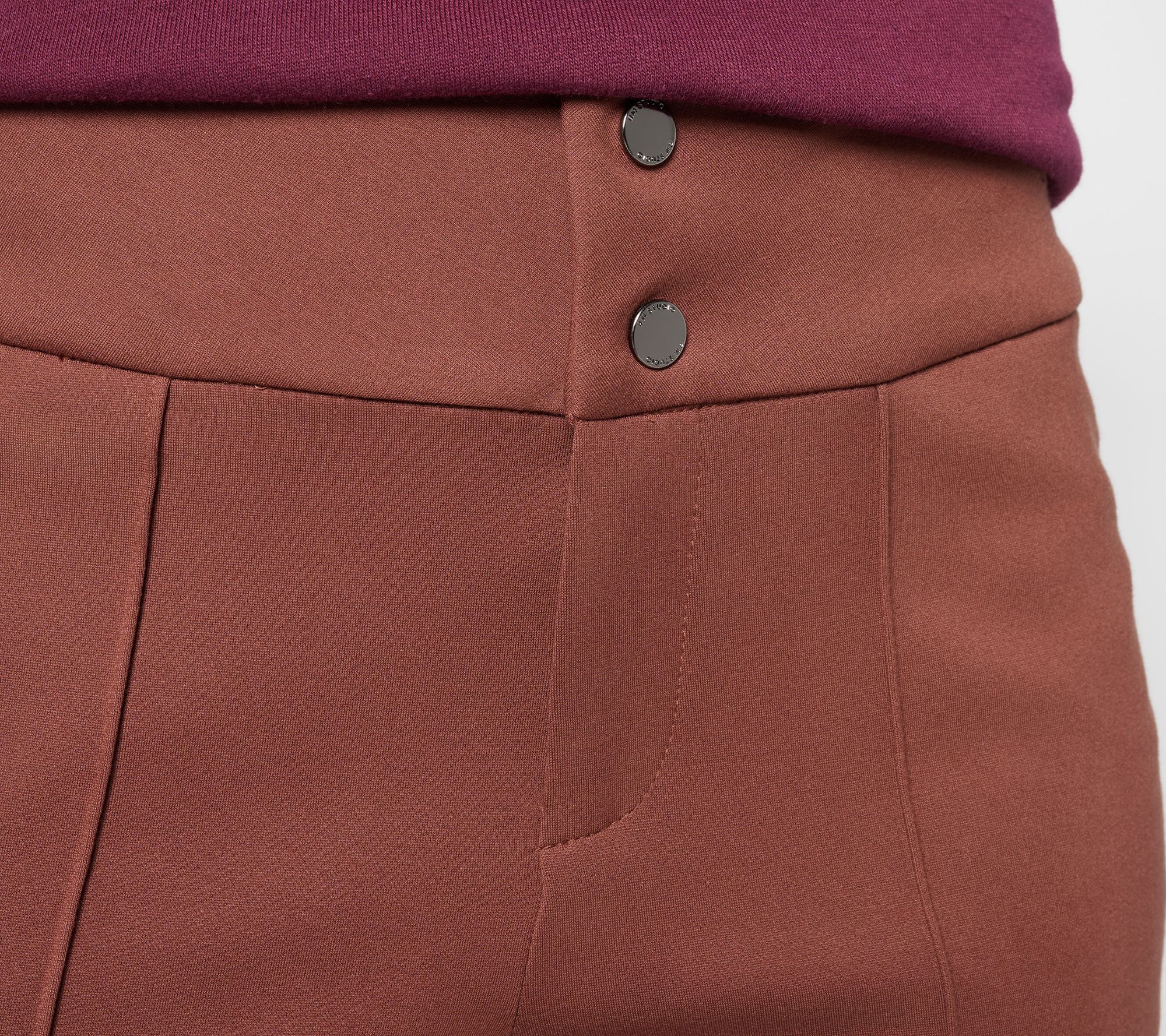 Modern femininity meets fashion functionality when it comes to Rebecca Minkoff's ponte knit pants. The look is aspirational yet totally relatable, leading with a fresh double-button closure up top and finishing with a footwear-friendly boot-cut down below. The tailored fit is office-worthy, but the rayon-rich knit is giving downtown-cool vibes, too. From RM Studio x Rebecca Minkoff.