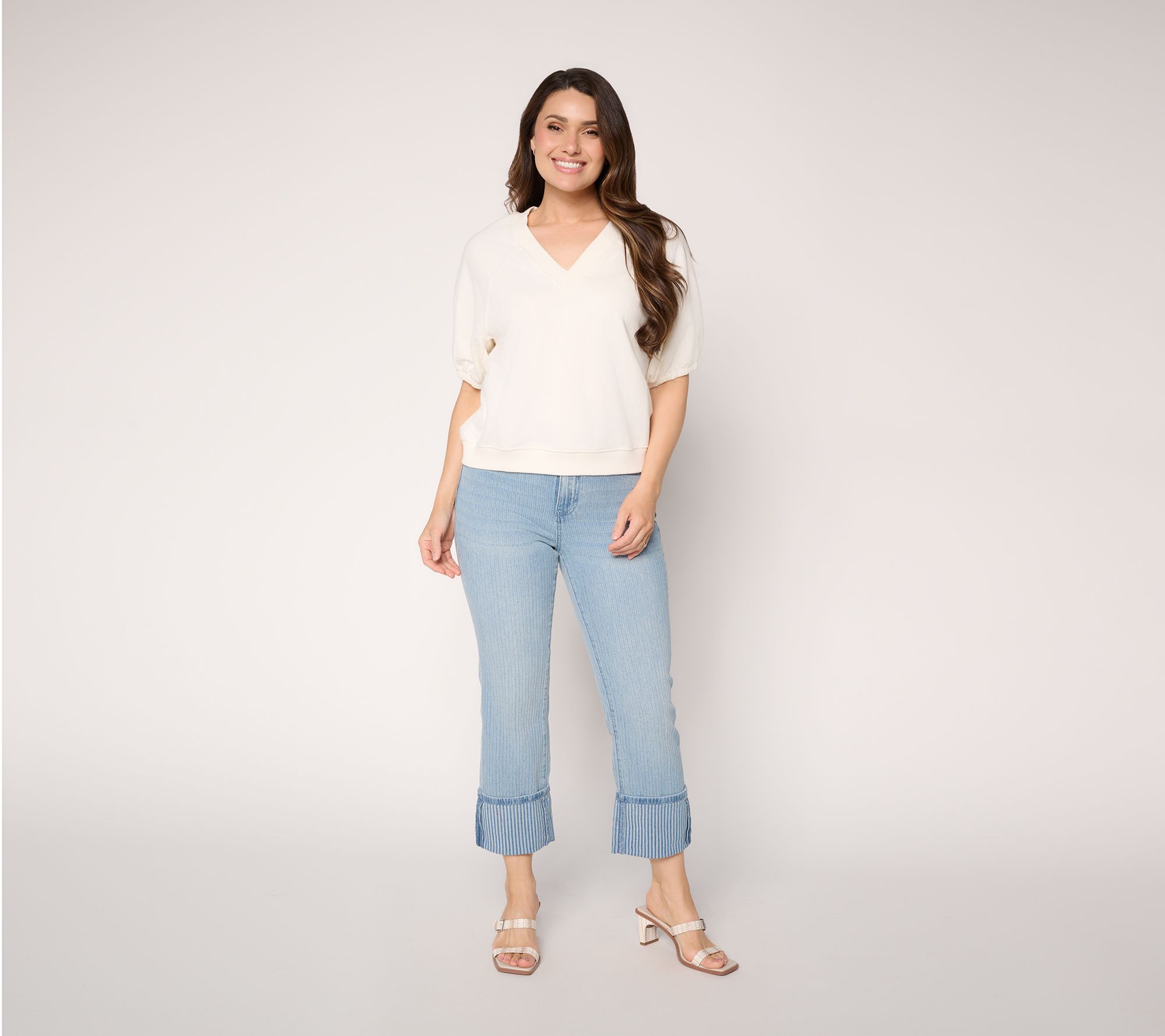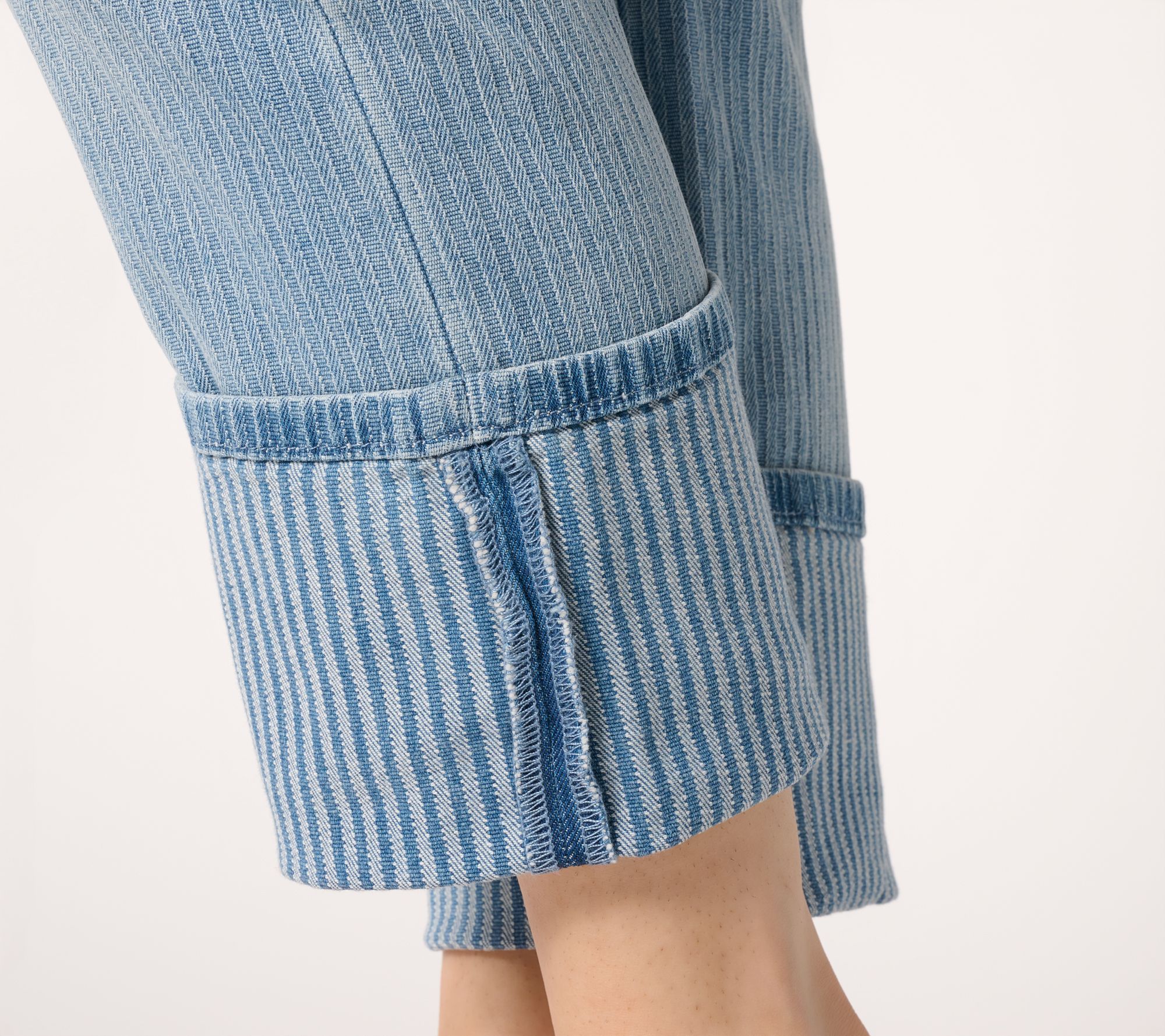 Start your morning with standout style thanks to these striped jacquard denim pants that blend classic comfort with modern flair. Wide cuffed hems and a chic allover pattern create a fresh look that pairs effortlessly with both casual tees and crisp button-downs for brunches, errands, or laid-back weekends. From RM Studio x Rebecca Minkoff.