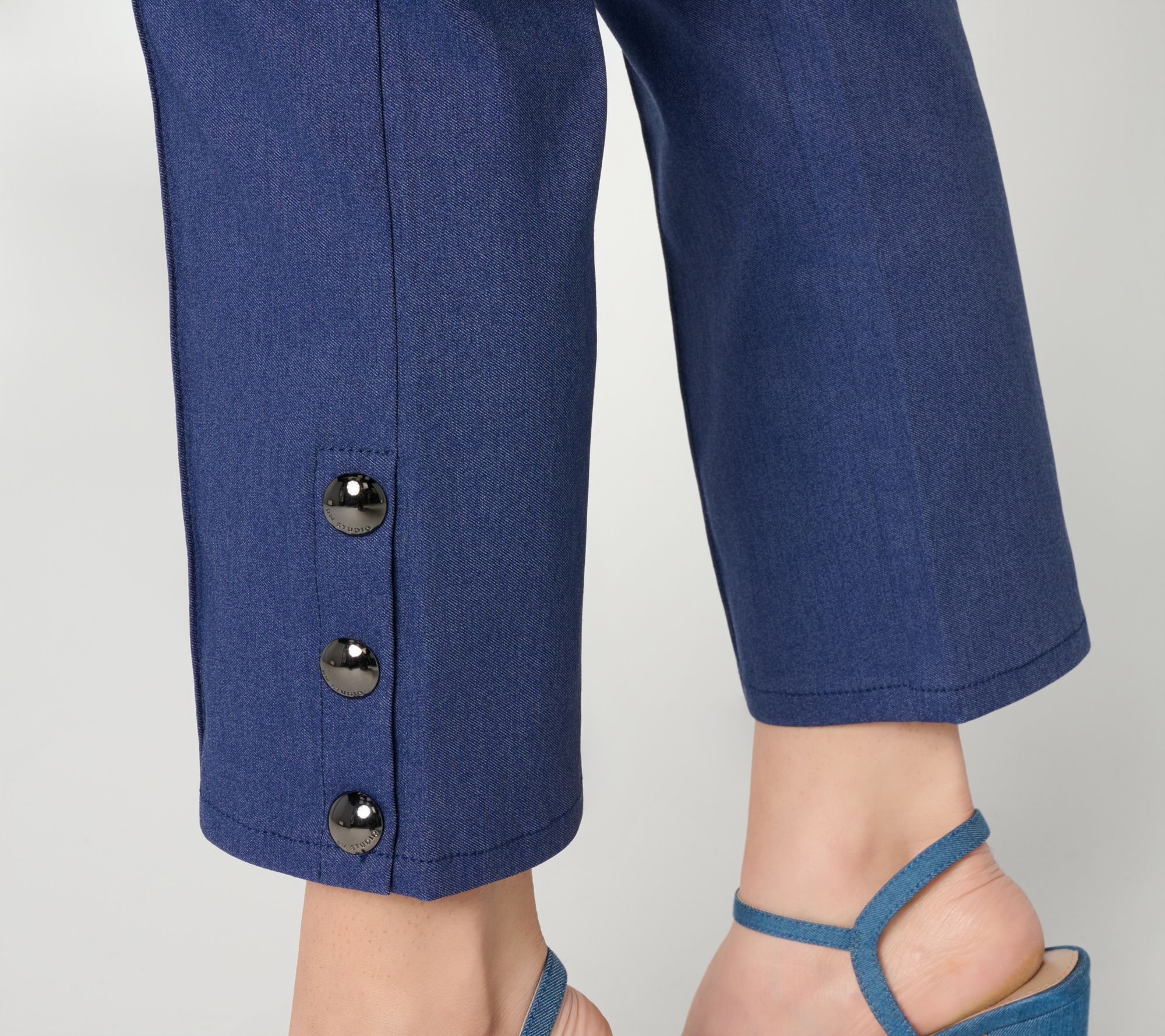 Features: cropped, clean-finished waistband, center-front leg seams, center-back waist darts, side slits with button closure