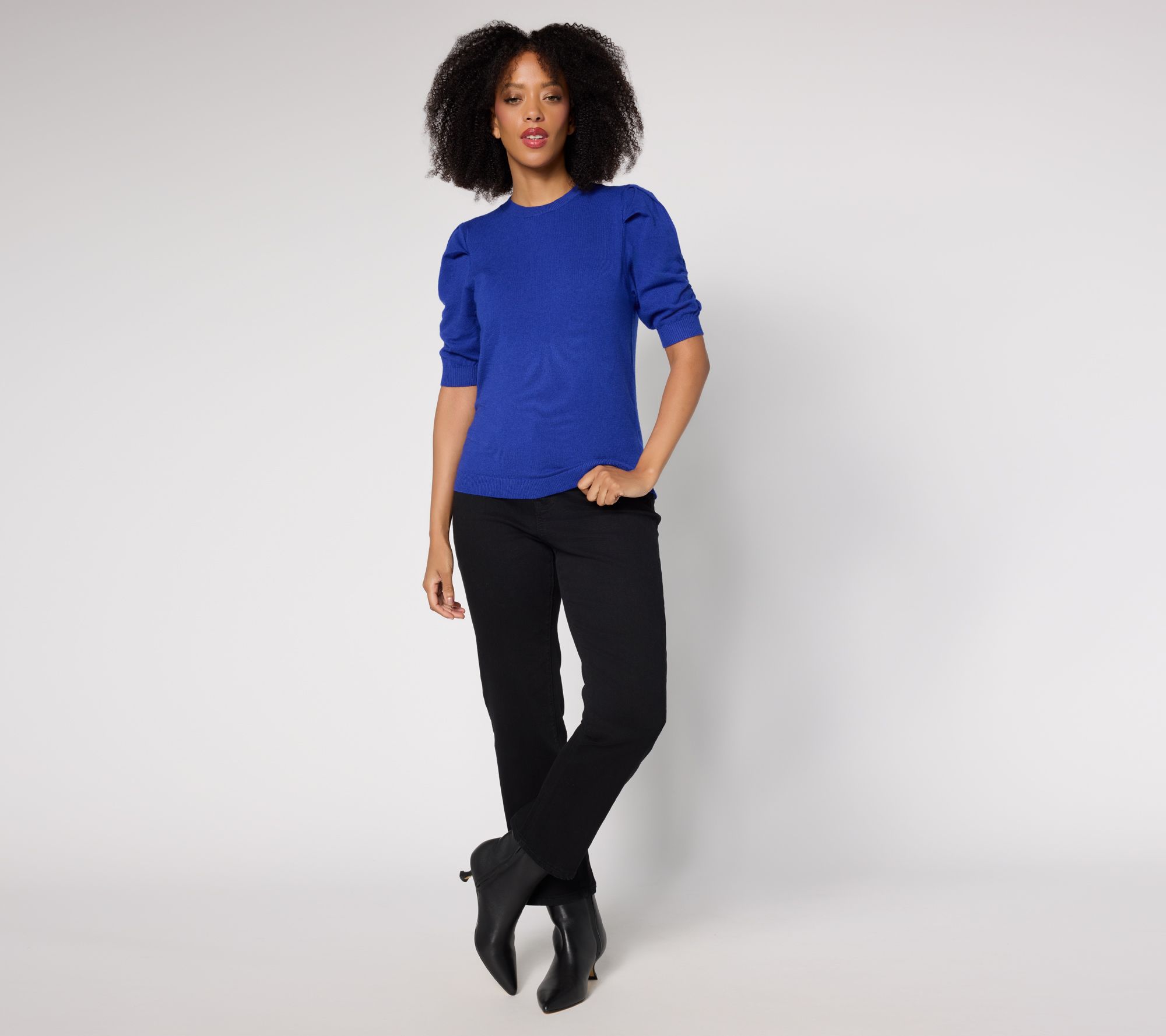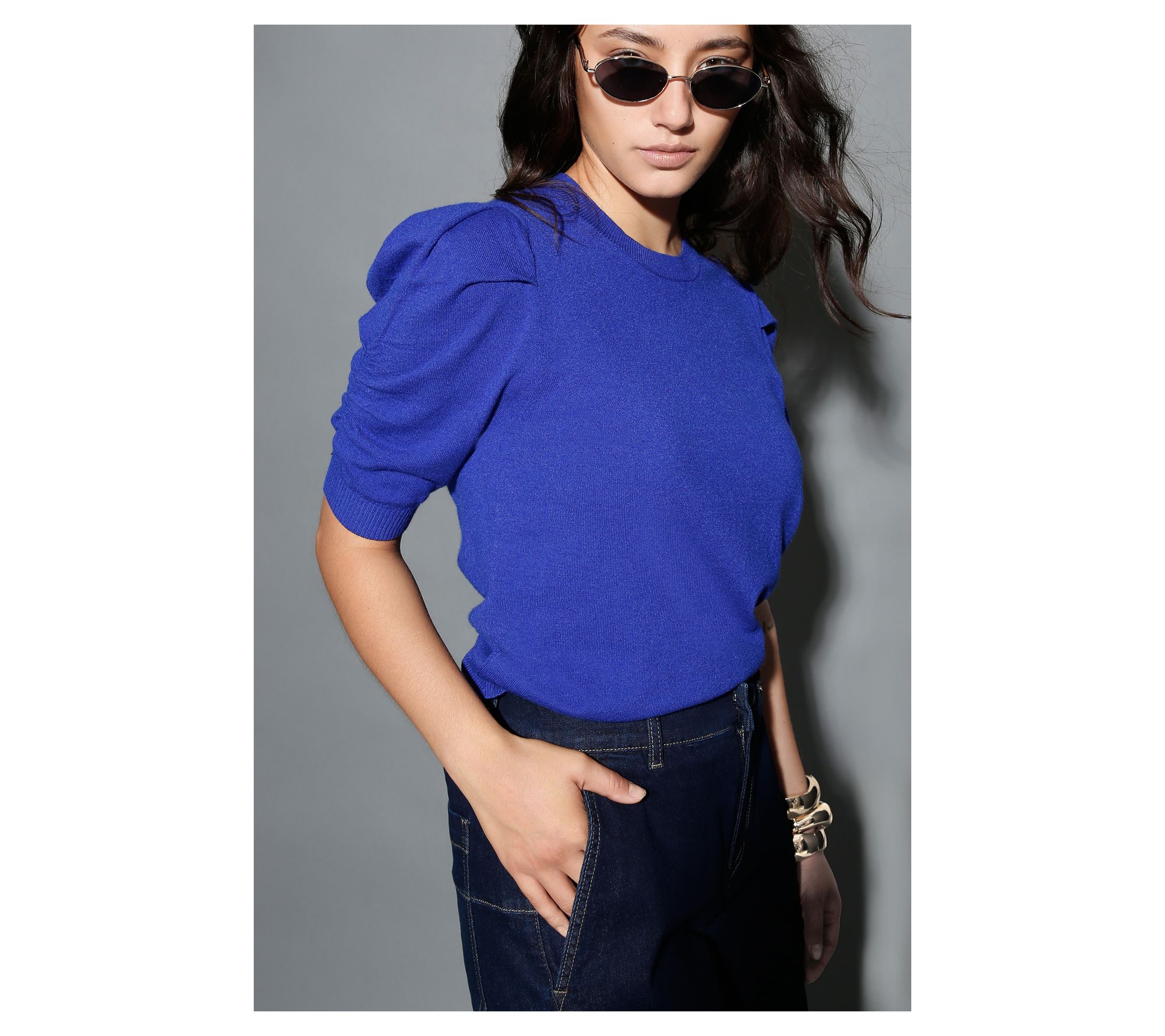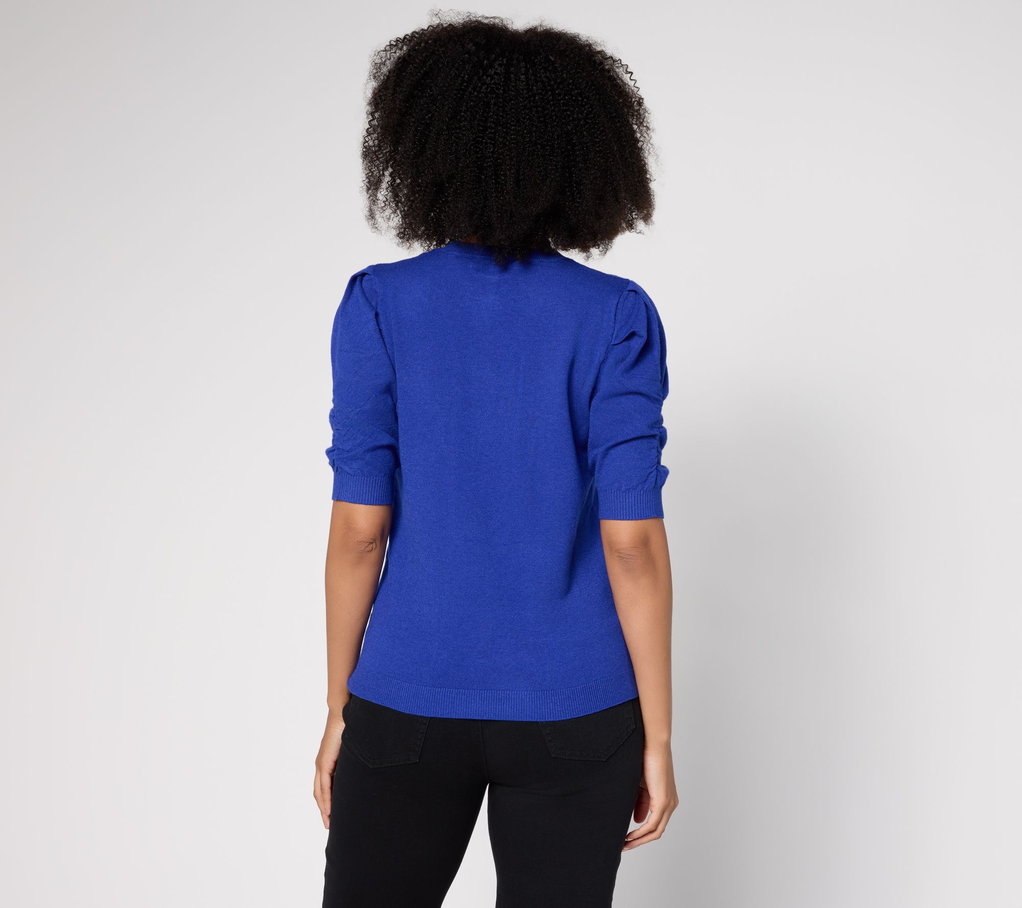 Features: elbow-length puff sleeves with ruching, ribbed sleeve cuff and bottom hem