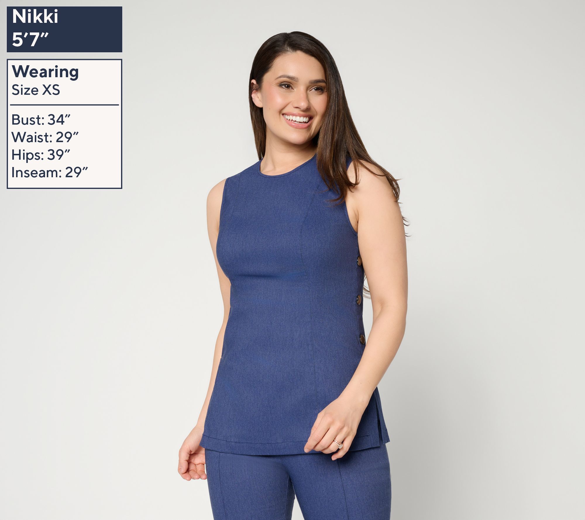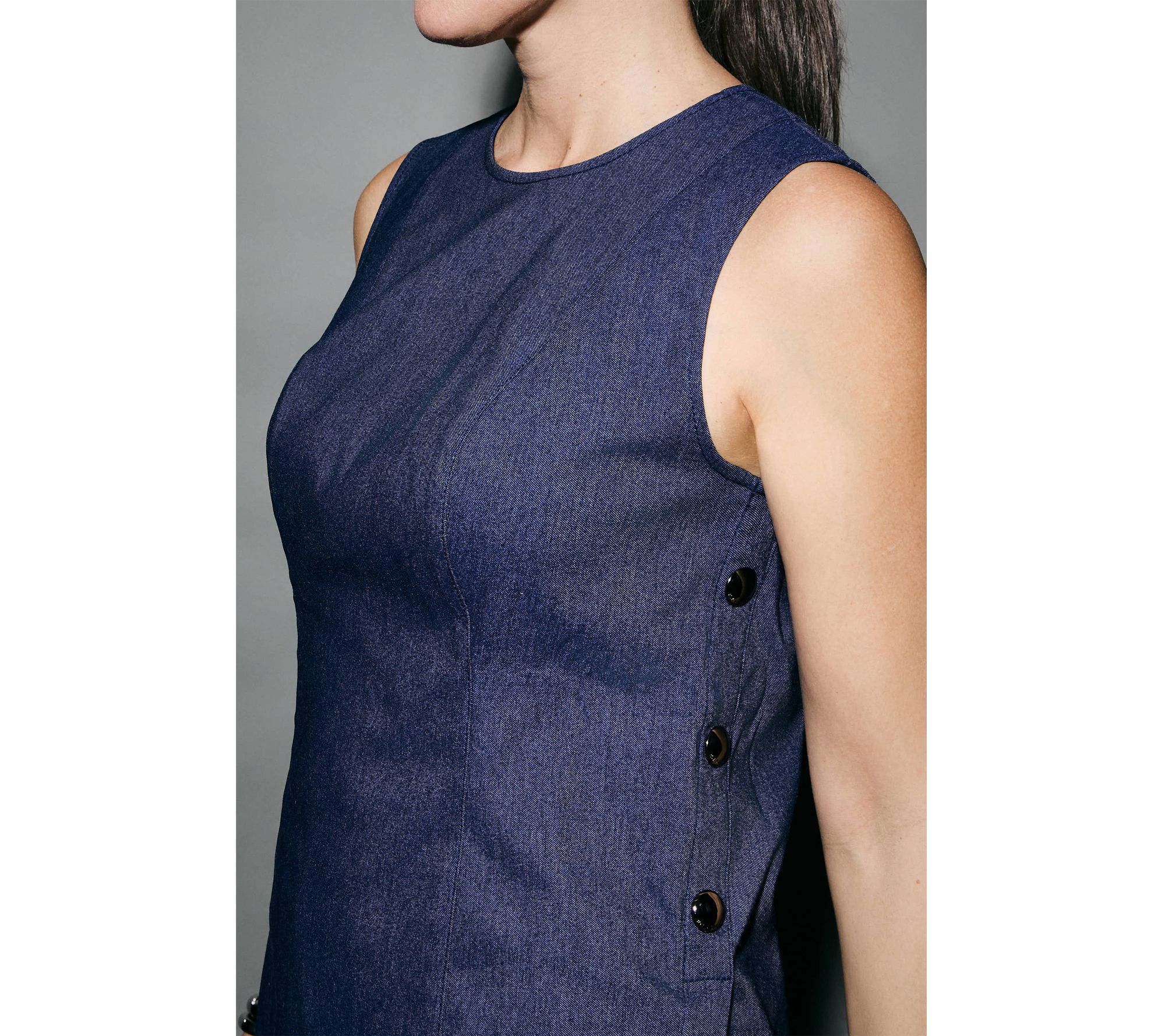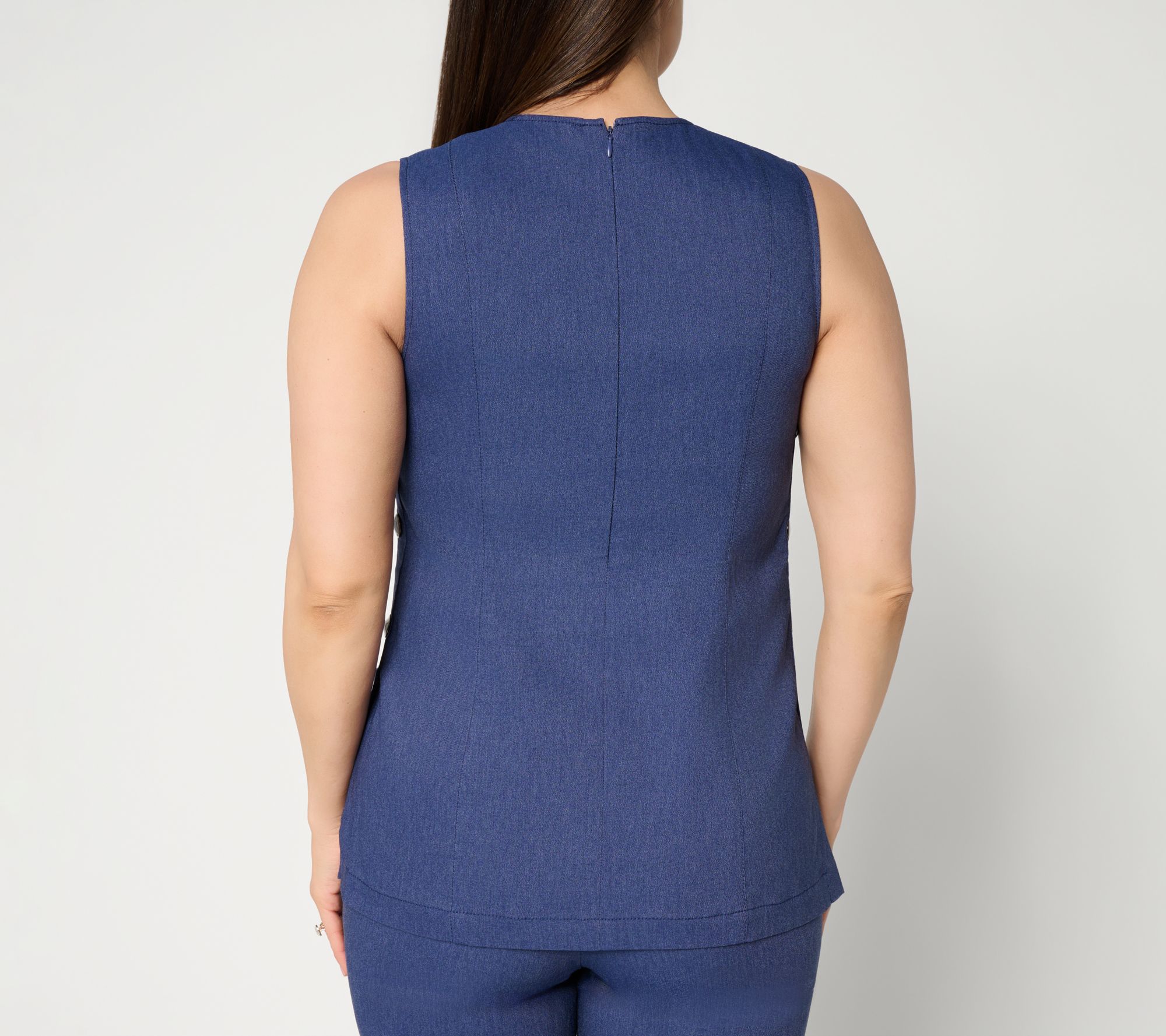 Features: sleeveless, tunic length, front and back princess seams, back zipper closure, side button detail, side slits