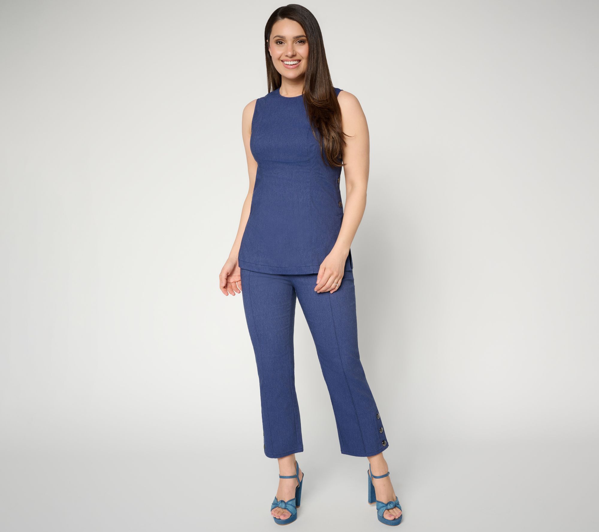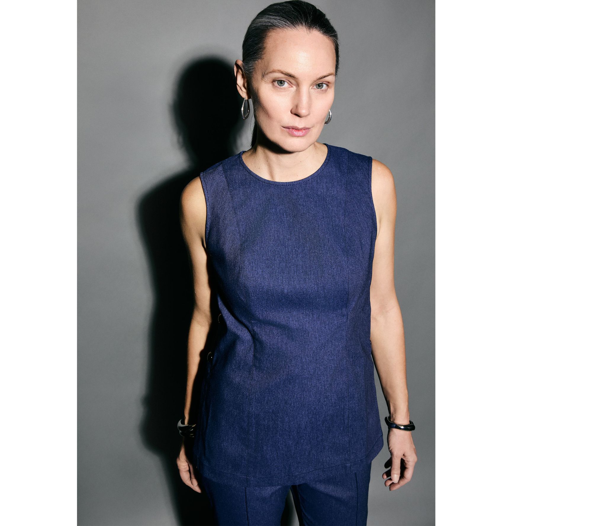 Layered with a blazer for important meetings or styled solo for weekend plans, this stretch twill sleeveless top moves with you from morning to night. Tailored princess seams lend a flattering silhouette, while the side button details and side slits bring modern flair to your day. From RM Studio x Rebecca Minkoff.