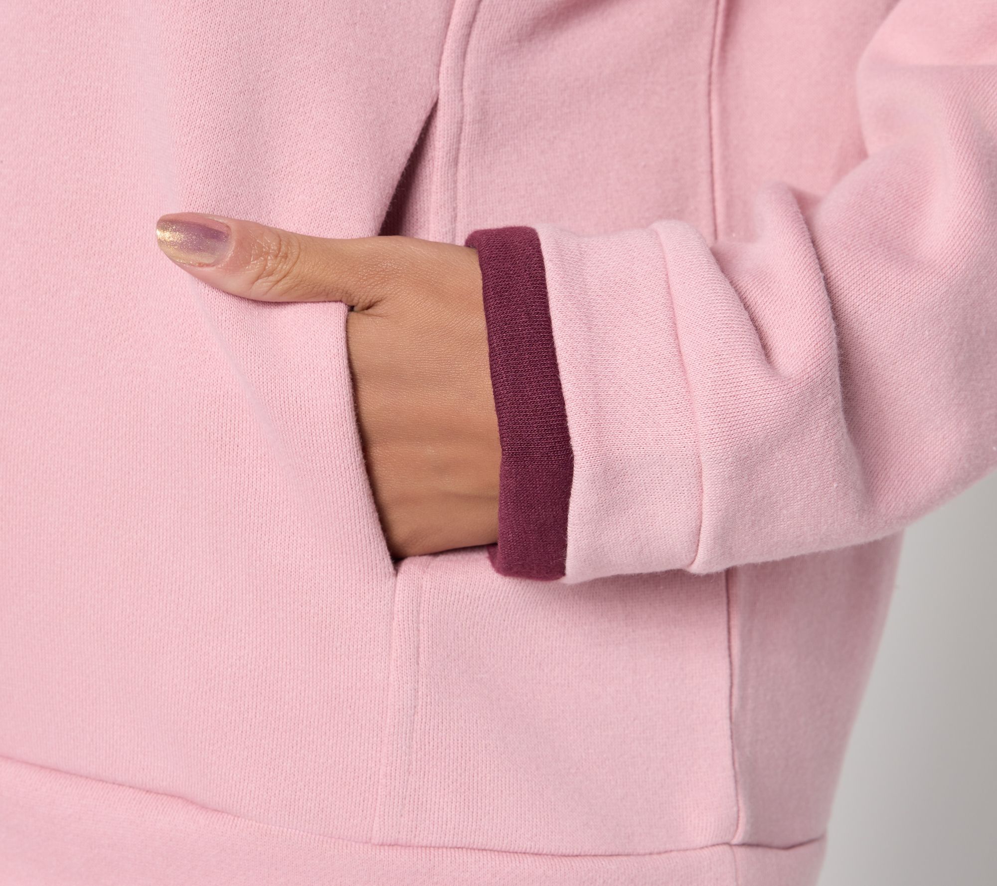 Features: V-neck, long sleeves, drop shoulder, color contrast sleeve inset, side pockets, ribbed band at hem, sleeves, and neckline