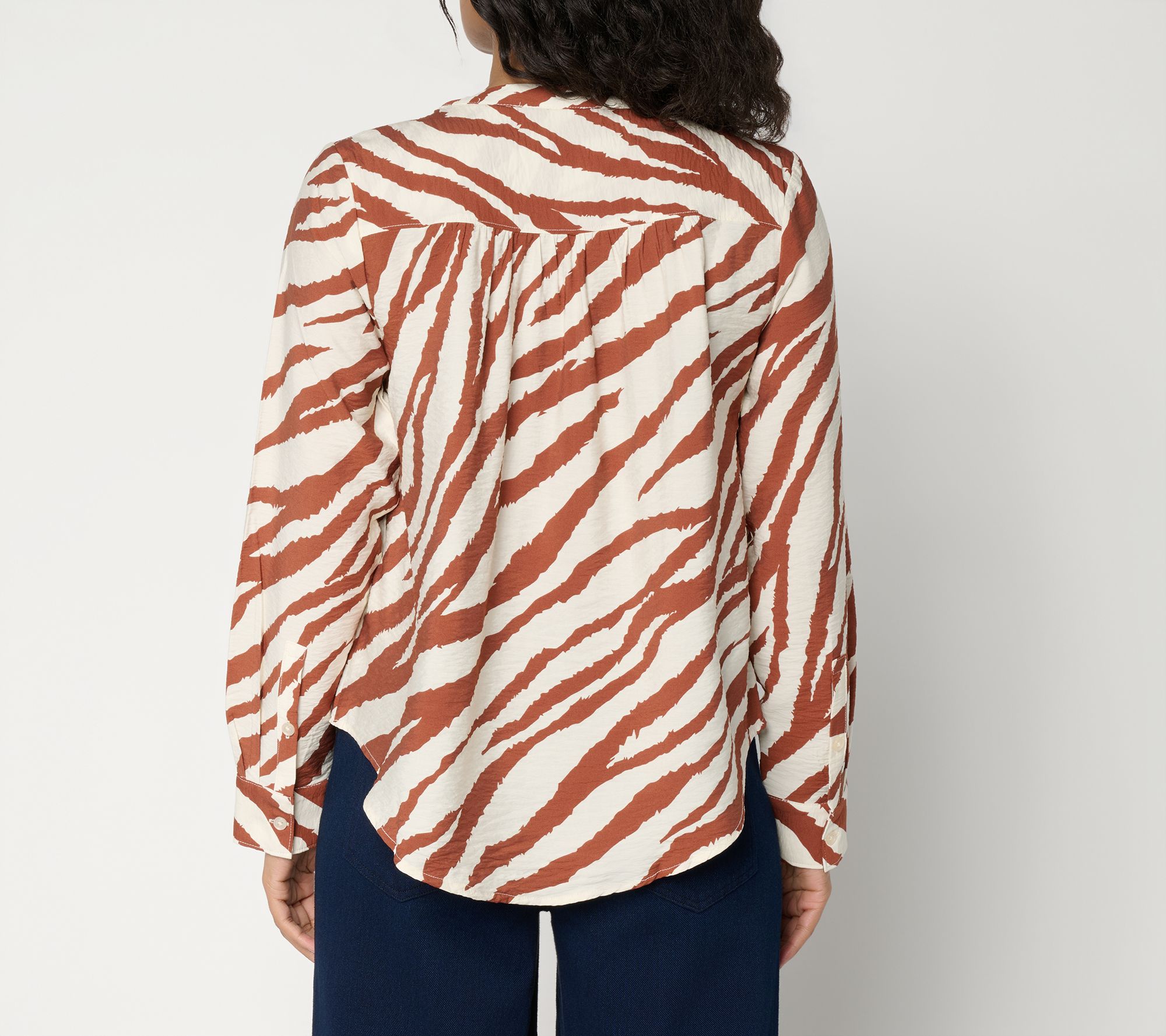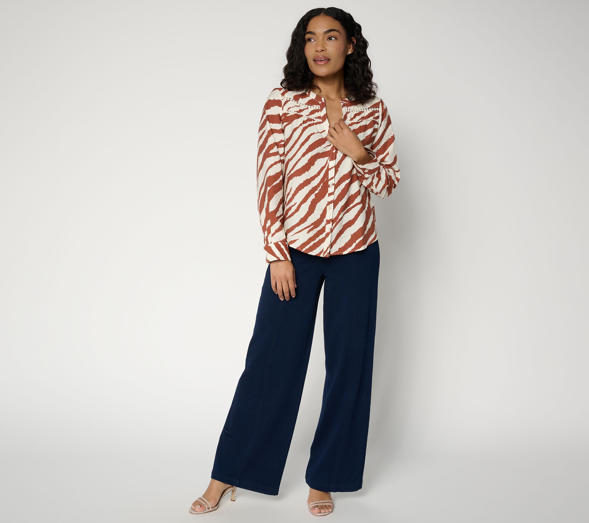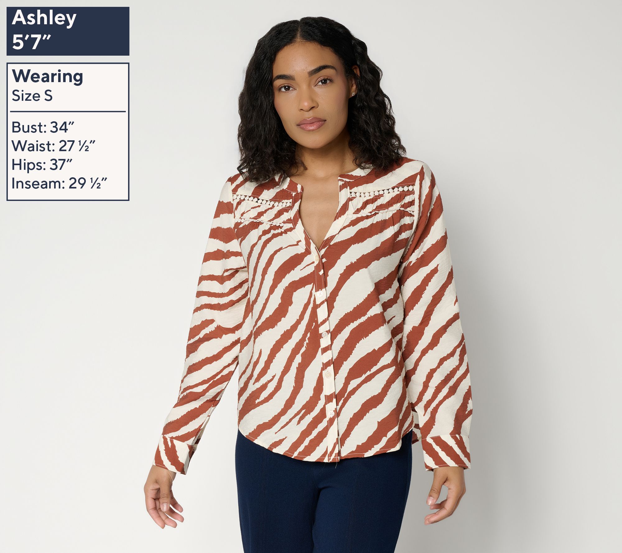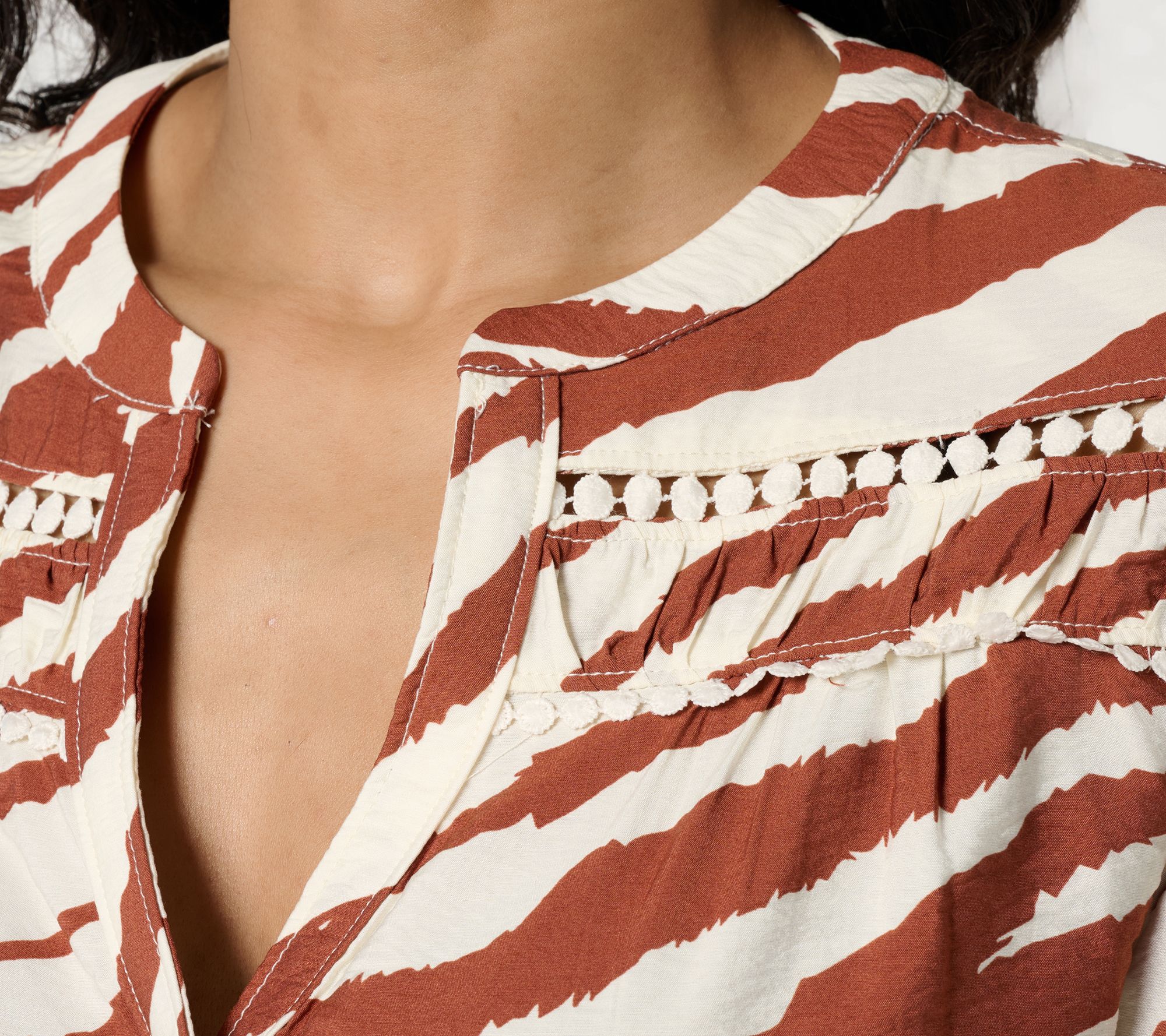 Features: Y-neckline with lace trim and shirring detail, button front, back yoke with shirring detail, curved shirttail, turnback hem