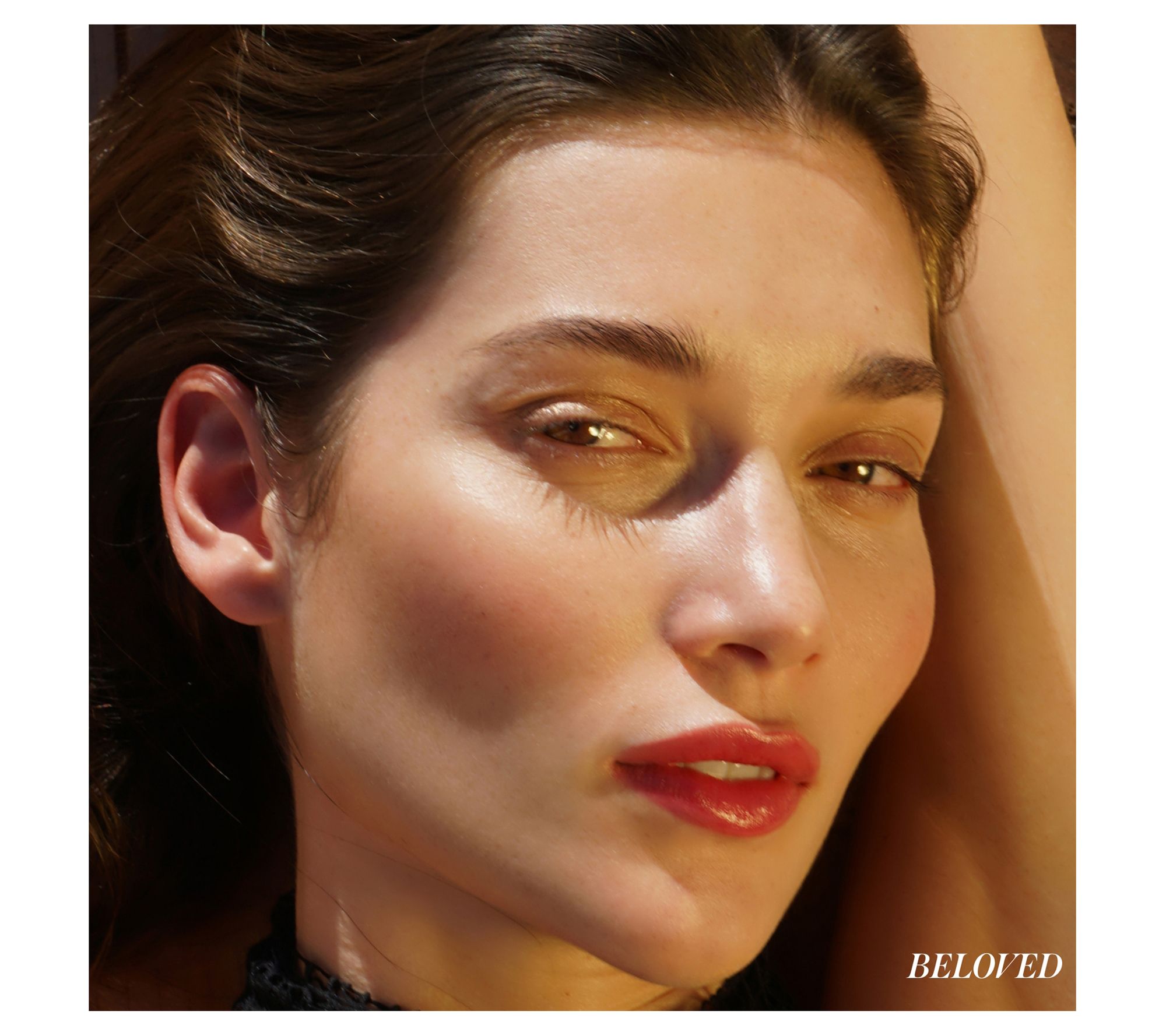 On lips: Use your ring finger to warm up a small amount before pressing it into the lips, mirroring the edge of the lips with the curve of your fingertip for a naturally